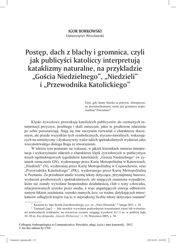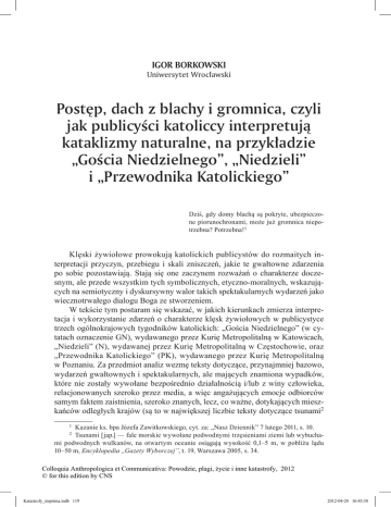 IGOR BORKOWSKI Uniwersytet Wroc³awski Postêp, dach z blachy i gromnica, czyli jak publicyœci katoliccy interpretuj¹ kataklizmy naturalne, na przyk³adzie „Goœcia Niedzielnego”, „Niedzieli” i „Przewodnika Katolickiego” Dziś, gdy domy blachą są pokryte, ubezpieczone piorunochronami, może już gromnica niepotrzebna? Potrzebna!1 Klęski żywiołowe prowokują katolickich publicystów do rozmaitych interpretacji przyczyn, przebiegu i skali zniszczeń, jakie te gwałtowne zdarzenia po sobie pozostawiają. Stają się one zaczynem rozważań o charakterze doczesnym, ale przede wszystkim tych symbolicznych, etyczno-moralnych, wskazujących na semiotyczny i dyskursywny walor takich spektakularnych wydarzeń jako wiecznotrwałego dialogu Boga ze stworzeniem. W tekście tym postaram się wskazać, w jakich kierunkach zmierza interpretacja i wykorzystanie zdarzeń o charakterze klęsk żywiołowych w publicystyce trzech ogólnokrajowych tygodników katolickich: „Gościa Niedzielnego” (w cytatach oznaczenie GN), wydawanego przez Kurię Metropolitalną w Katowicach, „Niedzieli” (N), wydawanej przez Kurię Metropolitalną w Częstochowie, oraz „Przewodnika Katolickiego” (PK), wydawanego przez Kurię Metropolitalną w Poznaniu. Za przedmiot analiz wezmę teksty dotyczące, przynajmniej bazowo, wydarzeń gwałtownych i spektakularnych, ale mających znamiona wypadków, które nie zostały wywołane bezpośrednio działalnością i/lub z winy człowieka, relacjonowanych szeroko przez media, a więc angażujących emocje odbiorców samym faktem zaistnienia, szeroko znanych, lecz, co ważne, dotykających mieszkańców odległych krajów (są to w największej liczbie teksty dotyczące tsunami2 1 Kazanie ks. bpa Józefa Zawitkowskiego, cyt. za: „Nasz Dziennik” 7 lutego 2011, s. 10. Tsunami [jap.] — fale morskie wywołane podwodnymi trzęsieniami ziemi lub wybuchami podwodnych wulkanów, na otwartym oceanie osiągają wysokość 0,1–5 m, w pobliżu lądu 10–50 m, Encyklopedia „Gazety Wyborczej”, t. 19, Warszawa 2005, s. 34. 2 Colloquia Anthropologica et Communicativa: Powodzie, plagi, życie i inne katastrofy, 2012 © for this edition by CNS Katastrofy_imprima.indb 119 2012-04-28 16:43:38 120 IGOR BORKOWSKI w rejonie Azji Południowo-Wschodniej, trzęsienia ziemi w Nowym Orleanie oraz kolejnego tsunami — w Japonii). Taki wybór jest świadomy, wydaje się bowiem, że przestrzenny dystans do opisywanych i interpretowanych wydarzeń będzie pozwalał autorom na swobodniejsze (odważniejsze) skojarzenia, oceny, wymiar argumentacyjny i stylistyczny, będą one obarczone mniejszym ryzykiem bezpośredniego dotknięcia poszkodowanych lub krewnych jakimiś radykalnymi sformułowaniami3. Przedmiotem moich rozważań będą tylko te fragmenty tekstów, w których publicyści koncentrują się na analizach o charakterze perswazyjnym, starając się poznać rzeczywiste, a więc w ich założeniu pozaprzyrodnicze przyczyny gwałtownych zjawisk naturalnych, ich przebieg i intencje, jakie kierowały Bogiem, który kataklizmy na człowieka sprowadza lub ich zaistnienie dopuszcza. Co ciekawe, w analizowanym materiale tylko wyjątkowo znajdziemy informacje o charakterze przyrodoznawczym, które mogą być dla odbiorcy źródłem wiedzy dotyczącej mechanicznych przyczyn i przebiegu takiego zjawiska, jak na przykład tsunami, trzęsienie ziemi, wybuch wulkanu. Być może dzieje się tak dlatego, że informacje tego rodzaju zamieszczane są w innych mediach, więc tu można się skoncentrować na rekonstrukcji celowościowego ich przebiegu w kontekście narracji biblijnej. Analizowane publikacje nie zawierają żadnych zachęt do organizowania lub zaangażowania się w prowadzone akcje charytatywne na rzecz poszkodowanych w katastrofach naturalnych. Jeśli takie inicjatywy się pojawiają, informuje się o nich w innych częściach omawianych czasopism. Dla publicystów bowiem także takie pomocowe zrywy serc bywają przedmiotem krytyki lub są co najmniej faktami mocno podejrzanymi. Jeśli wielość zjawisk traktuje się symbolicznie, to wydarzenia tego rzędu co kataklizmy nie są w swojej istocie ważne na powierzchni zdarzeń, ale głębiej — w dziedzinie sensów, które naprawdę reprezentują. Dziennikarze podkreślają, że aspekty, które biorą pod uwagę, gdy piszą o kataklizmach na świecie, nie są zauważane w innych mediach, że się je ignoruje, lekceważy lub po prostu przemilcza. Oni zaś starają się je zgłębić i pokazać w pełni ich wagę i znaczenia. Ksiądz Czesław Galek4 pisze: „Każdy kataklizm ma wymiar fizykalny, ekonomiczny, humanitarny, międzynarodowy, narodowy, indywidualny itp. Ma również aspekt religijny, o którym w ogóle nie mówiono przy komentowaniu skutków tsunami” (N 4, 2005). Takie działania budują wizerunek medium jako wyjątkowego, działają integracyjnie, skupiają wokół tytułu grono wiernych zwolenników, którzy między wierszami mogą odczytać sygnał, 3 Oczywiście kaznodziejstwo strachu może brać i bierze przykłady temporalnie i geograficznie najbliższe, aby wskazać, że katastrofa czy kataklizm są bezpośrednim znakiem, karą za przewiny, dowodem na gniew Boga. 4 Powołując się na poszczególnych autorów tekstów, konsekwentnie zaznaczam, czy są to osoby duchowne, czy publicyści świeccy. Wydaje się, że taka specyfikacja jest dla omawianej problematyki istotna. Colloquia Anthropologica et Communicativa: Powodzie, plagi, życie i inne katastrofy, 2012 © for this edition by CNS Katastrofy_imprima.indb 120 2012-04-28 16:43:38 Postêp, dach z blachy i gromnica 121 że tylko to konkretne medium jest nośnikiem prawdy, pojmowanej tu oczywiście jako teandryczne rozumienie głębi rzeczywistości. Postawa publicystów wpisuje się tym samym w główne przesłania katolickiej doktryny medialnej, którą Sobór Watykański II zapoczątkował dokumentem Inter mirifica, w którym czytamy, że podstawową po