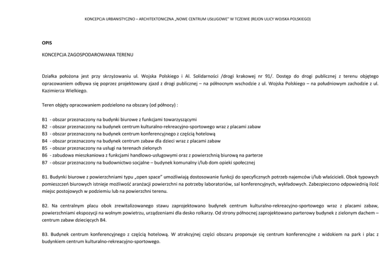 KONCEPCJA URBANISTYCZNO – ARCHITEKTONICZNA „NOWE CENTRUM USŁUGOWE” W TCZEWIE (REJON ULICY WOJSKA POLSKIEGO) OPIS KONCEPCJA ZAGOSPODAROWANIA TERENU Działka położona jest przy skrzyżowaniu ul. Wojska Polskiego i Al. Solidarności /drogi krakowej nr 91/. Dostęp do drogi publicznej z terenu objętego opracowaniem odbywa się poprzez projektowany zjazd z drogi publicznej – na północnym wschodzie z ul. Wojska Polskiego – na południowym zachodzie z ul. Kazimierza Wielkiego. Teren objęty opracowaniem podzielono na obszary (od północy) : B1 B2 B3 B4 B5 B6 B7 - obszar przeznaczony na budynki biurowe z funkcjami towarzyszącymi - obszar przeznaczony na budynek centrum kulturalno-rekreacyjno-sportowego wraz z placami zabaw - obszar przeznaczony na budynek centrum konferencyjnego z częścią hotelową - obszar przeznaczony na budynek centrum zabaw dla dzieci wraz z placami zabaw - obszar przeznaczony na usługi na terenach zielonych - zabudowa mieszkaniowa z funkcjami handlowo-usługowymi oraz z powierzchnią biurową na parterze - obszar przeznaczony na budownictwo socjalne – budynek komunalny i/lub dom opieki społecznej B1. Budynki biurowe z powierzchniami typu „open space” umożliwiają dostosowanie funkcji do specyficznych potrzeb najemców i/lub właścicieli. Obok typowych pomieszczeń biurowych istnieje możliwość aranżacji powierzchni na potrzeby laboratoriów, sal konferencyjnych, wykładowych. Zabezpieczono odpowiednią ilość miejsc postojowych w podziemiu lub na powierzchni terenu. B2. Na centralnym placu obok zrewitalizowanego stawu zaprojektowano budynek centrum kulturalno-rekreacyjno-sportowego wraz z placami zabaw, powierzchniami ekspozycji na wolnym powietrzu, urządzeniami dla desko rolkarzy. Od strony północnej zaprojektowano parterowy budynek z zielonym dachem – centrum zabaw dziecięcych B4. B3. Budynek centrum konferencyjnego z częścią hotelową. W atrakcyjnej części obszaru proponuje się centrum konferencyjne z widokiem na park i plac z budynkiem centrum kulturalno-rekreacyjno-sportowego. KONCEPCJA URBANISTYCZNO – ARCHITEKTONICZNA „NOWE CENTRUM USŁUGOWE” W TCZEWIE (REJON ULICY WOJSKA POLSKIEGO) B5. Park z lodowiskiem, placami gier, kortami tenisowymi oraz ścieżkami rowerowymi wzbogaca pełni również funkcję zieleni izolacyjnej ograniczającej hałas i zanieczyszczenia z drogi krajowej. B6. W trosce o zabezpieczenie zaplecza mieszkaniowego dla potencjalnych pracowników biurowców planujących stały lub czasowy pobyt w Tczewie proponuje się przeznaczyć część kondygnacji na funkcje mieszkalne. Partery budynków przeznaczone na małe sklepiki, punkty usługowe, lokale gastronomiczne. Takie rozwiązanie pozwoli uniknąć typowego dla dzielnic np. finansowych wymierania dzielnicy po godzinach pracy. Komunikacja samochodowa. Obydwa zjazdy połączono dwupasmową drogą wewnętrzną, wzdłuż której zaprojektowano ciągi piesze. W centralnej części działki droga wewnętrzna przebiega poniżej poziomu terenu, na którym urządzono duży plac. Zlokalizowano tam również część miejsc postojowych. Ciągi piesze i pieszo-jezdne. Na 2 hektarach urządzono plac i tereny zielone z placami zabaw, skateparkiem, ściankami wspinaczkowymi , małą architekturą (ławki, pergole, fontanny) zmodernizowano staw oraz zaprojektowano budynek pełniący funkcje centrum kulturalno-rozrywkowo-sportowego. Od południa z placem sąsiaduje budynek centrum konferencyjno-hotelowego i park z obiektami otwartymi jak lodowisko (w sezonie letnim wykorzystywane przez łyżworolkarzy), korty tenisowe, boiska do siatkówki, koszykówki, itp. Od strony skrzyżowania projektuje się budowę amfiteatru – pełniącego również funkcję „ekranu” akustycznego dla terenu parku. Ścieżki rowerowe. Przewiduje się dostosowanie całego terenu dla potrzeb rowerzystów – korzystających z roweru jako środka komunikacji nie tylko rekreacyjnego. Wytyczone ścieżki rowerowe, wypożyczalnia sprzętu sportowego i stojaki na rowery mają służyć ekologicznemu trybowi życia korzystających z terenu mieszkańców miasta i pracowników instytucji i/lub firm, których siedziby zlokalizowano na powojskowym terenie. Niezależnie od układu komunikacji wewnętrznej – planuje się drogę „tranzytową” od południowej strony terenu objętego opracowaniem. Zieleń. W miarę możliwości przewiduje się zachowanie istniejącej zieleni wysokiej – jako uzupełnienie projektowanej kompozycji zieleni towarzyszącej nowej zabudowie. Proponuje się wykonanie nasadzeń szlachetnych odmian drzew – tworząc park dendrologiczny ze ścieżką edukacyjną. Wzdłuż ciągów pieszych trawniki, klomby, rabaty. Od strony drogi krajowej proponuje się pas zieleni izolacyjnej. Ukształtowanie terenu. Teren planuje się zniwelować w celu dostosowania do proponowanych funkcji. Masy ziemne wybrane pod budowę budynków i dróg zostaną rozplantowane na terenie objętym niniejszym opracowaniem.