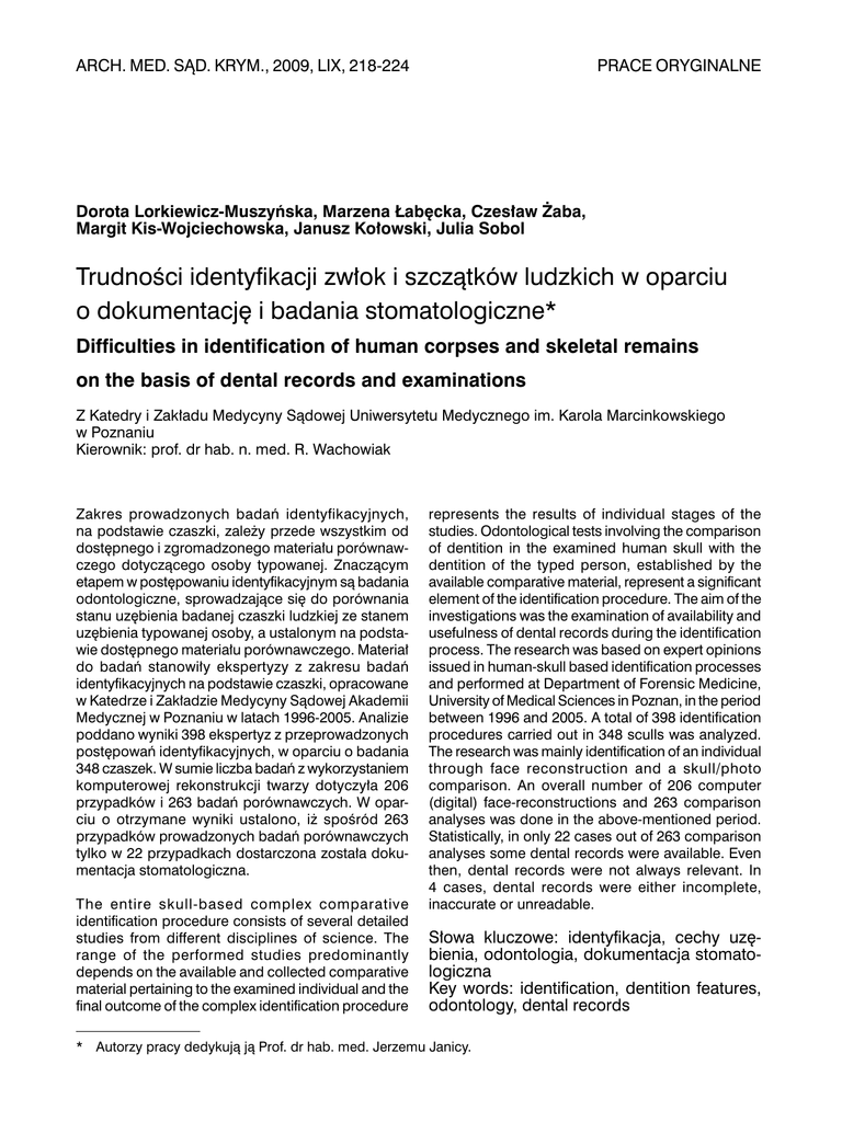 ARCH. MED. SĄD. KRYM., 2009, LIX, 218-224 PRACE ORYGINALNE Dorota Lorkiewicz-Muszyńska, Marzena Łabęcka, Czesław Żaba, Margit Kis-Wojciechowska, Janusz Kołowski, Julia Sobol Trudności identyfikacji zwłok i szczątków ludzkich w oparciu o dokumentację i badania stomatologiczne* Difficulties in identification of human corpses and skeletal remains on the basis of dental records and examinations Z Katedry i Zakładu Medycyny Sądowej Uniwersytetu Medycznego im. Karola Marcinkowskiego w Poznaniu Kierownik: prof. dr hab. n. med. R. Wachowiak Zakres prowadzonych badań identyfikacyjnych, na podstawie czaszki, zależy przede wszystkim od dostępnego i zgromadzonego materiału porównawczego dotyczącego osoby typowanej. Znaczącym etapem w postępowaniu identyfikacyjnym są badania odontologiczne, sprowadzające się do porównania stanu uzębienia badanej czaszki ludzkiej ze stanem uzębienia typowanej osoby, a ustalonym na podstawie dostępnego materiału porównawczego. Materiał do badań stanowiły ekspertyzy z zakresu badań identyfikacyjnych na podstawie czaszki, opracowane w Katedrze i Zakładzie Medycyny Sądowej Akademii Medycznej w Poznaniu w latach 1996-2005. Analizie poddano wyniki 398 ekspertyz z przeprowadzonych postępowań identyfikacyjnych, w oparciu o badania 348 czaszek. W sumie liczba badań z wykorzystaniem komputerowej rekonstrukcji twarzy dotyczyła 206 przypadków i 263 badań porównawczych. W oparciu o otrzymane wyniki ustalono, iż spośród 263 przypadków prowadzonych badań porównawczych tylko w 22 przypadkach dostarczona została dokumentacja stomatologiczna. The entire skull-based complex comparative identification procedure consists of several detailed studies from different disciplines of science. The range of the performed studies predominantly depends on the available and collected comparative material pertaining to the examined individual and the final outcome of the complex identification procedure * represents the results of individual stages of the studies. Odontological tests involving the comparison of dentition in the examined human skull with the dentition of the typed person, established by the available comparative material, represent a significant element of the identification procedure. The aim of the investigations was the examination of availability and usefulness of dental records during the identification process. The research was based on expert opinions issued in human-skull based identification processes and performed at Department of Forensic Medicine, University of Medical Sciences in Poznan, in the period between 1996 and 2005. A total of 398 identification procedures carried out in 348 sculls was analyzed. The research was mainly identification of an individual through face reconstruction and a skull/photo comparison. An overall number of 206 computer (digital) face-reconstructions and 263 comparison analyses was done in the above-mentioned period. Statistically, in only 22 cases out of 263 comparison analyses some dental records were available. Even then, dental records were not always relevant. In 4 cases, dental records were either incomplete, inaccurate or unreadable. Słowa kluczowe: identyfikacja, cechy uzębienia, odontologia, dokumentacja stomatologiczna Key words: identification, dentition features, odontology, dental records Autorzy pracy dedykują ją Prof. dr hab. med. Jerzemu Janicy. Nr 3 TRUDNOśCI IDENTYFIKACJI ZWłOK WSTĘP badania porównawcze na podstawie czaszki w teorii dają szerokie możliwości. W praktyce często ograniczone są one przede wszystkim dostępnym materiałem porównawczym. Wszelkie zgromadzone materiały zażyciowe dotyczące głowy i cechujące się dobrą jakością, a co za tym idzie dużą przydatnością, cechuje wysoka wartość diagnostyczna w identyfikacji. Powszechnie stosowaną metodą identyfikacji jest badanie cech uzębienia i porównanie ich z dostępnymi zażyciowymi danymi odontologicznymi w postaci kart leczenia stomatologicznego i ortodontycznego, wycisków gipsowych zębów, dokumentacji z zabiegów protetycznych, zdjęć radiologicznych [12, 13, 17, 18, 19, 20]. Metodę tę stosuje się w kompleksowym postępowaniu identyfikacyjnym na podstawie czaszki, a także w przypadku, gdy nie można ustalić tożsamości zwłok za pomocą innych dostępnych metod. Szczególnie jest ona przydatna w przypadku konieczności identyfikacji zwłok spalonych, zwęglonych, a także w przypadku katastrof masowych [3, 11]. Jedną z pierwszych potwierdzonych sądowych analiz dentystycznych była identyfikacja zwłok Georga Parkmana. Przypadek miał miejsce w bostonie, w stanie Massachusetts w 1849 roku na Uniwersytecie Harvarda. Analiza, którą przeprowadził i przedstawił przed sądem doktor Nathan Keep była kluczową w procesie identyfikacji ofiary zabójstwa. Przypadek ten był prekursorem dla późniejszych spraw, w których identyfikacja stomatologiczna odegrała istotną, a nawet kluczową rolę w wyjaśnieniu okoliczności zbrodni. Oskarżonym w sprawie zabójstwa był dr John White Webster, który był nauczycielem akademickim na Wydziale Medycyny na Uniwersytecie Harvarda, gdzie wykładał anatomię. Webster pożyczył wcześniej pieniądze od Parkmana. Obaj panowie umówili się w gabinecie Webstera celem załagodzenia sprawy związanej z pożyczką. Od dnia spotkania dr Parkman nie był już widziany. Tydzień później rozkawałkowane szczątki ludzkie znalezione zostały przez portiera w przybudówce nieopodal gabinetu Webstera. Ponadto części porcelanowej protezy i fragmenty czaszki ujawniono w piecu laboratoryjnym znajdującym się na terenie laboratorium należącym do Webstera. Wszystkie okoliczności związane z zaginięciem Parkmana i miejscem ujawnienia szczątków ludzkich rzuciły cień podejrzenia na Webstera. 219 Do identyfikacji szczątków posłużyła ujawniona w piecu laboratoryjnym proteza dentystyczna, która zachowała się w stanie umożliwiającym ide