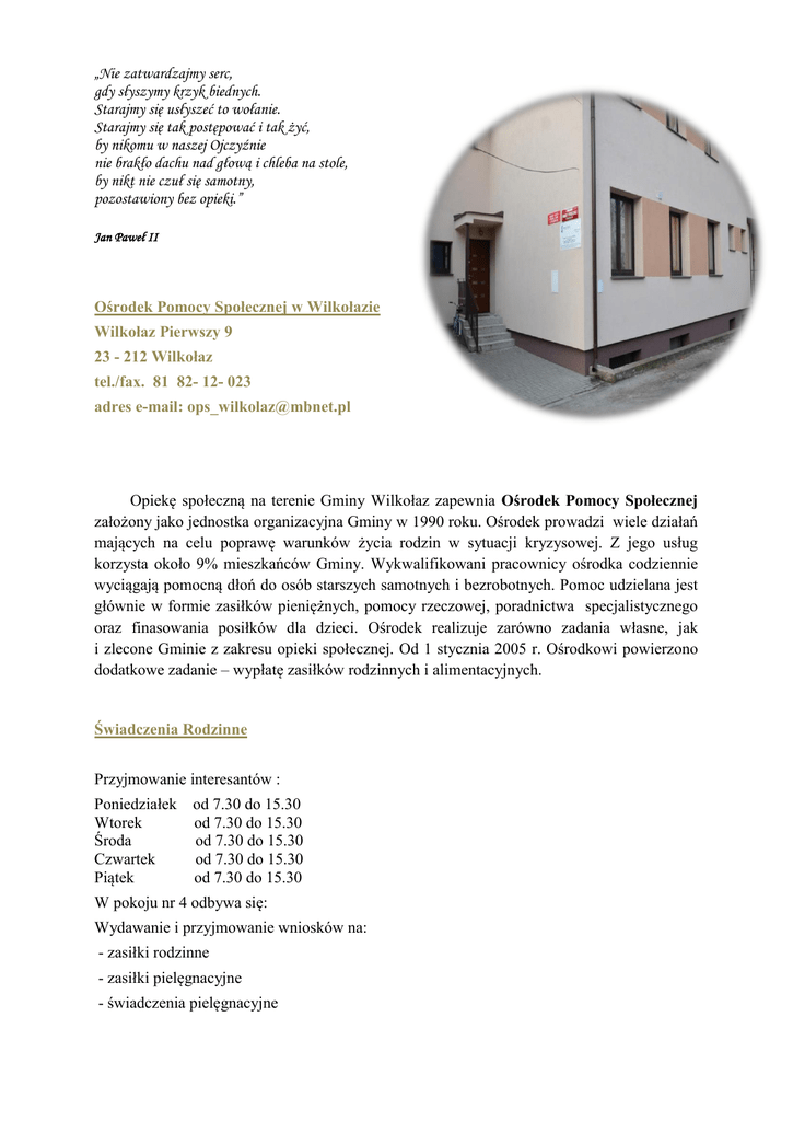 „Nie zatwardzajmy serc, gdy słyszymy krzyk biednych. Starajmy się usłyszeć to wołanie. Starajmy się tak postępować i tak żyć, by nikomu w naszej Ojczyźnie nie brakło dachu nad głową i chleba na stole, by nikt nie czuł się samotny, pozostawiony bez opieki.” Jan Paweł II Ośrodek Pomocy Społecznej w Wilkołazie Wilkołaz Pierwszy 9 23 - 212 Wilkołaz tel./fax. 81 82- 12- 023 adres e-mail: [email protected] Opiekę społeczną na terenie Gminy Wilkołaz zapewnia Ośrodek Pomocy Społecznej założony jako jednostka organizacyjna Gminy w 1990 roku. Ośrodek prowadzi wiele działań mających na celu poprawę warunków życia rodzin w sytuacji kryzysowej. Z jego usług korzysta około 9% mieszkańców Gminy. Wykwalifikowani pracownicy ośrodka codziennie wyciągają pomocną dłoń do osób starszych samotnych i bezrobotnych. Pomoc udzielana jest głównie w formie zasiłków pieniężnych, pomocy rzeczowej, poradnictwa specjalistycznego oraz finasowania posiłków dla dzieci. Ośrodek realizuje zarówno zadania własne, jak i zlecone Gminie z zakresu opieki społecznej. Od 1 stycznia 2005 r. Ośrodkowi powierzono dodatkowe zadanie – wypłatę zasiłków rodzinnych i alimentacyjnych. Świadczenia Rodzinne Przyjmowanie interesantów : Poniedziałek Wtorek Środa Czwartek Piątek od 7.30 do 15.30 od 7.30 do 15.30 od 7.30 do 15.30 od 7.30 do 15.30 od 7.30 do 15.30 W pokoju nr 4 odbywa się: Wydawanie i przyjmowanie wniosków na: - zasiłki rodzinne - zasiłki pielęgnacyjne - świadczenia pielęgnacyjne - wydawanie wniosków na ustalenie prawa do funduszu alimentacyjnego - wydawanie zaświadczeń (wyłącznie osobom uprawnionym do świadczeń rodzinnych i funduszu alimentacyjnego), udzielanie informacji w ww. zakresie. Pomoc Społeczna Przyjmowanie interesantów : Poniedziałek Wtorek Środa Czwartek Piątek od 7.30 do 15.30 od 7.30 do 15.30 od 7.30 do 15.30 od 7.30 do 15.30 od 7.30 do 15.30 W pokoju nr 2 odbywa się: Przyjmowanie wniosków w sprawie świadczeń z pomocy społecznej.
