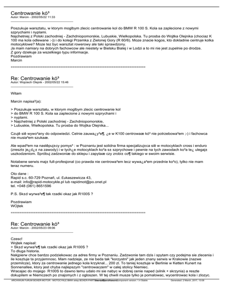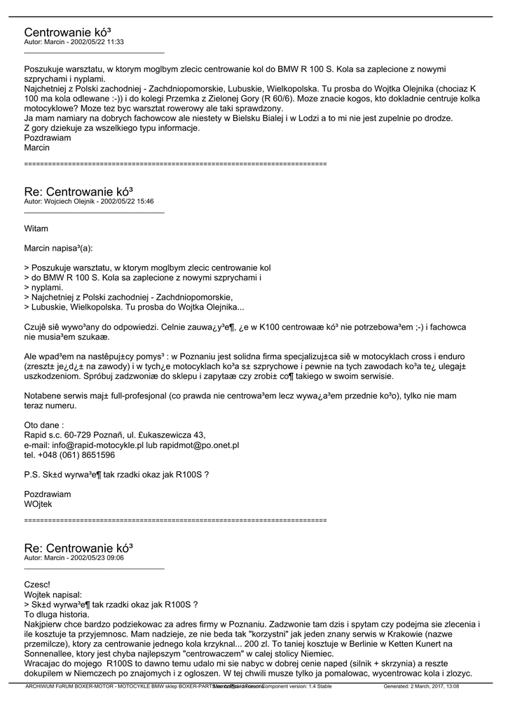 Centrowanie kó³ Autor: Marcin - 2002/05/22 11:33 _____________________________________ Poszukuje warsztatu, w ktorym moglbym zlecic centrowanie kol do BMW R 100 S. Kola sa zaplecione z nowymi szprychami i nyplami. Najchetniej z Polski zachodniej - Zachdniopomorskie, Lubuskie, Wielkopolska. Tu prosba do Wojtka Olejnika (chociaz K 100 ma kola odlewane :-)) i do kolegi Przemka z Zielonej Gory (R 60/6). Moze znacie kogos, kto dokladnie centruje kolka motocyklowe? Moze tez byc warsztat rowerowy ale taki sprawdzony. Ja mam namiary na dobrych fachowcow ale niestety w Bielsku Bialej i w Lodzi a to mi nie jest zupelnie po drodze. Z gory dziekuje za wszelkiego typu informacje. Pozdrawiam Marcin ============================================================================ Re: Centrowanie kó³ Autor: Wojciech Olejnik - 2002/05/22 15:46 _____________________________________ Witam Marcin napisa³(a): > Poszukuje warsztatu, w ktorym moglbym zlecic centrowanie kol > do BMW R 100 S. Kola sa zaplecione z nowymi szprychami i > nyplami. > Najchetniej z Polski zachodniej - Zachdniopomorskie, > Lubuskie, Wielkopolska. Tu prosba do Wojtka Olejnika... Czujê siê wywo³any do odpowiedzi. Celnie zauwa¿y³e¶, ¿e w K100 centrowaæ kó³ nie potrzebowa³em ;-) i fachowca nie musia³em szukaæ. Ale wpad³em na nastêpuj±cy pomys³ : w Poznaniu jest solidna firma specjalizuj±ca siê w motocyklach cross i enduro (zreszt± je¿d¿± na zawody) i w tych¿e motocyklach ko³a s± szprychowe i pewnie na tych zawodach ko³a te¿ ulegaj± uszkodzeniom. Spróbuj zadzwoniæ do sklepu i zapytaæ czy zrobi± co¶ takiego w swoim serwisie. Notabene serwis maj± full-profesjonal (co prawda nie centrowa³em lecz wywa¿a³em przednie ko³o), tylko nie mam teraz numeru. Oto dane : Rapid s.c. 60-729 Poznañ, ul. £ukaszewicza 43, e-mail: [email protected] lub [email protected] tel. +048 (061) 8651596 P.S. Sk±d wyrwa³e¶ tak rzadki okaz jak R100S ? Pozdrawiam WOjtek ============================================================================ Re: Centrowanie kó³ Autor: Marcin - 2002/05/23 09:06 _____________________________________ Czesc! Wojtek napisal: > Sk±d wyrwa³e¶ tak rzadki okaz jak R100S ? To dluga historia. Nakjpierw chce bardzo podziekowac za adres firmy w Poznaniu. Zadzwonie tam dzis i spytam czy podejma sie zlecenia i ile kosztuje ta przyjemnosc. Mam nadzieje, ze nie beda tak "korzystni" jak jeden znany serwis w Krakowie (nazwe przemilcze), ktory za centrowanie jednego kola krzyknal... 200 zl. To taniej kosztuje w Berlinie w Ketten Kunert na Sonnenallee, ktory jest chyba najlepszym "centrowaczem" w calej stolicy Niemiec. Wracajac do mojego R100S to dawno temu udalo mi sie nabyc w dobrej cenie naped (silnik + skrzynia) a reszte dokupilem w Niemczech po znajomych i z ogloszen. W tej chwili musze tylko ja pomalowac, wycentrowac kola i zlozyc. ARCHIWUM FoRUM BOXER-MOTOR - MOTOCYKLE BMW sklep BOXER-PARTS.eu MamboBoard czê¶ci i akcesoria Forum Component version: 1.4 Stable Generated: 2 March, 2017, 13:08 Rzeczywiscie jest to w Polsce rzadki okaz. Podobno gdzies na Dolnym Slasku jest jeszcze jedna ale kolega, ktory chcial ja kupic stwierdzil, ze R100S to ona jest tylko w papierach.:-) Nie wiem. Nie widzialem ale kumplowi wierze, bo byl na taki motocykl napalony. Ogolnie w Polsce jest chyba malo starych boxerow (mam na mysli te wyprodukowane do 1981 roku)? Moze winna jest temu m.in. wysoka cena zakupu w Niemczech? Chociaz w sumie takie BMW do jazdy (wymagajace tylko poprawek przy wygladzie) mozna dostac w zaleznosci od pojemnosci silnika za 1500 - 2250 ¬. Jeszcze raz dziekuje za adres firmy. Pozdrawiam Marcin ============================================================================ Re: Centrowanie kó³ Autor: Marcin - 2002/05/23 10:37 _____________________________________ Hej Wojtek! Udalo mi sie skontaktowac z warsztatem, ktory mi poleciles. Ceny przystepne, nie krakowskie :-). Jeszcze raz Wielkie Dzieki. Pozdrawiam Marcin ============================================================================ Re: Centrowanie kó³ Autor: Wojciech Olejnik - 2002/05/23 12:29 _____________________________________ Witam > Udalo mi sie skontaktowac z warsztatem, ktory mi poleciles. > Ceny przystepne, nie krakowskie :-). Jeszcze raz Wielkie Nie ma sprawy - cieszê siê, ¿e uad³o mi siê pomóc Ci i mam nadziejê, ¿e szybko "staniesz na ko³ach" ! Dla ewentualnych zainteresowanych pe³ne namiary na serwis : Serwis Rapid-Motocykle (autoryzowany serwis Kawasaki) ul. Owocowa 4A (Szczepankowo) Poznañ tel. (61) 827 70 23 i sam mistrz 0-602 375 493 Dla mnie wystarczaj±c± rekomendaj± tego serwisu jest to, ¿e przygotowywane s± tam motocykle dla czo³ówki zawodniczej POLONII CUP. Pozdrawiam WOjtek ============================================================================ Re: Centrowanie kó³ Autor: Wojciech Olejnik - 2002/05/23 12:39 _____________________________________ Marcin napisa³(a): > Rzeczywiscie jest to w Polsce rzadki okaz. Podobno gdzies na > Dolnym Slasku jest jeszcze jedna ale kolega, ktory chcial ja > kupic stwierdzil, ze R100S to ona jest tylko w papierach.:-) ARCHIWUM FoRUM BOXER-MOTOR - MOTOCYKLE BMW sklep BOXER-PARTS.eu MamboBoard czê¶ci i akcesoria Forum Component version: 1.4 Stable Generated: 2 March, 2017, 13:08 Jedna sztuka jest w Krotoszynie - je¼dzi nim syn jednego z naszych klubowiczów. O R100S kiedy¶ pyta³ mnie te¿ pewien cz³owiek, ale nie pamiêtam czy ju¿ kupi³ czy dopiero mia³ na oku. Musia³bym poszukaæ w starych mailach. > Ogolnie w Polsce jest chyba malo starych boxerow (mam na > mysli te wyprodukowane do 1981 roku)? Moze winna jest temu > m.in. wysoka cena zakupu w Niemczech? Dok³adnie tak - cena. Japonia by³a du¿o tañsza, a przy tym jaki power - dlatego je¶li co¶ tu trafia³o z Zachodu to g³ównie japonia. W Polsce okres powojenny 1950-1990 to pustka w temacie BMW. Oczywi¶cie nie mówiê tu o przedwojennych egzemplarzach, eksploatowanych po wojnie, lecz o modelach wypro