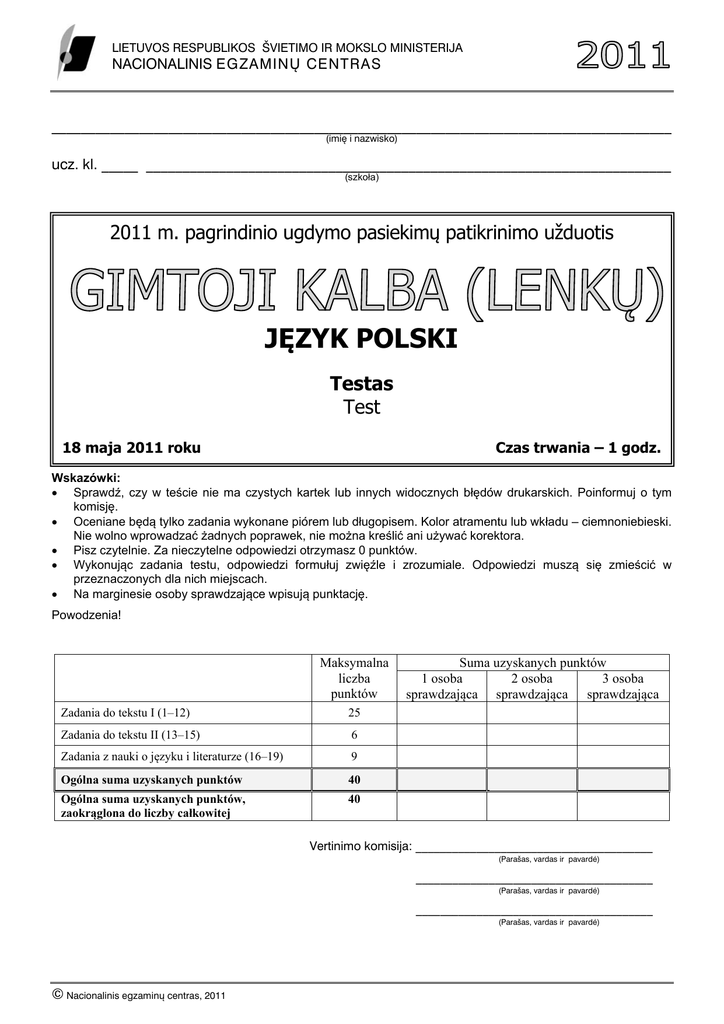 LIETUVOS RESPUBLIKOS ÐVIETIMO IR MOKSLO MINISTERIJA NACIONALINIS EGZAMINØ CENTRAS _____________________________________________________________________________________ (imiæ i nazwisko) ucz. kl. _____ ________________________________________________________________________ (szkoła) 2011 m. pagrindinio ugdymo pasiekimų patikrinimo užduotis JĘZYK POLSKI Testas Test 18 maja 2011 roku Czas trwania – 1 godz. Wskazówki: Sprawdź, czy w teście nie ma czystych kartek lub innych widocznych błędów drukarskich. Poinformuj o tym komisję. Oceniane będą tylko zadania wykonane piórem lub długopisem. Kolor atramentu lub wkładu – ciemnoniebieski. Nie wolno wprowadzać żadnych poprawek, nie można kreślić ani używać korektora. Pisz czytelnie. Za nieczytelne odpowiedzi otrzymasz 0 punktów. Wykonując zadania testu, odpowiedzi formułuj zwięźle i zrozumiale. Odpowiedzi muszą się zmieścić w przeznaczonych dla nich miejscach. Na marginesie osoby sprawdzające wpisują punktację. Powodzenia! Maksymalna liczba punktów Zadania do tekstu I (1–12) 25 Zadania do tekstu II (13–15) 6 Zadania z nauki o języku i literaturze (16–19) 9 Ogólna suma uzyskanych punktów 40 Ogólna suma uzyskanych punktów, zaokrąglona do liczby całkowitej 40 Suma uzyskanych punktów 1 osoba 2 osoba 3 osoba sprawdzająca sprawdzająca sprawdzająca Vertinimo komisija: _______________________________________ (Paraðas, vardas ir pavardë) _______________________________________ (Paraðas, vardas ir pavardë) _______________________________________ (Paraðas, vardas ir pavardë) © Nacionalinis egzaminø centras, 2011 2011 m. pagrindinio ugdymo pasiekimø patikrinimo uþduotis ▪ GIMTOJI KALBA (LENKØ) ▪ Testas TEKST I GRZECHY DZIECIŃSTWA 1. Ojciec, ja i moja siostra Zosia (bom już nie miał matki) mieszkaliśmy w murowanej oficynie1, o kilkadziesiąt kroków od pałacu. Pałac zaś zajmowała pani hrabina z córeczką Lonią, moją rówieśnicą, z jej guwernantką2, ze starą gospodynią Salusią tudzież z wielką liczbą garderobianych3 i panien służących. Dziewczęta te po całych dniach szyły, z czego wyprowadziłem wniosek, że wielkie panie są od tego, ażeby darły odzież, a dziewczęta – ażeby ją naprawiały. O innych przeznaczeniach wielkich dam i ubogich dziewcząt nie miałem pojęcia. Pałacu prawie nie znałem. Raz dlatego, żem wolał biegać po polach niż wywracać się na śliskiej posadzce, a po wtóre, że mnie tam nie wpuszczała służba, bo przy pierwszych odwiedzinach miałem nieszczęście stłuc duży wazon saski. 2. Z hrabianką, przed moim wejściem do szkół, bawiliśmy się tylko jeden raz, mając oboje niespełna po dziesięć lat. Przy sposobności chciałem ją nauczyć sztuki łażenia po drzewach i usadowiłem ją na płocie. Dziewczynka poczęła wniebogłosy krzyczeć, a jej guwernantka wybiła mnie niebieskim parasolem. Od tej pory zbudził się we mnie wstręt do małych dziewcząt, z których żadna nie była w stanie ani łazić po drzewach, ani kąpać się ze mną w stawie, ani jeździć konno, ani strzelać z łuku albo rzucać kamieni z procy. W razie zaś bitwy, bez której – cóż znaczy zabawa! prawie każda zaczynała mazać się i biegła do kogoś na skargę. 3. Ponieważ z folwarcznymi4 chłopcami ojciec znowu nie pozwalał mi się wdawać, a siostra prawie całe dnie przepędzała5 w pałacu, więc rosłem i hodowałem się sam jak drapieżne pisklę, które porzucili rodzice. Kąpałem się pode młynem albo w dziurawym czółnie pływałem po stawie. W parku, ze zwinnością kota, goniłem po gałęziach wiewiórki. Raz wywróciło mi się czółno i pół dnia przesiedziałem na pływającej kępie, nie większej od balii. Raz przez dymnik6 wdrapałem się na dach pałacu tak nieszczęśliwie, że musiano związać dwie drabiny dla sprowadzenia mnie stamtąd. Innego dnia całą dobę błąkałem się po lesie, a jeszcze innego stary wierzchowiec z godzinę ponosił mnie przez pola i w końcu – zapewne niechcący – przyprawił o złamanie nogi, która zresztą zrosła mi się dość prędko. 4. Nie mając z kim żyć, żyłem z naturą. Znałem w parku każde mrowisko, w polu każdą jamę chomików, w ogrodzie każdą ścieżkę kretów. Wiedziałem o ptasich gniazdach i o dziuplach, gdzie hodowały się młode wiewiórki. Odróżniałem szmer każdej lipy około domu i umiałem wyśpiewać to, co wiatr wygrywa na drzewach. Wpatrywałem się w migotanie gwiazd, rozmawiałem z nocną ciszą, a nie mając kogo całować, całowałem psy podwórzowe. Wg B. Prusa 1 Oficyna – budynek w pobliżu pałacu czy dworu, zwykle o przeznaczeniu gospodarczym. Guwernantka – nauczycielka i wychowawczyni dzieci w dawnych, zamożnych domach. 3 Garderobiana – dawniej: służąca zajmująca się garderobą i pomagająca przy ubieraniu się. 4 Folwarczny chłopiec – wynajęty pomocnik w dużym gospodarstwie rolnym. 5 Przepędzała – spędzała. 6 Dymnik – małe okienko w dachu służące do wentylacji i oświetlania poddasza. 2 2 2011 m. pagrindinio ugdymo pasiekimø patikrinimo uþduotis ▪ GIMTOJI KALBA (LENKØ) ▪ Testas Zadania do tekstu I Punkty 1 2 1. Jaki jest temat podanego tekstu? Zaznacz właściwą odpowiedź: A B C D Opis wnętrza pałacu. Zabawy z siostrą. Wspomnienia z dzieciństwa. Psy podwórzowe. (1 punkt) 2. Wypisz z 1. części tekstu cztery wyrazy nazywające osoby, które mieszkały w pałacu. 1. _________________________________ 3. _________________________________ 2. _________________________________ 4. _________________________________ (2 punkty) 3. Na podstawie 1. części tekstu odpowiedz, dlaczego bohater fragmentu nie wchodził do pałacu. Podaj dwie przyczyny: _________________________________ _________________________________ (2 punkty) 4. Czego, zdaniem narratora, nie umiały dziewczynki? Wypisz z 2. części tekstu cztery odpowiednie zwroty czasownikowe. _________________________________ ________