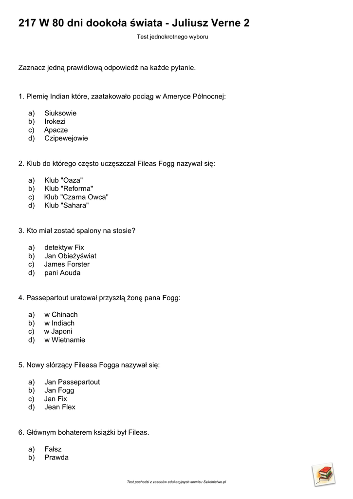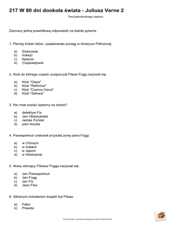 217 W 80 dni dookoła świata - Juliusz Verne 2 Test jednokrotnego wyboru Zaznacz jedną prawidłową odpowiedź na każde pytanie. 1. Plemię Indian które, zaatakowało pociąg w Ameryce Północnej: a) b) c) d) Siuksowie Irokezi Apacze Czipewejowie 2. Klub do którego często uczęszczał Fileas Fogg nazywał się: a) b) c) d) Klub "Oaza" Klub "Reforma" Klub "Czarna Owca" Klub "Sahara" 3. Kto miał zostać spalony na stosie? a) b) c) d) detektyw Fix Jan Obieżyświat James Forster pani Aouda 4. Passepartout uratował przyszłą żonę pana Fogg: a) b) c) d) w Chinach w Indiach w Japoni w Wietnamie 5. Nowy słórzący Fileasa Fogga nazywał się: a) b) c) d) Jan Passepartout Jan Fogg Jan Fix Jean Flex 6. Głównym bohaterem książki był Fileas. a) b) Fałsz Prawda Test pochodzi z zasobów edukacyjnych serwisu Szkolnictwo.pl 7. Pan Fogg miał kotka. a) b) Prawda Fałsz 8. Jakim rodzajem literackim jest książka "W 80 dni dookoła świata"? a) b) c) d) epika liryka dramat żadnym 9. Phileas Fogg należał do Reform-Club a) b) Fałsz Prawda 10. Ile dzieci miał pan Fogg a) b) c) d) 2 Nie miał dzieci 3 1 11. Fogg miał objechać świat w: a) b) c) d) 80 dni 85 dni 79 dni 2 tygodnie 12. Panią Audę od spłonięcia na stosie uratował: a) b) c) d) Pułkownik Cromarty Jan Obieżyświat Pars Fileas Fogg 13. Jak nazywał się nowy służący Fogga? a) b) c) James Forster Jan Obieżyświat Nie miał służącego Test pochodzi z zasobów edukacyjnych serwisu Szkolnictwo.pl