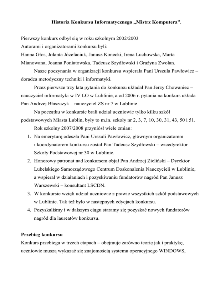 Historia Konkursu Informatycznego „Mistrz Komputera”. Pierwszy konkurs odbył się w roku szkolnym 2002/2003 Autorami i organizatorami konkursu byli: Hanna Głos, Jolanta Józefaciuk, Janusz Konecki, Irena Luchowska, Marta Mianowana, Joanna Poniatowska, Tadeusz Szydłowski i Grażyna Zwolan. Nasze poczynania w organizacji konkursu wspierała Pani Urszula Pawłowicz – doradca metodyczny techniki i informatyki. Przez pierwsze trzy lata pytania do konkursu układał Pan Jerzy Chowaniec – nauczyciel informatyki w IV LO w Lublinie, a od 2006 r. pytania na konkurs układa Pan Andrzej Błaszczyk – nauczyciel ZS nr 7 w Lublinie. Na początku w konkursie brali udział uczniowie tylko kilku szkół podstawowych Miasta Lublin, były to m.in. szkoły nr 2, 3, 7, 10, 30, 31, 43, 50 i 51. Rok szkolny 2007/2008 przyniósł wiele zmian: 1. Na emeryturę odeszła Pani Urszuli Pawłowicz, głównym organizatorem i koordynatorem konkursu został Pan Tadeusz Szydłowski – wicedyrektor Szkoły Podstawowej nr 30 w Lublinie. 2. Honorowy patronat nad konkursem objął Pan Andrzej Zieliński – Dyrektor Lubelskiego Samorządowego Centrum Doskonalenia Nauczycieli w Lublinie, a wspierał w działaniach i pozyskiwaniu fundatorów nagród Pan Janusz Warszewski – konsultant LSCDN. 3. W konkursie wzięli udział uczniowie z prawie wszystkich szkół podstawowych w Lublinie. Tak też było w następnych edycjach konkursu. 4. Pozyskaliśmy i w dalszym ciągu staramy się pozyskać nowych fundatorów nagród dla laureatów konkursu. Przebieg konkursu Konkurs przebiega w trzech etapach – obejmuje zarówno teorię jak i praktykę, uczniowie muszą wykazać się znajomością systemu operacyjnego WINDOWS, programów komputerowych Microsoft Office Word, Microsoft Office Excel, zasadami korzystania z Internetu oraz wiedzą teoretyczną z zakresu informatyki. Pierwszy etap szkolny (teoretyczny) – czas trwania 45 minut. Do drugiego etapu konkursu kwalifikuje się 3 uczniów, którzy uzyskali największą ilość punktów. Drugi etap międzyszkolny (teoretyczny) – czas trwania 45 minut. Do trzeciego etapu konkursu kwalifikuje się 18 uczniów, którzy uzyskali największą liczbę punktów. Trzeci etap (praktyczny) – czas trwania 60 minut. O tytule laureata konkursu „Mistrz Komputera” decyduje suma punktów uzyskanych przez ucznia w części praktycznej i teoretycznej. Cele konkursu: 1. Wdrożenie uczniów do stosowania komputera, oprogramowania i sieci. Internet do rozwiązywania problemów z życia codziennego. 2. Zainteresowanie uczniów technologią informacyjną i rozwojem informatyki. 3. Uświadomienie uczniom zagrożeń wynikających z niewłaściwego wykorzystania komputera: a. bhp pracy z komputerem; b. treści niepożądane w środowisku Internet; c. zagrożenia wynikające z niewłaściwego doboru programu lub gry komputerowej. Cele wychowawcze konkursu: 1. Uczeń poprzez uczestnictwo w konkursie: a. wzmacnia wiarę we własne siły; b. uzyskuje motywację do dalszej pracy; c. rozwija zainteresowanie rozwojem wiedzy informatycznej; d. kształci umiejętność dokonywania właściwego wyboru podczas wyszukiwania informacji w różnych źródłach; e. rozwija swoją wyobraźnię; f. dostrzega wartości własnej pracy; g. dostrzega korzyści związane z rozwojem technologii komputerowej