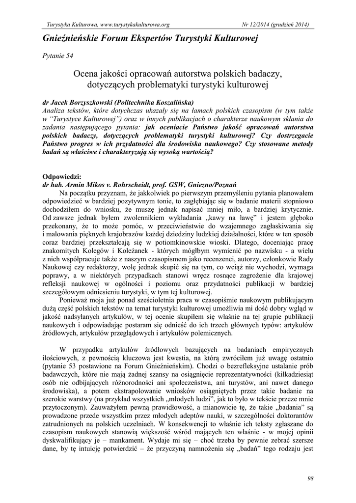 Turystyka Kulturowa, www.turystykakulturowa.org Nr 12/2014 (grudzień 2014) Gnieźnieńskie Forum Ekspertów Turystyki Kulturowej Pytanie 54 Ocena jakości opracowań autorstwa polskich badaczy, dotyczących problematyki turystyki kulturowej dr Jacek Borzyszkowski (Politechnika Koszalińska) Analiza tekstów, które dotychczas ukazały się na łamach polskich czasopism (w tym także w “Turystyce Kulturowej”) oraz w innych publikacjach o charakterze naukowym skłania do zadania następującego pytania: jak oceniacie Państwo jakość opracowań autorstwa polskich badaczy, dotyczących problematyki turystyki kulturowej? Czy dostrzegacie Państwo progres w ich przydatności dla środowiska naukowego? Czy stosowane metody badań są właściwe i charakteryzują się wysoką wartością? Odpowiedzi: dr hab. Armin Mikos v. Rohrscheidt, prof. GSW, Gniezno/Poznań Na początku przyznam, że jakkolwiek po pierwszym przemyśleniu pytania planowałem odpowiedzieć w bardziej pozytywnym tonie, to zagłębiając się w badanie materii stopniowo dochodziłem do wniosku, że muszę jednak napisać mniej miło, a bardziej krytycznie. Od zawsze jednak byłem zwolennikiem wykładania „kawy na ławę” i jestem głęboko przekonany, że to może pomóc, w przeciwieństwie do wzajemnego zagłaskiwania się i malowania pięknych krajobrazów każdej dziedziny ludzkiej działalności, które w ten sposób coraz bardziej przekształcają się w potiomkinowskie wioski. Dlatego, doceniając pracę znakomitych Kolegów i Koleżanek - których mógłbym wymienić po nazwisku - a wielu z nich współpracuje także z naszym czasopismem jako recenzenci, autorzy, członkowie Rady Naukowej czy redaktorzy, wolę jednak skupić się na tym, co wciąż nie wychodzi, wymaga poprawy, a w niektórych przypadkach stanowi wręcz rosnące zagrożenie dla krajowej refleksji naukowej w ogólności i poziomu oraz przydatności publikacji w bardziej szczegółowym odniesieniu turystyki, w tym tej kulturowej. Ponieważ moja już ponad sześcioletnia praca w czasopiśmie naukowym publikującym dużą część polskich tekstów na temat turystyki kulturowej umożliwia mi dość dobry wgląd w jakość nadsyłanych artykułów, w tej ocenie skupiłem się właśnie na tej grupie publikacji naukowych i odpowiadając postaram się odnieść do ich trzech głównych typów: artykułów źródłowych, artykułów przeglądowych i artykułów polemicznych. W przypadku artykułów źródłowych bazujących na badaniach empirycznych ilościowych, z pewnością kluczowa jest kwestia, na którą zwróciłem już uwagę ostatnio (pytanie 53 postawione na Forum Gnieźnieńskim). Chodzi o bezrefleksyjne ustalanie prób badawczych, które nie mają żadnej szansy na osiągnięcie reprezentatywności (kilkadziesiąt osób nie odbijających różnorodności ani społeczeństwa, ani turystów, ani nawet danego środowiska), a potem ekstrapolowanie wniosków osiągniętych przez takie badanie na szerokie warstwy (na przykład wszystkich „młodych ludzi”, jak to było w tekście przeze mnie przytoczonym). Zauważyłem pewną prawidłowość, a mianowicie tę, że takie „badania” są prowadzone przede wszystkim przez młodych adeptów nauki, w szczególności doktorantów zatrudnionych na polskich uczelniach. W konsekwencji to właśnie ich teksty zgłaszane do czasopism naukowych stanowią większość wśród mających ten właśnie - w mojej opinii dyskwalifikujący je – mankament. Wydaje mi się – choć trzeba by pewnie zebrać szersze dane, by tę intuicję potwierdzić – że przyczyną namnożenia się „badań” tego rodzaju jest 98 Turystyka Kulturowa, www.turystykakulturowa.org Nr 12/2014 (grudzień 2014) opisywana już w wielu miejscach polska specjalność: „punktoza”, czyli bezrefleksyjna pogoń za punktami za publikacje, które w ocenianiu młodych pracowników naukowych odgrywają bardzo znaczną, a w wielu uczelniach może nawet decydującą rolę. Przy okazji takich ocen nikt jednak nie sprawdza, czy dane badania wnoszą cokolwiek nowego do istniejącej wiedzy o turystach, ich zachowaniach czy produktach turystycznych. Bardzo poważnie obawiam się, że hoduje się w ten sposób ludzi niezdolnych do odróżnienia tego, co istotne i potrzebne od nic nie wartych elaboratów opartych na przykład na ankietce wśród… własnych studentów, jako materiału dostępnego w każdej chwili i bardzo łatwo poddającego się „badaniu”. Nie chcę już rozwijać wątku, jak łatwo zmanipulować wyniki owego „badania” pod własną tezę, na przykład przeprowadzając w kilku prowadzonych przez siebie grupach wcześniej dwie godziny wykładu czy ćwiczeń na dany temat, a potem za tydzień realizując ankietę… Postuluję, by w ogóle – jeśli nie na drodze prawnej, to przynajmniej przez porozumienie w środowisku – zakazać badania studentów własnego kierunku (turystyki, turystyki kulturowej, zarządzania w turystyce itd.) na wszelkie tematy jakkolwiek dotyczące turystyki, jej zasobów, walorów, preferencji turystycznych, oceny produktów turystycznych itd. Będzie od razu bardziej uczciwie. Drugi problem to jakość tak zwanych artykułów przeglądowych, czyli nie opartych na wynikach własnych badań źródłowych. Przyczyna ich akceptacji jako publikacji naukowych jest ta, że mają one zestawiać wyniki wielu poważnych badań na dany temat (w turystyce także prowadzonych w miejscach nieznanych krajowemu badaczowi). Koniecznym elementem takiego artykułu są dobrze uzasadnione wnioski jego autora, sformułowane na podstawie analizy porównawczej wyników i wniosków z relacjonowanych przezeń (cudzych) badań. Poszerza to wiedzę własnego środowiska naukowego w jakimś konkretnym zakresie, wskazuje na nowe problemy, których być może w krajowym środowisku jeszcze nie znamy, prezentuje opracowywane gdzie indziej nowatorskie koncepcje, produkty i stopień ich skuteczności czy skalę sukcesu, opis