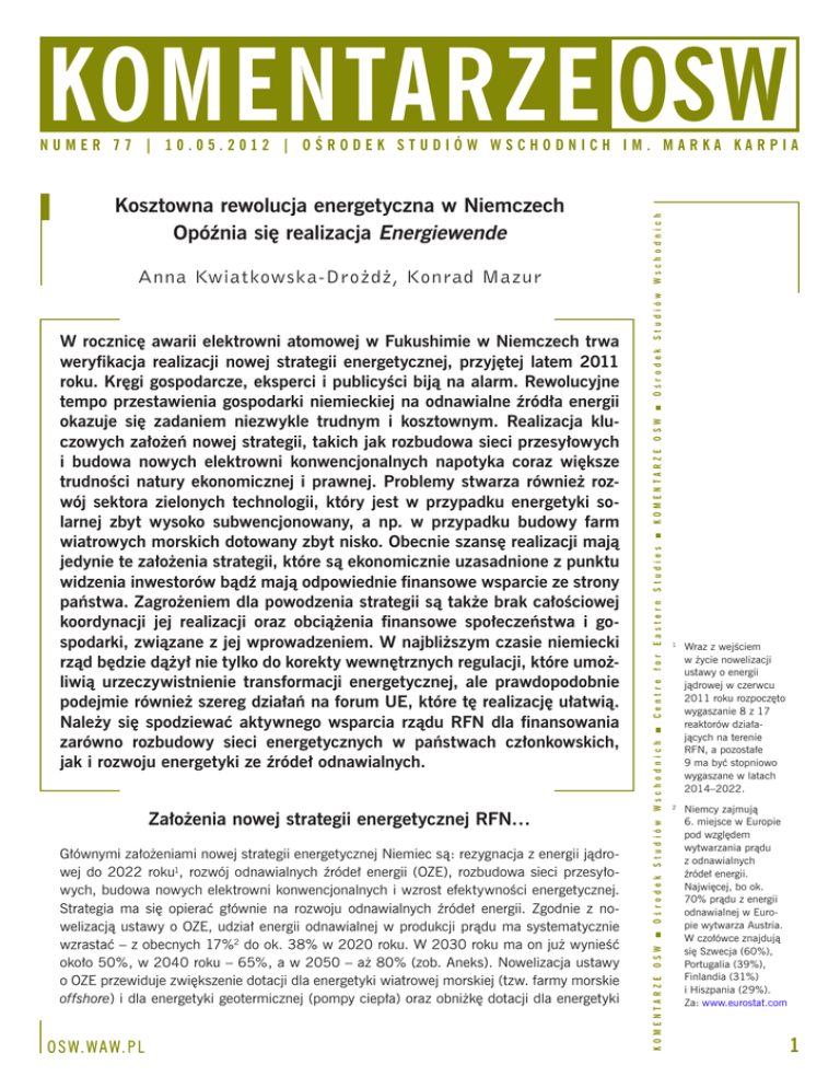 KOMENTARZE OSW Głównymi założeniami nowej strategii energetycznej Niemiec są: rezygnacja z energii jądrowej do 2022 roku1, rozwój odnawialnych źródeł energii (OZE), rozbudowa sieci przesyłowych, budowa nowych elektrowni konwencjonalnych i wzrost efektywności energetycznej. Strategia ma się opierać głównie na rozwoju odnawialnych źródeł energii. Zgodnie z nowelizacją ustawy o OZE, udział energii odnawialnej w produkcji prądu ma systematycznie wzrastać – z obecnych 17%2 do ok. 38% w 2020 roku. W 2030 roku ma on już wynieść około 50%, w 2040 roku – 65%, a w 2050 – aż 80% (zob. Aneks). Nowelizacja ustawy o OZE przewiduje zwiększenie dotacji dla energetyki wiatrowej morskiej (tzw. farmy morskie offshore) i dla energetyki geotermicznej (pompy ciepła) oraz obniżkę dotacji dla energetyki O S W. W A W. P L S t u d i ó w O ś r o d e k O S W KO M E N TA R Z E S t u d i e s E a s t e r n Wraz z wejściem w życie nowelizacji ustawy o energii jądrowej w czerwcu 2011 roku rozpoczęto wygaszanie 8 z 17 reaktorów działających na terenie RFN, a pozostałe 9 ma być stopniowo wygaszane w latach 2014–2022. 2 Niemcy zajmują 6. miejsce w Europie pod względem wytwarzania prądu z odnawialnych źródeł energii. Najwięcej, bo ok. 70% prądu z energii odnawialnej w Europie wytwarza Austria. W czołówce znajdują się Szwecja (60%), Portugalia (39%), Finlandia (31%) i Hiszpania (29%). Za: www.eurostat.com f o r 1 C e n t r e Ws c h o d n i c h S t u d i ó w Założenia nowej strategii energetycznej RFN… O ś r o d e k W rocznicę awarii elektrowni atomowej w Fukushimie w Niemczech trwa weryfikacja realizacji nowej strategii energetycznej, przyjętej latem 2011 roku. Kręgi gospodarcze, eksperci i publicyści biją na alarm. Rewolucyjne tempo przestawienia gospodarki niemieckiej na odnawialne źródła energii okazuje się zadaniem niezwykle trudnym i kosztownym. Realizacja kluczowych założeń nowej strategii, takich jak rozbudowa sieci przesyłowych i budowa nowych elektrowni konwencjonalnych napotyka coraz większe trudności natury ekonomicznej i prawnej. Problemy stwarza również rozwój sektora zielonych technologii, który jest w przypadku energetyki solarnej zbyt wysoko subwencjonowany, a np. w przypadku budowy farm wiatrowych morskich dotowany zbyt nisko. Obecnie szansę realizacji mają jedynie te założenia strategii, które są ekonomicznie uzasadnione z punktu widzenia inwestorów bądź mają odpowiednie finansowe wsparcie ze strony państwa. Zagrożeniem dla powodzenia strategii są także brak całościowej koordynacji jej realizacji oraz obciążenia finansowe społeczeństwa i gospodarki, związane z jej wprowadzeniem. W najbliższym czasie niemiecki rząd będzie dążył nie tylko do korekty wewnętrznych regulacji, które umożliwią urzeczywistnienie transformacji energetycznej, ale prawdopodobnie podejmie również szereg działań na forum UE, które tę realizację ułatwią. Należy się spodziewać aktywnego wsparcia rządu RFN dla finansowania zarówno rozbudowy sieci energetycznych w państwach członkowskich, jak i rozwoju energetyki ze źródeł odnawialnych. O S W Anna Kwiatkowska-Drożdż, Konrad Mazur KO M E N TA R Z E Kosztowna rewolucja energetyczna w Niemczech Opóźnia się realizacja Energiewende Ws c h o d n i c h NUMER 77 | 10.05.2012 | OŚRODEK STUDIÓW WSCHODNICH IM. MARKA KARPIA 1 KOMENTARZE OSW N U M E R 7 7 | 1 0 . 0 5 . 2 0 1 2 | O Ś R O D E K S T U D I Ó W W S C H O D N I C H I M . M A R KA KA R P I A słonecznej. Szczególną rolę w nowej strategii energetycznej przypisuje się rozwojowi niemieckich sieci przesyłowych. Ustawa o ich przyspieszonej rozbudowie (czas budowy ma zostać skrócony z 10 do 4 lat) przewiduje, że powstanie ok. 4450 km sieci przesyłowych, głównie łączących północne landy (gdzie będzie produkowana energia z farm wiatrowych) z południowymi (które jako wysoko uprzemysłowione będą najbardziej dotknięte brakiem energetyki jądrowej). Zastąpieniu energii jądrowej odnawialną ma towarzyszyć budowa małych, wydajnych i nowoczesnych elektrowni konwencjonalnych, a także magazynów na energię. Wsparcie elektrowni konwencjonalnych jest niezbędne, gdyż zapewniają one nieprzerwane dostawy prądu do odbiorców końcowych, czego nie mogą zagwarantować elektrownie OZE (np. elektrownie wiatrowe w wypadku, gdy nie ma wiatru lub jest on zbyt silny, nie działają). Według strategii do 2020 roku ma powstać 10 GW nowych mocy w elektrowniach konwencjonalnych (opartych na węglu i gazie). …i trudności w ich realizacji Największe trudności w realizacji strategii są związane z rozbudową sieci energetycznych. Choć według operatorów zarządzających sieciami w RFN 1/3 wszystkich linii działa na granicy swoich możliwości3, z planowanych ponad czterech tysięcy kilometrów sieci wybudowano do tej pory jedynie ok. 200 km. Powodem zastoju w tym sektorze są zarówno niechęć banków do kredytowania tego rodzaju przedsięwzięć, jak i kłopoty prawne związane z długotrwałymi procesami wywłaszczania gruntów pod budowę sieci oraz protesty obywatelskie (deklarowane poparcie dla Energiewende jest w Niemczech ogromne, jednak działa tu znana skądinąd zasada NIMBY – Not In My Back Yard)4. W sektorze energetyki konwencjonalnej, który ma wspierać rozwój energetyki odRealizacja kluczowych założeń nowej nawialnej, głównym problemem jest mała strategii, takich jak rozbudowa sieci opłacalność ekonomiczna. Zarówno nieprzesyłowych i budowa nowych mieckie, jak i zagraniczne koncerny nie elektrowni konwencjonalnych napochcą inwestować w budowę nowych elektyka coraz większe trudności natury trowni konwencjonalnych ze względu na: ekonomicznej i prawnej. (a) niską opłacalność budowy oraz eksploatacji elektrowni gazowych i węglowych w perspektywie rozwoju OZE w RFN5, (b) niskie lub ujemne marże ze sprzedaży gazu w RFN, (c) dużą konkurencyjność i dywers