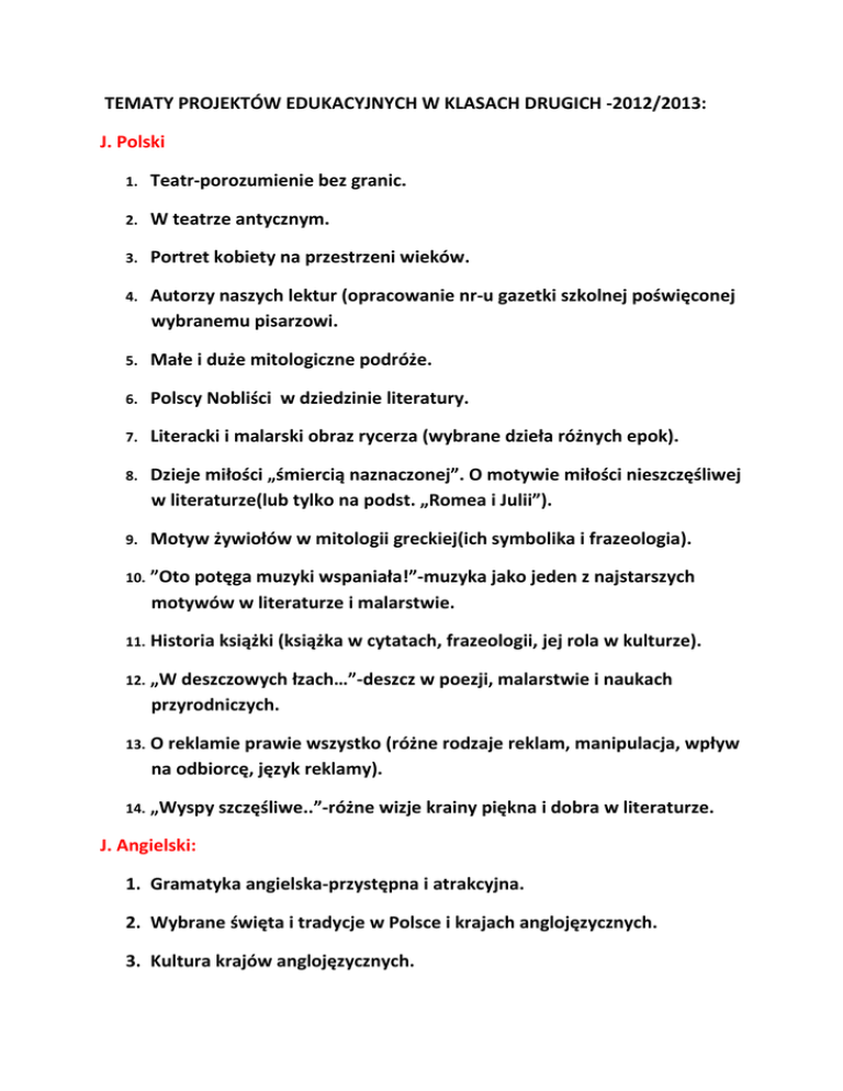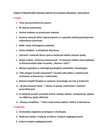 TEMATY PROJEKTÓW EDUKACYJNYCH W KLASACH DRUGICH -2012/2013: J. Polski 1. Teatr-porozumienie bez granic. 2. W teatrze antycznym. 3. Portret kobiety na przestrzeni wieków. 4. Autorzy naszych lektur (opracowanie nr-u gazetki szkolnej poświęconej wybranemu pisarzowi. 5. Małe i duże mitologiczne podróże. 6. Polscy Nobliści w dziedzinie literatury. 7. Literacki i malarski obraz rycerza (wybrane dzieła różnych epok). 8. Dzieje miłości „śmiercią naznaczonej”. O motywie miłości nieszczęśliwej w literaturze(lub tylko na podst. „Romea i Julii”). 9. Motyw żywiołów w mitologii greckiej(ich symbolika i frazeologia). 10. ”Oto potęga muzyki wspaniała!”-muzyka jako jeden z najstarszych motywów w literaturze i malarstwie. 11. Historia książki (książka w cytatach, frazeologii, jej rola w kulturze). 12. „W deszczowych łzach…”-deszcz w poezji, malarstwie i naukach przyrodniczych. 13. O reklamie prawie wszystko (różne rodzaje reklam, manipulacja, wpływ na odbiorcę, język reklamy). 14. „Wyspy szczęśliwe..”-różne wizje krainy piękna i dobra w literaturze. J. Angielski: 1. Gramatyka angielska-przystępna i atrakcyjna. 2. Wybrane święta i tradycje w Polsce i krajach anglojęzycznych. 3. Kultura krajów anglojęzycznych. 4. Dialogi codzienne: prezentacja scenek z życia krajów anglojęzycznych. 5. Jestem przewodnikiem po mojej małej ojczyźnie; prezentacja walorów naszego regionu w języku angielskim. J. Niemiecki 1. Najpiękniejsze zabytki Berlina. 2. Zwyczaje i obyczaje wielkanocne w Niemczech. 3. Poznajemy Bawarię-prezentacja. 4. Polsko-niemiecki słownik obrazkowy. 5. Znani i zasłużeni Niemcy i ich osiągnięcia. Historia 1. Powstanie i rozwój imperium Mongołów. 2. Krucjaty. 3. Rozwój Polski za panowania Kazimierza Wielkiego. 4. Historia naszego godła. 5. Życie codzienne w średniowieczu. 6. Średniowieczne miasto. 7. Rycerstwo w średniowieczu. 8. Cywilizacje prekolumbijskie. 9. Sarmatyzm. 10.Początki polskiej demokracji-XVI w. Wiedza o społeczeństwie: 1. Gryfice-miasto średniowieczne. 2. Bogusław X Wielki-władca Pomorza. 3. Odkrywcy historii-śladami kultury Żydów pomorskich. 4. Tradycje Wielkanocy (współczesne) na Pomorzu Zachodnim. 5. Śladami wojsk napoleońskich na Pomorzu Zachodnim. 6. Skąd się wzięły nazwy miejscowości w gminie Gryfice?(o etymologii). 7. Pomniki na terenie gminy Gryfice jako przykład zmieniającej się historii regionu. Matematyka: 1. Kobiety w matematyce. 2. Wielościany gwieździste. 3. Liczba π. Biologia: 1. Szata roślinna parku gryfickiego. 2. Wpływ stylu życia na zdrowie człowieka. 3. „Żywieniowe śmieci” przyczyną otyłości u dzieci. 4. Dieta-bezpieczna czy groźna? Geografia: 1. 1.Pochodzenie nazw geograficznych na mapie świata. 2. Rega-jej środowisko i zagospodarowanie. 3. Co się dzieje z klimatem na świecie? 4. Polscy podróżnicy i odkrywcy. 5. Gaz łupkowy w Polsce. Chemia: 1. Gazy-ocean życia. 2. 2.Chemia i farmacja bliżej natury, czyli jak przedłużyć życie w zdrowiu. 3. Sztuczne nici, czyli mały/wielki krok dla ludzkości. 4. Matrix Mendelejewa: hel, brom, glin. Fizyka: 1. Jak Eratostenes wyznaczył obwód Ziemi? 2. Jak działają podstawowe układy logiczne w komputerze? 3. Jakich informacji dostarczają sztuczne satelity? Muzyka: 1. Romantyzm w muzyce, malarstwie i poezji. 2. Święto niepodległości w naszej szkole(scenka, pieśni wojenne i żołnierskie (Historia, poezja, może konkurs na wiersz o ojczyźnie). Plastyka: 1. Zabytki Gryfic. 2. Mistrz Rembrandt – jego dzieła i proces tworzenia. 3. Moja wizja Gryfic. 4. Techniki graficzne i ich mistrzowie.