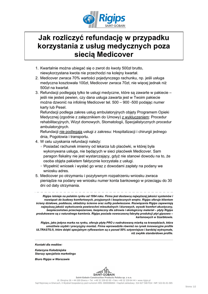 Jak rozliczyć refundację w przypadku korzystania z usług medycznych poza siecią Medicover 1. Kwartalnie można ubiegać się o zwrot do kwoty 500zł brutto, niewykorzystana kwota nie przechodzi na kolejny kwartał. 2. Medicover zwraca 70% wartości pojedynczego rachunku, np. jeśli usługa medyczna kosztowała 100zł, Medicover zwraca 70zł, nie więcej jednak niż 500zł na kwartał. 3. Refundacji podlegają tylko te usługi medyczne, które są zawarte w pakiecie – jeśli nie jesteś pewien, czy dana usługa zawarta jest w Twoim pakiecie można dzwonić na infolinię Medicover tel. 500 – 900 -500 podając numer karty lub Pesel. Refundacji podlega zakres usług ambulatoryjnych objęty Programem Opieki Medycznej (zgodnie z załącznikiem do Umowy) z wykluczeniem: Procedur rehabilitacyjnych, Wizyt domowych, Stomatologii, Specjalistycznych procedur ambulatoryjnych. Refundacji nie podlegają usługi z zakresu: Hospitalizacji i chirurgii jednego dnia, Pogotowia i transportu. 4. W celu uzyskania refundacji należy: Posiadać rachunek imienny od lekarza lub placówki, w której była wykonywana usługa, nie będących w sieci placówek Medicover. Sam paragon fiskalny nie jest wystarczający, gdyż nie stanowi dowodu na to, że osoba objęta pakietem faktycznie korzystała z usługi. Wypełnić wniosek i wysłać go wraz z dowodami zapłaty na podany we wniosku adres. 5. Medicover po otrzymaniu i pozytywnym rozpatrzeniu wniosku zwraca pieniądze na podany we wniosku numer konta bankowego w przeciągu do 30 dni od daty otrzymania. ❍ ❍ Rigips istnieje na polskim rynku od 1994 roku. Firma jest dostawcą najwyższej jakości systemów i rozwiązań do budowy komfortowych, przyjaznych i bezpiecznych wnętrz. Rigips oferuje klientom ściany działowe, poddasza, okładziny ścienne oraz sufity podwieszane. Rozwiązania Rigips zapewniają najwyższą jakość wykończenia powierzchni mieszkalnych i biurowych, wysoki komfort akustyczny, bezpieczeństwo przeciwpożarowe, bezpieczny dla zdrowia i ekologiczny materiał – płyty Rigips produkowane są z naturalnego kamienia. Rigips posiada nowoczesną fabrykę produkcji płyt gipsowo – kartonowych w Szarbkowie. Rigips, jako jedyna marka na rynku, oferuje płytę PRO z nadrukowaną miarką na krawędziach, która umożliwia szybki i precyzyjny montaż. Firma wprowadziła również na rynek innowacyjne profile ULTRASTIL®, które dzięki specjalnym ryflowaniom są o ponad 50% sztywniejsze i bardziej wytrzymałe, niż zwykłe standardowe profile. Kontakt dla mediów: Katarzyna Kołodziejska Starszy specjalista marketingu Biuro Rigips w Warszawie Saint-Gobain Construction Products Polska sp. z o.o. Ul. Okrężna 16 • 44-100 Gliwice • Tel. +48 32 339 63 00 • Faks +48 32 339 64 44 • www.rigips.pl Sąd Rejonowy w Gliwicach, X Wydział Gospodarczy pod numerem KRS: 0000086064 • Kapitał zakładowy: 314 627 500 PLN • NIP: 522-01-01-585 Strona: 1/2 ul. Cybernetyki 9 02-677 Warszawa e-mail: [email protected] Tel. kom.: +48 668 311 526 Saint-Gobain Construction Products Polska sp. z o.o. Ul. Okrężna 16 • 44-100 Gliwice • Tel. +48 32 339 63 00 • Faks +48 32 339 64 44 • www.rigips.pl Sąd Rejonowy w Gliwicach, X Wydział Gospodarczy pod numerem KRS: 0000086064 • Kapitał zakładowy: 314 627 500 PLN • NIP: 522-01-01-585 Strona: 2/2