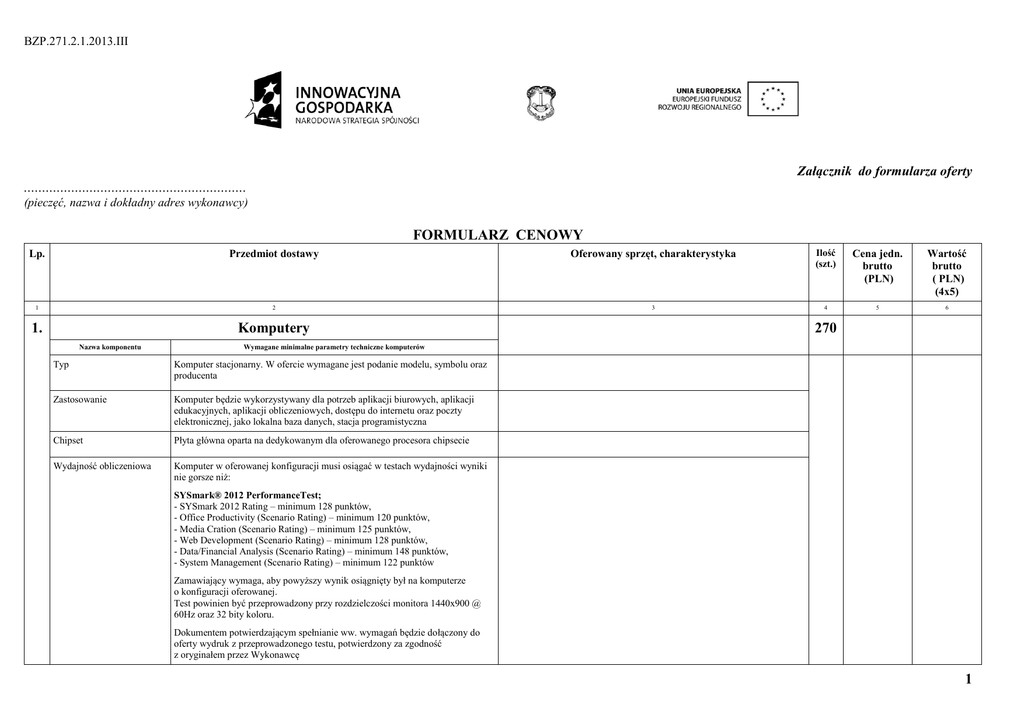 BZP.271.2.1.2013.III Załącznik do formularza oferty ............................................................. (pieczęć, nazwa i dokładny adres wykonawcy) FORMULARZ CENOWY Lp. Przedmiot dostawy Oferowany sprzęt, charakterystyka Ilość (szt.) Cena jedn. brutto (PLN) Wartość brutto ( PLN) (4x5) 1 2 3 4 5 6 1. Komputery Nazwa komponentu 270 Wymagane minimalne parametry techniczne komputerów Typ Komputer stacjonarny. W ofercie wymagane jest podanie modelu, symbolu oraz producenta Zastosowanie Komputer będzie wykorzystywany dla potrzeb aplikacji biurowych, aplikacji edukacyjnych, aplikacji obliczeniowych, dostępu do internetu oraz poczty elektronicznej, jako lokalna baza danych, stacja programistyczna Chipset Płyta główna oparta na dedykowanym dla oferowanego procesora chipsecie Wydajność obliczeniowa Komputer w oferowanej konfiguracji musi osiągać w testach wydajności wyniki nie gorsze niż: SYSmark® 2012 PerformanceTest; - SYSmark 2012 Rating – minimum 128 punktów, - Office Productivity (Scenario Rating) – minimum 120 punktów, - Media Cration (Scenario Rating) – minimum 125 punktów, - Web Development (Scenario Rating) – minimum 128 punktów, - Data/Financial Analysis (Scenario Rating) – minimum 148 punktów, - System Management (Scenario Rating) – minimum 122 punktów Zamawiający wymaga, aby powyższy wynik osiągnięty był na komputerze o konfiguracji oferowanej. Test powinien być przeprowadzony przy rozdzielczości monitora 1440x900 @ 60Hz oraz 32 bity koloru. Dokumentem potwierdzającym spełnianie ww. wymagań będzie dołączony do oferty wydruk z przeprowadzonego testu, potwierdzony za zgodność z oryginałem przez Wykonawcę 1 BZP.271.2.1.2013.III PCMark Vantage Profesional Edition z zainstalowaną poprawką 102 przy standardowych ustawieniach oprogramowania testującego: - PCMark Score – minimum 7940 punktów, - TV and Movies Score – minimum 5030 punktów, - Music Score – minimum 8280 punktów - Communications Score – minimum 8020 punktów - Productivity Score – minimum 7630 punktów Test powinien być przeprowadzony przy rozdzielczości standardowej dla oprogramowania testującego Dokumentem potwierdzającym spełnianie ww. wymagań będzie dołączony do oferty wydruk raportu z oprogramowania testującego lub wydruk zawartości ekranu [Print Screen ekranu] z przeprowadzonych testów, potwierdzony za zgodność z oryginałem przez Wykonawcę. PassMark PerformanceTest 7.0 64 Bit: CPU Mark – wynik min. 4360 punktów PassMark Rating – wynik min. 1405 pkt Dokumentem potwierdzającym spełnianie ww. wymagań będzie dołączony do oferty wydruk raportu z oprogramowania testującego lub wydruk zawartości ekranu [Print Screen ekranu] z przeprowadzonych testów, potwierdzony za zgodność z oryginałem przez Wykonawcę. Zamawiający zastrzega sobie, iż w celu sprawdzenia poprawności przeprowadzenia testu Oferent może zostać wezwany do dostarczenia Zamawiającemu oprogramowania testującego, komputera do testów oraz dokładny opis metodyki przeprowadzonego testu wraz z wynikami w celu ich sprawdzenia. Pamięć operacyjna 4GB możliwość rozbudowy do min 8GB, jeden slot wolny Pamięci zaoferowane w konfiguracji oferowanego komputera muszą osiągać w testach wydajności: PCMark Vantage Profesional 64-bit Edition z zainstalowaną poprawką 102 przy standardowych ustawieniach oprogramowania testującego: - Memories Score – co najmniej wynik 4560 punktów, Test powinien być przeprowadzony przy rozdzielczości standardowej dla oprogramowania testującego PassMark PerformanceTest 7.0: - Memory Mark – co najmniej wynik 1345 punktów, Dokumentem potwierdzającym spełnianie ww. wymagań będzie dołączony do oferty wydruk raportu z oprogramowania testującego lub wydruk zawartości ekranu [Print Screen ekranu] z przeprowadzonych testów, potwierdzony za zgodność z oryginałem przez Wykonawcę. Parametry pamięci masowej Min. 500 GB SATA Dysk twardy w zaoferowanej konfiguracji komputera musi osiągać w teście wydajności: PCMark Vantage Profesional 64-bit Edition z zainstalowaną poprawką 102 przy standardowych ustawieniach oprogramowania testującego: - HDD Score – minimum 5200 punktów, 2 BZP.271.2.1.2013.III Test powinien być przeprowadzony przy rozdzielczości standardowej dla oprogramowania testującego PassMark PerformanceTest 7.0: - Disk Mark – minimum 930 punktów, Dokumentem potwierdzającym spełnianie ww. wymagań będzie dołączony do oferty wydruk raportu z oprogramowania testującego lub wydruk zawartości ekranu [Print Screen ekranu] z przeprowadzonych testów, potwierdzony za zgodność z oryginałem przez Wykonawcę. Wydajność grafiki Zintegrowana w procesorze z możliwością dynamicznego przydzielenia pamięci systemowej, ze sprzętowym wsparciem dla DirectX 10.1, Shader 4.1 posiadająca min. 6EU (Graphics Execution Units) oraz Dual HD HW Decode Komputer w oferowanej konfiguracji musi osiągać w testach wydajności SYSmark® 2012 PerformanceTest; - 3D Modeling (Scenario Rating) – minimum 127 punktów, Test powinien być przeprowadzony przy rozdzielczości monitora 1440x900 @ 60Hz oraz 32 bity koloru Dokumentem potwierdzającym spełnianie ww. wymagań będzie dołączony do oferty wydruk z przeprowadzonego testu, potwierdzony za zgodność z oryginałem przez Wykonawcę lub wydruk ze strony http://www.bapco.com PCMark Vantage Profesional 64-bit Edition z zainstalowaną poprawką 102 przy standardowych ustawieniach oprogramowania testującego: Gaming Score – minimum 4940 punktów Test powinien być przeprowadzony przy rozdzielczości standardowej dla oprogramowania testującego Dokumentem potwierdzającym spełnianie ww. wymagań będzie dołączony do oferty wydruk raportu z oprogramowania testującego lub wydruk zawartości ekranu [Print Screen ekranu] z przeprowadzonych testów, potwierdzony za zgodność z oryginałem przez Wykonawcę. PassMark PerformanceTest 7.0: 2D Graphics Mark – mini