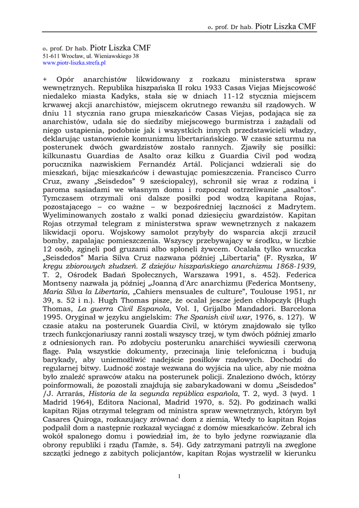 o. prof. Dr hab. Piotr Liszka CMF o. prof. Dr hab. Piotr Liszka CMF 51-611 Wrocław, ul. Wieniawskiego 38 www.piotr-liszka.strefa.pl + Opór anarchistów likwidowany z rozkazu ministerstwa spraw wewnętrznych. Republika hiszpańska II roku 1933 Casas Viejas Miejscowość niedaleko miasta Kadyks, stała się w dniach 11-12 stycznia miejscem krwawej akcji anarchistów, miejscem okrutnego rewanżu sił rządowych. W dniu 11 stycznia rano grupa mieszkańców Casas Viejas, podająca się za anarchistów, udała się do siedziby miejscowego burmistrza i zażądali od niego ustąpienia, podobnie jak i wszystkich innych przedstawicieli władzy, deklarując ustanowienie komunizmu libertariańskiego. W czasie szturmu na posterunek dwóch gwardzistów zostało rannych. Zjawiły się posiłki: kilkunastu Guardias de Asalto oraz kilku z Guardia Civil pod wodzą porucznika nazwiskiem Fernandéz Artál. Policjanci wdzierali się do mieszkań, bijąc mieszkańców i dewastując pomieszczenia. Francisco Curro Cruz, zwany „Seisdedos” 9 sześciopalcy), schronił się wraz z rodziną i paroma sąsiadami we własnym domu i rozpoczął ostrzeliwanie „asaltos”. Tymczasem otrzymali oni dalsze posiłki pod wodzą kapitana Rojas, pozostającego – co ważne – w bezpośredniej łączności z Madrytem. Wyeliminowanych zostało z walki ponad dziesięciu gwardzistów. Kapitan Rojas otrzymał telegram z ministerstwa spraw wewnętrznych z nakazem likwidacji oporu. Wojskowy samolot przybyły do wsparcia akcji zrzucił bomby, zapalając pomieszczenia. Wszyscy przebywający w środku, w liczbie 12 osób, zginęli pod gruzami albo spłonęli żywcem. Ocalała tylko wnuczka „Seisdedos” Maria Silva Cruz nazwana później „Libertarią” (F. Ryszka, W kręgu zbiorowych złudzeń. Z dziejów hiszpańskiego anarchizmu 1868-1939, T. 2, Ośrodek Badań Społecznych, Warszawa 1991, s. 452). Federica Montseny nazwała ją później „Joanną d'Arc anarchizmu (Federica Montseny, Maria Silva la Libertaria, „Cahiers mensuales de culture”, Toulouse 1951, nr 39, s. 52 i n.). Hugh Thomas pisze, że ocalał jescze jeden chłopczyk (Hugh Thomas, La guerra Civil Espanola, Vol. I, Grijalbo Mandadori. Barcelona 1995. Oryginał w języku angielskim: The Spanish civil war, 1976, s. 127). W czasie ataku na posterunek Guardia Civil, w którym znajdowało się tylko trzech funkcjonariuszy ranni zostali wszyscy trzej, w tym dwóch później zmarło z odniesionych ran. Po zdobyciu posterunku anarchiści wywiesili czerwoną flagę. Palą wszystkie dokumenty, przecinają linię telefoniczną i budują barykady, aby uniemożliwić nadejście posiłków rządowych. Dochodzi do regularnej bitwy. Ludność zostaje wezwana do wyjścia na ulice, aby nie można było znaleźć sprawców ataku na posterunek policji. Znaleziono dwóch, którzy poinformowali, że pozostali znajdują się zabarykadowani w domu „Seisdedos” /J. Arrarás, Historia de la segunda república española, T. 2, wyd. 3 (wyd. 1 Madrid 1964), Editora Nacional, Madrid 1970, s. 52). Po godzinach walki kapitan Rijas otrzymał telegram od ministra spraw wewnętrznych, którym był Casares Quiroga, rozkazujący zrównać dom z ziemią. Wtedy to kapitan Rojas podpalił dom a następnie rozkazał wyciągać z domów mieszkańców. Zebrał ich wokół spalonego domu i powiedział im, że to było jedyne rozwiązanie dla obrony republiki i rządu (Tamże, s. 54). Gdy zatrzymani patrzyli na zwęglone szczątki jednego z zabitych policjantów, kapitan Rojas wystrzelił w kierunku 1 o. prof. Dr hab. Piotr Liszka CMF zatrzymanych a wraz z nim zaczęli strzelać też inni, zabijając czternaście osób (Tamże, s. 55). Arrarás kreśli tragiczną sytuację mieszkańców. Co czwarty cierpiał notoryczny głód, mając do dyspozycji jedynie 30 peset miesięcznie. Wielu z nich wchodziło w szeregi anarchistów. Otrzymali rozkaz przyłączenia się da rozruchów po stronie FAI. Wywiesili flagę czarno-czerwoną, anarchistyczną, na budynku zarządu anarchistów w Casas Viejas (Tamże, s. 81). Podczas zdobywania domu w którym bronił się „Seisdedos”, gdy dom został już podpalony, wyszła z niego kobieta z dzieckiem i w ten sposób pozostali żywi. Inni pozostali w środku i zginęli (Tamże, s. 84. + Opór anarchistów wobec wojny trwał po roku 1914, z nielicznymi wyjątkami. „Na łamach prasy brytyjskiej znajdowali możliwość wypowiadali się w sprawie wojny intelektualiści rosyjscy, deklarujący się za wspólnotą walki z mocarstwami centralnymi „w imię demokracji i wolności”. Wśród piszących byli Kropotkin, znany teoretyk anarchizmu, mieszkający w Anglii (1886-1917) /M.A. Miller, Kropotkin, Chicago 1976, s. 221-230/, oraz Paweł Winogradow, historyk o liberalnym nastawieniu, przebywający od 1902 r. w Oksfordzie. Kropotkin był głównym teoretykiem międzynarodowego ruchu anarchistycznego. Przed 1914 r. deklarował się jako przeciwnik wojny ze względu na zagrożenie rewolucją państw, które by ona objęła. Po jej wybuchu nieoczekiwanie przyłączył się do orientacji antyniemieckiej, traktując konflikt jako starcie „światła z ciemnością”. Próbował też przeorientować ruch anarchistyczny w tym kierunku, przewartościować stosunek do militaryzmu, napotkał jednak opór w szeregach swoich zwolenników. Antywojenne frakcja ruchu anarchistycznego wydała manifest o wojnie (wiosną 1915 r.), aby odseparować się od prowojennej postawy Kropotkina. Jego zwolennicy odpowiedzieli kontrmanifestem (luty 1916 r.), uzasadniającym poparcie wojny toczonej przez Ententę” /Cz. Madajczyk, Klerk czy intelektualista zaangażowany? Świat polityki wobec twórców kultury i naukowców europejskich w pierwszej połowie XX wieku. Panorama, Wydawnictwo Poznańskie, Poznań 1999, s. 58/. „Włochy przystąpiły do wojny po roku jej trwania. Marzyli o niej tamtejsi intelektualiści jako o eliksirze młodości lub rewolucji narodów, parli do niej w nadziei p