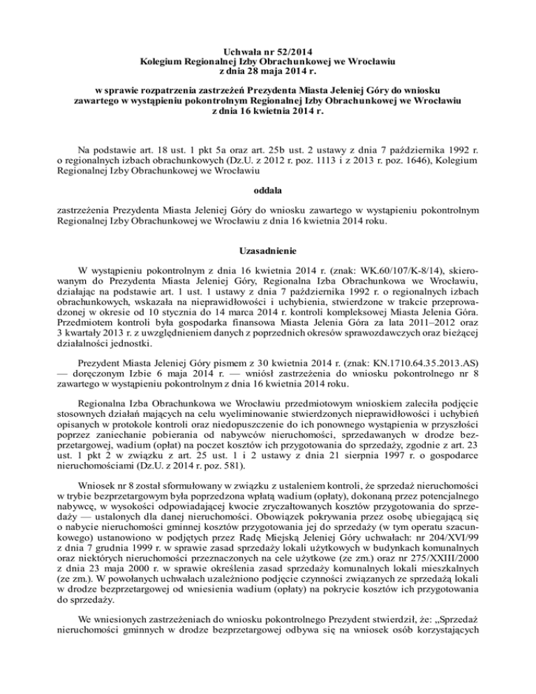 Uchwałanr52/2014 KolegiumRegionalnejIzbyObrachunkowejweWrocławiu zdnia28maja2014r. wsprawierozpatrzeniazastrzeżeńPrezydentaMiastaJeleniejGórydowniosku zawartegowwystąpieniupokontrolnymRegionalnejIzbyObrachunkowejweWrocławiu zdnia16kwietnia2014r. Na podstawie art. 18 ust. 1 pkt 5a oraz art. 25b ust. 2 ustawy z dnia 7 października 1992 r. oregionalnychizbachobrachunkowych(Dz.U.z2012r.poz.1113iz2013r.poz.1646),Kolegium RegionalnejIzbyObrachunkowejweWrocławiu oddala zastrzeżenia Prezydenta Miasta Jeleniej Góry do wniosku zawartego w wystąpieniu pokontrolnym RegionalnejIzbyObrachunkowejweWrocławiuzdnia16kwietnia2014roku. Uzasadnienie W wystąpieniu pokontrolnym z dnia 16 kwietnia 2014 r. (znak: WK.60/107/K-8/14), skierowanym do Prezydenta Miasta Jeleniej Góry, Regionalna Izba Obrachunkowa we Wrocławiu, działając na podstawie art. 1 ust. 1 ustawy z dnia 7 października 1992 r. o regionalnych izbach obrachunkowych, wskazała na nieprawidłowości i uchybienia, stwierdzone w trakcie przeprowadzonejwokresieod10styczniado14marca2014r.kontrolikompleksowejMiastaJeleniaGóra. Przedmiotem kontroli była gospodarka finansowa Miasta Jelenia Góra za lata 2011–2012 oraz 3kwartały2013r.zuwzględnieniemdanychzpoprzednichokresówsprawozdawczychorazbieżącej działalnościjednostki. PrezydentMiastaJeleniejGórypismemz30kwietnia2014r.(znak:KN.1710.64.35.2013.AS) — doręczonym Izbie 6 maja 2014 r. — wniósł zastrzeżenia do wniosku pokontrolnego nr 8 zawartegowwystąpieniupokontrolnymzdnia16kwietnia2014roku. Regionalna Izba Obrachunkowa we Wrocławiu przedmiotowym wnioskiem zaleciła podjęcie stosownychdziałańmającychnaceluwyeliminowaniestwierdzonychnieprawidłowościiuchybień opisanychwprotokolekontroliorazniedopuszczeniedoichponownegowystąpieniawprzyszłości poprzez zaniechanie pobierania od nabywców nieruchomości, sprzedawanych w drodze bezprzetargowej,wadium(opłat)napoczetkosztówichprzygotowaniadosprzedaży,zgodniezart.23 ust. 1 pkt 2 w związku z art. 25 ust. 1 i 2 ustawy z dnia 21 sierpnia 1997 r. o gospodarce nieruchomościami(Dz.U.z2014r.poz.581). Wnioseknr8zostałsformułowanywzwiązkuzustaleniemkontroli,żesprzedażnieruchomości wtrybiebezprzetargowymbyłapoprzedzonawpłatąwadium(opłaty),dokonanąprzezpotencjalnego nabywcę, w wysokości odpowiadającej kwocie zryczałtowanych kosztów przygotowania do sprzedaży — ustalonych dla danej nieruchomości. Obowiązek pokrywania przez osobę ubiegającą się onabycienieruchomościgminnejkosztówprzygotowaniajejdosprzedaży(wtymoperatuszacunkowego) ustanowiono w podjętych przez Radę Miejską Jeleniej Góry uchwałach: nr 204/XVI/99 zdnia7grudnia1999r.wsprawiezasadsprzedażylokaliużytkowychwbudynkachkomunalnych orazniektórychnieruchomościprzeznaczonychnaceleużytkowe(zezm.)oraznr275/XXIII/2000 z dnia 23 maja 2000 r. w sprawie określenia zasad sprzedaży komunalnych lokali mieszkalnych (zezm.).Wpowołanychuchwałachuzależnionopodjęcieczynnościzwiązanychzesprzedażąlokali wdrodzebezprzetargowejodwniesieniawadium(opłaty)napokryciekosztówichprzygotowania dosprzedaży. WewniesionychzastrzeżeniachdownioskupokontrolnegoPrezydentstwierdził,że:„Sprzedaż nieruchomości gminnych w drodze bezprzetargowej odbywa się na wniosek osób korzystających 2 m.in.zpierwszeństwawnabyciunieruchomościicoważne,stronyustalająwarunkinabyciawdrodzeumowycywilno-prawnej.Umowasprzedażyjestinstytucjąprawacywilnego.Wprawiecywilnym zaśobowiązujezasadawolnościumówwyrażonawart.353¹k.c.,którajestprzejawemkonstytucyjnejzasadywolnościiprawekonomicznych,wszczególnościzasadyochronywłasności,atamoże być ograniczona tylko w drodze ustawy i tylko w takim zakresie, w jakim nie narusza ona istoty prawa własności (art. 64 konstytucji). Każde ograniczenie prawa powinno być wyraźnie określone wustawie,aprzepisówzawierającychtakieograniczenieniewolnointerpretowaćrozszerzająco”. PonadtoPrezydentwskazał,żegospodarującgminnymzasobemnieruchomościzapewniawycenęzbywanychnieruchomościpoprzezzlecenierzeczoznawcommajątkowymwykonaniaoperatów szacunkowych wartości nieruchomości, będących podstawą ustalenia ceny zbycia nieruchomości gminnych.Zapewnieniewycenyniejesttożsame—zdaniemPrezydenta—zzapewnieniemodpłatności za czynności wyceny, a przepisy nie stanowią wprost, kto ponosi koszty wyceny nieruchomości. W ocenie Prezydenta przepis art. 23 wraz ze związanym z nim przepisem art. 25 ustawy ogospodarcenieruchomościamistanowiąregulację,któramanaceluwprowadzeniewżyciekatastrunieruchomości,natomiastwycenanieruchomościmabyćwykonywananabieżącoprzezgospodarującegozasobemgminy,dlacelówniezwiązanychzesprzedażąnieruchomości,alewzwiązku zewidencjągruntówwkatastrze,np.dlaewentualnychpotrzebpodatkowych. Odnosząc się do kwestii wadium Prezydent stwierdził, że „ustanowienie wadium ma zwiększyć pewność, iż dojdzie do podpisania przez wnioskodawcę umowy nabycia nieruchomości gminnej.Brakwadiummożespowodowaćsytuacje,wktórychpozłożeniuwnioskuprzezpotencjalnegonabywcę,tenbezjegoopłaceniawycofasięznabycianieruchomości,aGminaponiesiekoszty wyceny i inne koszty związane z przygotowaniem nieruchomości do zbycia, co w konsekwencji będzie stanowiło postępowanie nieprawidłowe i niegospodarne. Jednocześnie należy dodać, iż wadium wpłacane przez strony nabywające gminne nieruchomości lokalowe i gruntowe zaliczane jestnapoczetzryczałtowanychkosztówprzygotowanianieruchomościdozbycia—bezwskazania, jakie są to koszty. Takie rozwiązanie jest akceptowane przez obie strony umowy sprzedaży nieruchomościiniebyłodotądkwestionowane”. Kolegium Regionalnej Izby Obrachunkowej odnosząc się do przedstawionych zastrzeżeń stwierdziło,conastępuje: Obowiązująca w prawie cywilnym zasada swobody umów ma swoje granice. Wyznaczają je m.in.przepisybezwzględnieobowiązujące(art.353¹k.c.).Nieulegazaśwątpliwości,żedotakich należą przepisy regulujące tryb zbywania nierucho