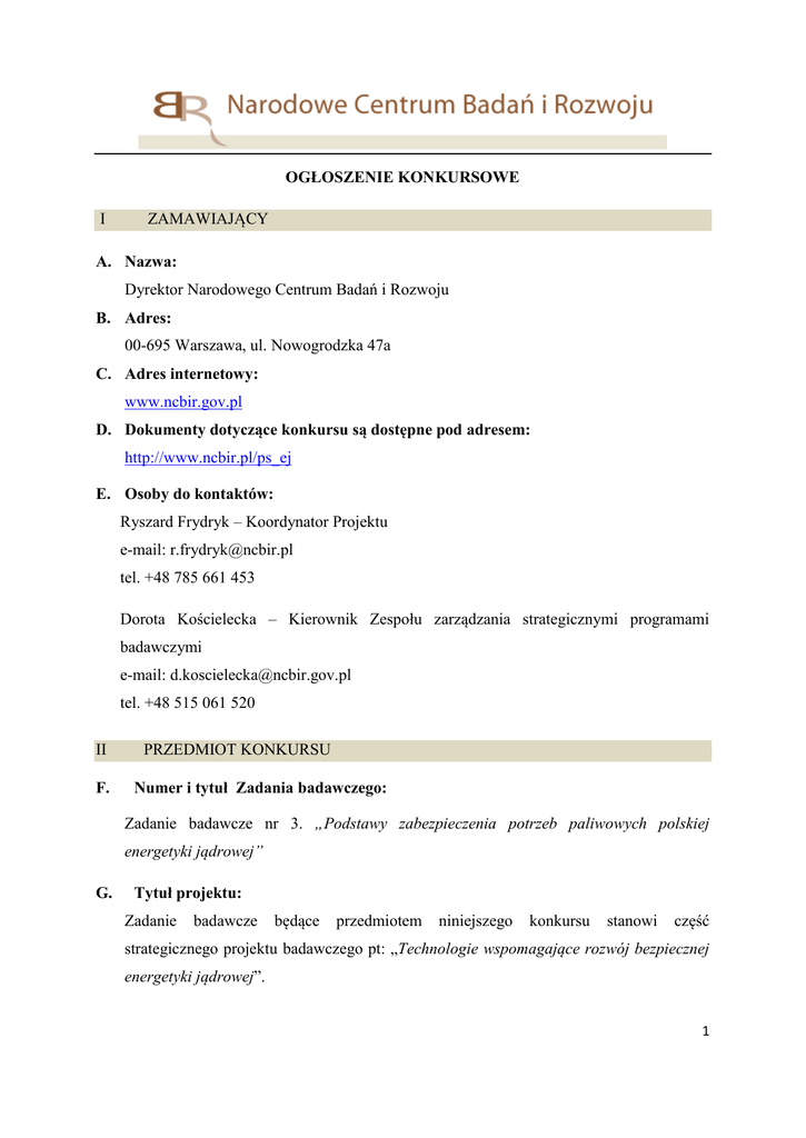 OGŁOSZENIE KONKURSOWE I ZAMAWIAJĄCY A. Nazwa: Dyrektor Narodowego Centrum Badań i Rozwoju B. Adres: 00-695 Warszawa, ul. Nowogrodzka 47a C. Adres internetowy: www.ncbir.gov.pl D. Dokumenty dotyczące konkursu są dostępne pod adresem: http://www.ncbir.pl/ps_ej E. Osoby do kontaktów: Ryszard Frydryk – Koordynator Projektu e-mail: [email protected] tel. +48 785 661 453 Dorota Kościelecka – Kierownik Zespołu zarządzania strategicznymi programami badawczymi e-mail: [email protected] tel. +48 515 061 520 II F. PRZEDMIOT KONKURSU Numer i tytuł Zadania badawczego: Zadanie badawcze nr 3. „Podstawy zabezpieczenia potrzeb paliwowych polskiej energetyki jądrowej” G. Tytuł projektu: Zadanie badawcze będące przedmiotem niniejszego konkursu stanowi część strategicznego projektu badawczego pt: „Technologie wspomagające rozwój bezpiecznej energetyki jądrowej”. 1 H. Cel główny Zadania badawczego: Opracowanie dla potrzeb polskiej energetyki jądrowej technologii oraz analiz techniczno-ekonomicznych dotyczących możliwości zaopatrzenia w paliwo w oparciu o zasoby zagraniczne i krajowe. Cele szczegółowe Zadania badawczego: I. 1. Ocena zasobów i opłacalności pozyskania uranu w Polsce. 2. Ocena wpływu pozyskiwania uranu na środowisko. 3. Badania dotyczące wykorzystania bioługowania w uzysku uranu i oczyszczaniu strumieni odpadowych. 4. Opracowanie metod chemicznych wytwarzania tlenkowych prekursorów paliwa jądrowego. 5. Analiza rynków zagranicznych w zakresie zabezpieczenia dostaw paliwa jądrowego. J. Oczekiwane rezultaty realizacji Zadania badawczego: Końcowymi rezultatami realizacji Zadania badawczego powinny być raporty, oceny techniczno – ekonomiczne i opracowane technologie bioługowania w uzysku uranu i oczyszczaniu strumieni odpadowych oraz technologie wytwarzania tlenkowych prekursorów paliwa jądrowego. K. Maksymalna wysokość dofinansowania Zadania badawczego: do 10 mln zł L. Czas realizacji Zadania badawczego: do 36 miesięcy III PODSTAWA PRAWNA 1. Ustawa z dnia 15 czerwca 2007 r. o Narodowym Centrum Badań i Rozwoju (Dz. U. Nr 115, poz. 789) 2. Ustawa z dnia 8 października 2004 r. o zasadach finansowania nauki (tj. Dz. U. z 2008 r. Nr 169, poz. 1049) 3. Rozporządzenie Ministra Nauki i Szkolnictwa Wyższego z dnia 20 maja 2009 r. w sprawie warunków i trybu udzielania pomocy publicznej za pośrednictwem Narodowego Centrum Badań i Rozwoju (Dz. U. Nr 89, poz. 732) 2 IV M. WARUNKI UDZIAŁU W KONKURSIE Podmioty uprawnione do udziału w konkursie zgodnie z art. 17 ustawy z dnia 15 czerwca 2007 r. o Narodowym Centrum Badań i Rozwoju: 1. Jednostki naukowe posiadające kategorię nadaną w wyniku oceny parametrycznej w rozumieniu ustawy z dnia 8 października 2004 r. o zasadach finansowania nauki – samodzielnie, 2. Jednostki naukowe wchodzące w skład sieci naukowych lub konsorcjów naukowoprzemysłowych w rozumieniu ustawy z dnia 8 października 2004 r. o zasadach finansowania nauki, 3. Jednostki organizacyjne prowadzące działalność badawczo-rozwojową, których roczne przychody netto ze sprzedaży wytworzonych przez siebie wyników badań naukowych lub prac rozwojowych stanowią co najmniej równowartość w złotych 400 000 euro przeliczoną według średniego kursu ogłaszanego przez Narodowy Bank Polski na ostatni dzień roku obrotowego poprzedzającego rok złożenia oferty. V N. PROCEDURA KONKURSU Kryteria oceny merytorycznej ofert: 1) zakres tematyczny obejmujący całość Zadania badawczego 2) zgodność oferty z celami Zadania badawczego 3) poprawność i adekwatność proponowanych metod badawczych 4) potencjał naukowo-badawczy oferenta w obszarze związanym z zabezpieczeniem potrzeb paliwowych polskiej energetyki jądrowej 5) udział partnerów przemysłowych w realizacji Zadania badawczego (minimalna wysokość wkładu finansowego zgodnie z przepisami o pomocy publicznej) 6) osiągnięcia naukowe i praktyczne oferenta w obszarze związanym z zabezpieczeniem potrzeb paliwowych polskiej energetyki jądrowej 3 7) osiągnięcia oraz kompetencje kierownika Zadania badawczego i członków zespołu realizującego w obszarze związanym z zabezpieczeniem potrzeb paliwowych polskiej energetyki jądrowej 8) sposób zarządzania realizacją Zadania badawczego 9) zasadność planowanych kosztów w stosunku do przedmiotu i zakresu badań O. Termin i sposób składania ofert: Ofertę na wykonanie Zadania badawczego należy sporządzić i przesłać on-line za pomocą systemu informatycznego OSF https://osf.opi.org.pl. Dodatkowo należy dostarczyć do Narodowego Centrum Badań i Rozwoju, ul. Nowogrodzka 47a, 00-695 Warszawa, dwa egzemplarze oferty w formie wydruku z wymaganymi podpisami. W przypadku przesłania oferty pocztą tradycyjną o przyjęciu oferty decyduje data stempla pocztowego. Termin składania ofert upływa w dniu 30 grudnia 2010 r. Wzór formularza oferty (PDF) Regulamin konkursu Katalog kosztów kwalifikowalnych Zawartość umowy konsorcjum VI INFORMACJE UZUPEŁNIAJĄCE Wykonawca powinien przedstawić informację o realizowanych przez siebie przedsięwzięciach badawczych z obszaru Zadania badawczego, finansowanych lub współfinansowanych z budżetu państwa lub Unii Europejskiej wraz z deklaracją, że przedstawione w ofercie badania naukowe i prace rozwojowe nie są finansowane z innego źródła. 4
