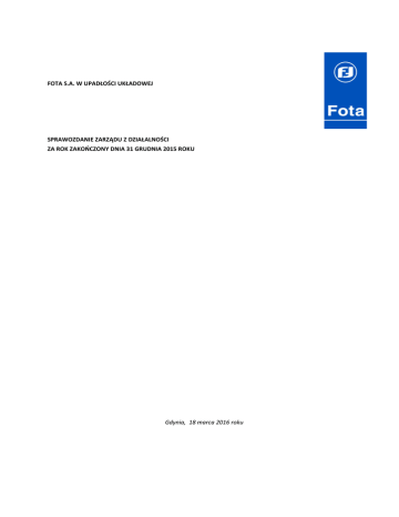 FOTA S.A. W UPADŁOŚCI UKŁADOWEJ SPRAWOZDANIE ZARZĄDU Z DZIAŁALNOŚCI ZA ROK ZAKOŃCZONY DNIA 31 GRUDNIA 2015 ROKU Gdynia, 18 marca 2016 roku Spis treści: WYBRANE DANE FINANSOWE ............................................................................................................... 3 Informacje ogólne ......................................................................................................................... 4 Skład Rady Nadzorczej................................................................................................................... 4 Skład Zarządu Spółki ...................................................................................................................... 5 I. Działalność Fota ...................................................................................................................... 6 II. Sytuacja majątkowa, finansowa i dochodowa Spółki ............................................................ 15 III. Informacje dodatkowe .......................................................................................................... 25 FOTA Sprawozdanie Zarządu z działalności FOTA S.A. w upadłości układowej za rok zakończony dnia 31 grudnia 2015 roku (w tysiącach PLN) WYBRANE DANE FINANSOWE 12 miesięcy zakończone 31 grudnia 2015 Jednostkowe sprawozdanie finansowe 12 miesięcy zakończone 31 grudnia 2014 w tys. złotych Przychody netto ze sprzedaży 12 miesięcy zakończone 31 grudnia 2015 12 miesięcy zakończone 31 grudnia 2014 w tys. euro 114 100 165 645 27 265 39 540 17 577 32 146 4 200 7 673 Zysk (strata) z działalności operacyjnej (33 914) (29 528) (8 104) (7 048) Zysk (strata) brutto (38 905) (37 326) (9 297) (8 910) Zysk (strata) netto (41 932) (30 271) (10 020) (7 226) Zysk (strata) brutto ze sprzedaży Zysk/(strata) na 1 akcje (w PLN/EUR) Przepływy pieniężne netto z działalności operacyjnej Przepływy pieniężne netto z działalności inwestycyjnej Przepływy pieniężne netto z działalności finansowej Przepływy pieniężne netto (4,45) (3,21) (1,06) (0,77) (1 488) (5 809) (356) (1 387) 368 802 88 191 (1 153) (1 599) (276) (382) (2 273) (6 606) (543) (1 577) 31 grudnia 2015 31 grudnia 2014 31 grudnia 2015 31 grudnia 2014 w tys. złotych Aktywa razem w tys. euro 116 321 169 315 27 296 39 724 2 084 6 770 489 1 588 Zobowiązania krótkoterminowe 133 704 140 080 31 375 32 865 Kapitał własny -19 467 22 465 -4 568 5 271 9 416 000 9 416 000 9 416 000 9 416 000 (2,07) 2,39 (0,49) 0,56 Zobowiązania długoterminowe Liczba akcji Wartość księgowa na 1 akcję (w PLN/EUR) 3 FOTA Sprawozdanie Zarządu z działalności FOTA S.A. w upadłości układowej za rok zakończony dnia 31 grudnia 2015 roku (w tysiącach PLN) INFORMACJE OGÓLNE FOTA Fota S.A. w upadłości układowej („Fota”, „Spółka”) została utworzona Aktem Notarialnym z dnia 29 sierpnia 2001 roku. Spółka jest wpisana do rejestru przedsiębiorców Krajowego Rejestru Sądowego prowadzonego przez Sąd Rejonowy Gdańsk-Północ w Gdańsku, VIII Wydział Gospodarczy Krajowego Rejestru Sądowego, pod numerem KRS 0000047702. Spółce nadano numer statystyczny REGON 192598184. Kapitał zakładowy w całości opłacony 18.832.000,00 PLN. Firma: Siedziba: Adres: Numer telefonu: e-mail: Adres internetowy: Fota Spółka Akcyjna w upadłości układowej Gdynia 81-506 Gdynia, ul. Stryjska 24 (+48) 58 690 66 10 [email protected] www.fota.pl W konsekwencji wypowiedzenia umów kredytowych przez banki finansujące działalność Spółki Zarząd Spółki w dniu 28 czerwca 2013 roku złożył w imieniu Spółki do Sądu Rejonowego Gdańsk-Północ w Gdańsku VI Wydział Gospodarczy ds. Upadłościowych i Naprawczych wniosek o ogłoszenie upadłości z możliwością zawarcia układu („Wniosek”). Złożenie Wniosku dało możliwość zawarcia układu i stwarza szansę na restrukturyzację Spółki oraz kontynuowanie jej działalności, a tym samym zaspokojenie roszczeń wierzycieli w jak najwyższym stopniu. W dniu 13 września 2013 roku Sąd Rejonowy Gdańsk-Północ w Gdańsku VI Wydział Gospodarczy wydał postanowienie o ogłoszeniu upadłości układowej Spółki pozostawiając sprawowanie zarządu majątkiem Spółce. Czas trwania Spółki jest nieograniczony. Przedmiot działalności Podstawowym przedmiotem działalności Spółki jest sprzedaż części zamiennych i akcesoriów do samochodów oraz wyposażenia warsztatowego. SKŁAD RADY NADZORCZEJ W okresie od 1 stycznia do 30 czerwca 2015 roku w skład Rady Nadzorczej Fota S.A. w upadłości układowej wchodzili: - Waldemar Dunajewski – Przewodniczący Rady Nadzorczej - Bogdan Fota – Zastępca Przewodniczącego Rady Nadzorczej (do dnia 18 czerwca 2015 roku)* - Jakub Kaczyński – Sekretarz Rady Nadzorczej - Michael Kowalik – Członek Rady Nadzorczej - Tomasz Żurański – Członek Rady Nadzorczej - Arkadiusz Bakierzyński – Członek Rady Nadzorczej *Dnia 18 czerwca 2015 roku z przyczyn zdrowotnych swoją rezygnację z funkcji członka Rady Nadzorczej złożył Pan Bogdan Fota – Zastępca Przewodniczącego Rady Nadzorczej. Wobec upływu czteroletniej wspólnej kadencji w dniu 30 czerwca 2015 roku Zwyczajne Walne Zgromadzenie Akcjonariuszy FOTA podjęło uchwały w przedmiocie powołania członków Rady Nadzorczej na nową wspólną kadencję trwającą cztery lata. Zgodnie z treścią § 16 ust. 2 Statutu Emitenta na pierwszym posiedzeniu w dniu 7 lipca 2015 roku Rada Nadzorcza Emitenta dokonała wyboru Przewodniczącego Rady Nadzorczej FOTA, Zastępcy Przewodniczącego Rady Nadzorczej FOTA oraz Sekretarza Rady Nadzorczej FOTA. 4 FOTA Sprawozdanie Zarządu z działalności FOTA S.A. w upadłości układowej za rok zakończony dnia 31 grudnia 2015 roku (w tysiącach PLN) Na dzień 30 czerwca 2015 roku skład Rady Nadzorczej był następujący: - Waldemar Dunajewski – Przewodniczący Rady Nadzorczej - Jakub Kaczyński – Zastępca Przewodniczącego Rady Nadzorczej - K