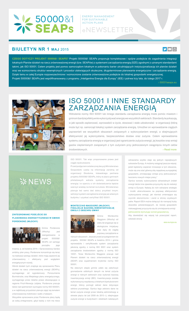 E n e r gy M a n ag eme n t f o r S u s ta i n a b l e Act i o n Pl a n s eNewsletter Biulet yn nr 1 Maj 2015 Czego dotyczy projekt 50000&1 SEAPs? Projekt 50000&1 SEAPs proponuje kompleksowe i spójne podejście do zagadnienia integracji lokalnych Planów działań na rzecz zrównoważonej energii (tzw. SEAPów) z systemami zarządzania energią (SZE) zgodnymi z uznanymi standardami takimi, jak ISO 50001. Celem projektu jest pomoc samorządom lokalnym w pokonaniu barier utrudniających instytucjonalizację ich planów działań oraz we wzmocnieniu struktur wewnętrznych i procedur ułatwiających skuteczne, długoterminowe planowanie energetyczne i zarządzanie energią. Dzięki temu w całej Europie rozpowszechnione i wzmocnione zostanie zrównoważone podejście do lokalnej gospodarki energetycznej. Projekt 50000&1 SEAPs jest współfinansowany z programu „Inteligentna Energia dla Europy” (IEE) i potrwa trzy lata, do lutego 2017 r. › 50001seaps.eu ISO 50001 i inne standardy zarządzania energią Wdrożenie normy ISO 50001 lub innego standardu zarządzania energią może pomóc miastom i gminom bardziej efektywnie wykorzystywać energię we wszystkich sektorach. Standardy te pokazują, w jaki sposób zaplanować, wprowadzić w życie, stosować i stale udoskonalać w organizacji (którą może być np. samorząd lokalny) system zarządzania energią. Umożliwi on wprowadzanie ciągłych usprawnień we wszystkich obszarach związanych z wykorzystaniem energii, a obejmujących efektywność jej wykorzystania, bezpieczeństwo dostaw oraz zużycie. Celem wprowadzenia systemu zarządzania energią w organizacji jest ograniczenie zużycia energii, jej kosztów oraz emisji gazów cieplarnianych związanych z tym zużyciem przy jednoczesnym osiągnięciu innych celów środowiskowych. News › Read more ISO 50001. Tak więc proponowane prawo jest odnawialna szybko staje się jednym największych ciągle dyskutowane. sukcesów Europy. A możemy osiągnąć jeszcze więcej: Przed podjęciem ostatecznej decyzji Ministerstwo jeżeli będziemy wspierać innowacje w tym obszarze, Gospodarki czeka na informację zwrotną od może się ona stać główną siłą napędową europejskiej organizacji gospodarki, zmniejszając emisje przy jednoczesnym Ekodoma, łotewskiego partnera projektu 50000&1 SEAPs, który w pięciu gminach tworzeniu nowych miejsc pracy.” pilotażowych zarządzania Oprócz wzrostu wykorzystania odnawialnych źródeł energią i w oparciu o ich doświadczenia będzie energii także inne zjawiska przyczyniły się do redukcji szerzyć wiedzę na temat na Łotwie. Ministerstwo emisji w Europie. Należą do nich wdrażane strategie planuje też samo dać dobry przykład innym: i środki ukierunkowane na poprawę efektywności wdrożyć system zarządzania energią we własnym wykorzystania energii, jak również zmieniające się budynku i uzyskać certyfikat ISO 50001. czynniki ekonomiczne i zwrot w stronę czystszych wdraża systemy paliw. Raport EEA można dołączyć do rosnącej liczby Montecchio Maggiore (Włochy) finalizuje bazową inwentaryzację emisji z obszaru gminy Zintegrowane podejście do Gmina planowania energetycznego w gminie Pordenone (Włochy) Gmina zaangażowana projekt w 50000&1 SEAPs od samego początku jego trwania, tj. od kwietnia 2014 r. Opracowawszy bardzo ambitny plan pracy, Pordenone koncentruje się teraz na realizacji szeregu działań, które mają zapewnić jej zrównoważony i efektywny pod względem energetycznym rozwój. Wśród działań tych znajduje się opracowanie Planu działań na rzecz zrównoważonej energii (SEAPu), wymaganego od sygnatariuszy Porozumienia Burmistrzów, oraz Miejskiego planu energetycznego, wymaganego przez lokalne prawo obowiązujące w regionie Friuli-Wenecja Julijska. Pordenone pracuje także nad spełnieniem wymogów normy ISO 500001, a w najbliższej przyszłości planuje zająć się tematem zrównoważonej mobilności i walki z hałasem. Wszystkie opracowane przez Pordenone plany będą ze sobą zintegrowane, gdyż każdy z nich ma nieco jednocześnie stymulując wzrost gospodarczy. Aby dowiedzieć się więcej lub przeczytać raport, odwiedź stronę wielu lat angażuje się w oraz dąży do ciągłej jest niskowęglowej przyczynia się do zmniejszenia emisji Maggiore (Włochy) od ekologiczne inicjatywy Pordenone (Włochy) Montecchio dowodów potwierdzających, że rozwój gospodarki poprawy zarządzania w różnych obszarach. Jeszcze przed przystąpieniem do projektu 5000&1 SEAPs w kwietniu 2014 r. gmina wprowadziła i certyfikowała system zarządzania jakością zgodny z normą ISO 9001 oraz system zarządzania środowiskiem zgodny z normą ISO 14001. Teraz Montecchio Maggiore pracuje nad Planem działań na rzecz zrównoważonej energii (SEAP) oraz wypełnieniem kryteriów normy ISO 50001. Na obecnym etapie gminie udało się zakończyć gromadzenie oddolnych danych na temat zużycia energii w różnych sektorach oraz wykonać bazową inwentaryzację emisji (BEI). Inwentaryzacja została wykonana przy współpracy z lokalnymi dystrybutorami energii, którzy pomogli zebrać dane dotyczące sektora prywatnego. Oprócz tego zebrano dane na temat zużycia energii przez lokalną administrację w okresie pięciu lat (od 2008 do 2013 r.), obejmujące zużycie energii w budynkach i obiektach należących eea.europa.eu inne implikacje dla sytuacji energetycznej gminy. Na do gminy, oświetleniu publicznym oraz transporcie obecnym etapie realizacji projektu gmina ukończyła publicznym. proces gromadzenia potrzebnych Zakończywszy proces gromadzenia i analizy danych, danych oraz sporządziła bazową inwentaryzację emisji (BEI) gmina dla roku 2010. Pordenone współpracuje również zakres dalszych prac prowadzących do opracowania Montecchio Maggiore definiuje obecnie z regionem Friuli-Wenecja Julijska, który pełni SEAPu i spełnienia wymogów normy ISO 50001, funkcję regionalnego Koordynatora Porozumienia w tym