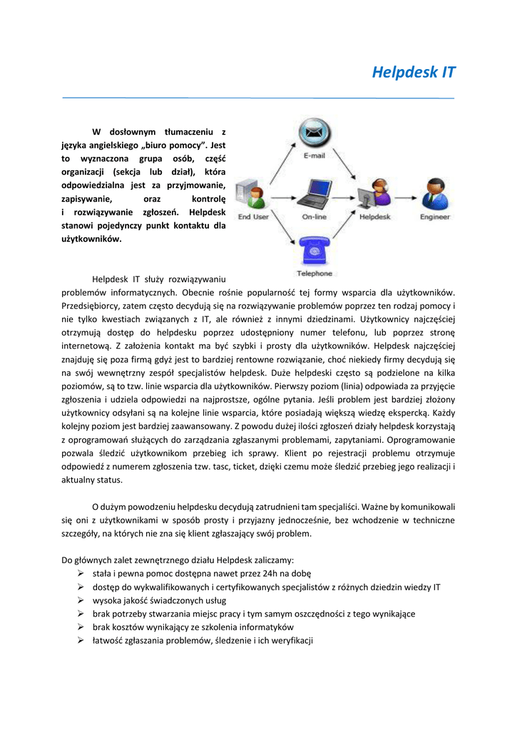 Helpdesk IT W dosłownym tłumaczeniu z języka angielskiego „biuro pomocy”. Jest to wyznaczona grupa osób, część organizacji (sekcja lub dział), która odpowiedzialna jest za przyjmowanie, zapisywanie, oraz kontrolę i rozwiązywanie zgłoszeń. Helpdesk stanowi pojedynczy punkt kontaktu dla użytkowników. Helpdesk IT służy rozwiązywaniu problemów informatycznych. Obecnie rośnie popularność tej formy wsparcia dla użytkowników. Przedsiębiorcy, zatem często decydują się na rozwiązywanie problemów poprzez ten rodzaj pomocy i nie tylko kwestiach związanych z IT, ale również z innymi dziedzinami. Użytkownicy najczęściej otrzymują dostęp do helpdesku poprzez udostępniony numer telefonu, lub poprzez stronę internetową. Z założenia kontakt ma być szybki i prosty dla użytkowników. Helpdesk najczęściej znajduję się poza firmą gdyż jest to bardziej rentowne rozwiązanie, choć niekiedy firmy decydują się na swój wewnętrzny zespół specjalistów helpdesk. Duże helpdeski często są podzielone na kilka poziomów, są to tzw. linie wsparcia dla użytkowników. Pierwszy poziom (linia) odpowiada za przyjęcie zgłoszenia i udziela odpowiedzi na najprostsze, ogólne pytania. Jeśli problem jest bardziej złożony użytkownicy odsyłani są na kolejne linie wsparcia, które posiadają większą wiedzę ekspercką. Każdy kolejny poziom jest bardziej zaawansowany. Z powodu dużej ilości zgłoszeń działy helpdesk korzystają z oprogramowań służących do zarządzania zgłaszanymi problemami, zapytaniami. Oprogramowanie pozwala śledzić użytkownikom przebieg ich sprawy. Klient po rejestracji problemu otrzymuje odpowiedź z numerem zgłoszenia tzw. tasc, ticket, dzięki czemu może śledzić przebieg jego realizacji i aktualny status. O dużym powodzeniu helpdesku decydują zatrudnieni tam specjaliści. Ważne by komunikowali się oni z użytkownikami w sposób prosty i przyjazny jednocześnie, bez wchodzenie w techniczne szczegóły, na których nie zna się klient zgłaszający swój problem. Do głównych zalet zewnętrznego działu Helpdesk zaliczamy: stała i pewna pomoc dostępna nawet przez 24h na dobę dostęp do wykwalifikowanych i certyfikowanych specjalistów z różnych dziedzin wiedzy IT wysoka jakość świadczonych usług brak potrzeby stwarzania miejsc pracy i tym samym oszczędności z tego wynikające brak kosztów wynikający ze szkolenia informatyków łatwość zgłaszania problemów, śledzenie i ich weryfikacji szybki czas reakcji na zgłoszenia użytkowników (regulowany odpowiednimi zapisami w umowie) brak problemów wynikających z tzw. „czynników ludzkich” – choroby, zwolnienia brak kłopotów w zarządzaniu dodatkowym personelem (działem w firmie) redukcja kosztów operacyjnych prosty pojedynczy punkt kontaktowy, zazwyczaj w formie zgłoszenia mailem lub telefonem stała pomoc w każdym problemie możliwość konsultacji i doradztwa W dzisiejszych czasach właściciele firm skupiają się na podstawowej działalności firmy, z której czerpią profity (usługi, produkty), dlatego też decydują się na zewnętrzny hepldesk. Tym samym, nie muszą martwić się o problemy wynikające z tworzenia takiego działu wewnątrz organizacji. Powierzają te sprawy wykwalifikowanemu zespołowi fachowców. Właściwie nie ma w tym momencie branży czy też środowiska gdzie helpdesk nie spełniałby swojego zadania. W świecie informatyzacji i szybkiego rozwoju cyfrowego, nie da się uciec od informatyki, a prostym sposobem na radzenie sobie z tym jest decyzja by powierzyć procesy IT zewnętrznym specjalistom. Rodzi się tylko pytanie, czym kierować się przy wyborze firmy oferującej usługi helpdesku? Wiadomo ofert na rynku jest bardzo wiele. Najlepiej zebrać informację o firmie, sprawdzić od jak dawna jest na rynku, jak duży liczy zespół specjalistów, jakie mają oni certyfikaty, dla kogo pracują. Z pewnością pomocne okażą się referencję od partnerów, klientów. Warto zadać sobie troszkę trudu i skontaktować się z obecnymi klientami firmy i zapytać, o jakość i zadowolenie z firmy świadczącej helpdesk. Artykuł opracowała Marlena Markowska, Źródło: własne Support Online Sp. z o.o. Firma Support Online wykorzystuje rozwiązania związane z wirtualnymi sieciami. Jeśli jesteś zainteresowany zastosowaniem łączeniem routerów przez IPsec w Twojej firmie lub innymi rozwiązaniami informatycznymi skontaktuj się z nami: Support Online Sp. z o.o. tel. + 22 335 28 00 e-mail: [email protected] www.support-online.pl