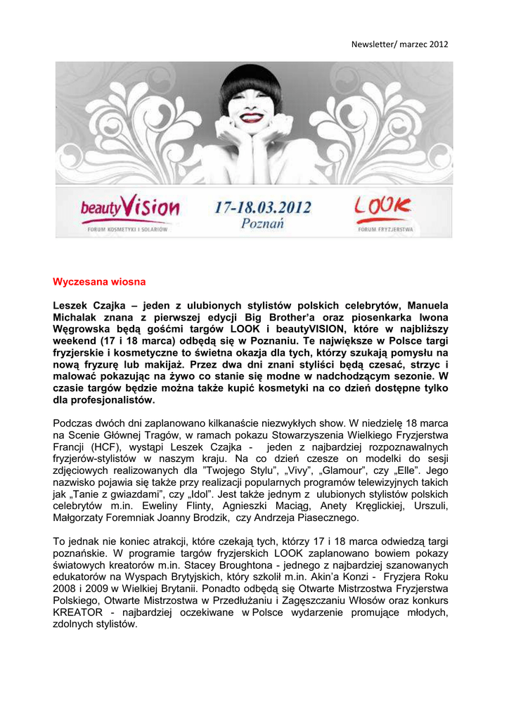 Newsletter/ marzec 2012 Wyczesana wiosna Leszek Czajka – jeden z ulubionych stylistów polskich celebrytów, Manuela Michalak znana z pierwszej edycji Big Brother’a oraz piosenkarka Iwona Węgrowska będą gośćmi targów LOOK i beautyVISION, które w najbliŜszy weekend (17 i 18 marca) odbędą się w Poznaniu. Te największe w Polsce targi fryzjerskie i kosmetyczne to świetna okazja dla tych, którzy szukają pomysłu na nową fryzurę lub makijaŜ. Przez dwa dni znani styliści będą czesać, strzyc i malować pokazując na Ŝywo co stanie się modne w nadchodzącym sezonie. W czasie targów będzie moŜna takŜe kupić kosmetyki na co dzień dostępne tylko dla profesjonalistów. Podczas dwóch dni zaplanowano kilkanaście niezwykłych show. W niedzielę 18 marca na Scenie Głównej Tragów, w ramach pokazu Stowarzyszenia Wielkiego Fryzjerstwa Francji (HCF), wystąpi Leszek Czajka - jeden z najbardziej rozpoznawalnych fryzjerów-stylistów w naszym kraju. Na co dzień czesze on modelki do sesji zdjęciowych realizowanych dla ”Twojego Stylu”, „Vivy”, „Glamour”, czy „Elle”. Jego nazwisko pojawia się takŜe przy realizacji popularnych programów telewizyjnych takich jak „Tanie z gwiazdami”, czy „Idol”. Jest takŜe jednym z ulubionych stylistów polskich celebrytów m.in. Eweliny Flinty, Agnieszki Maciąg, Anety Kręglickiej, Urszuli, Małgorzaty Foremniak Joanny Brodzik, czy Andrzeja Piasecznego. To jednak nie koniec atrakcji, które czekają tych, którzy 17 i 18 marca odwiedzą targi poznańskie. W programie targów fryzjerskich LOOK zaplanowano bowiem pokazy światowych kreatorów m.in. Stacey Broughtona - jednego z najbardziej szanowanych edukatorów na Wyspach Brytyjskich, który szkolił m.in. Akin’a Konzi - Fryzjera Roku 2008 i 2009 w Wielkiej Brytanii. Ponadto odbędą się Otwarte Mistrzostwa Fryzjerstwa Polskiego, Otwarte Mistrzostwa w PrzedłuŜaniu i Zagęszczaniu Włosów oraz konkurs KREATOR - najbardziej oczekiwane w Polsce wydarzenie promujące młodych, zdolnych stylistów. Natomiast niekwestionowaną gwiazdą targów kosmetycznych beautyVISION będzie Vincent de Monfreid - światowej sławy wizaŜysta, charakteryzator oraz dyrektor artystyczny znanej francuskiej szkoły Atelier International De Maquillage. Odbędzie się takŜe VI Kongres Nail Expert beautyVISION oraz VI Międzynarodowe Mistrzostwa Polski w Zdobnictwie Paznokci Nail Expert beautyVISION. Tegoroczny temat Mistrzostw to "Dzieci kwiaty – szalone lata 60-te”. Natomiast znawców profesjonalnego makijaŜu na pewno zainteresuje jeden z tematów Otwartych Mistrzostw Polski w MakijaŜu Profesjonalnym - makijaŜ Kobiety WAMPA. W programie targów zaplanowano seminaria i wykłady dotyczące m.in. trendów w makijaŜu na wiosnę-lato 2012, procesów starzenia się skóry oraz faktów i mitów na temat makijaŜu permanentnego. Po raz ósmy odbędzie się takŜe Seminarium Solaryjne „Ze słońcem we włosach”. Ponadto na stoiskach wystawców styliści i wizaŜyści fachowo doradzą jaki krem jest najlepszy dla naszej cery oraz który odcień podkład, czy kredki do oczu najlepiej pasuje do naszej karnacji. Specjaliści podpowiedzą takŜe jak pielęgnować włosy i malować paznokcie. Targi moŜna zwiedzać 17 i 18 marca w godzinach od 9 do 17. Bilet wstępu kosztuje 35 zł, natomiast profesjonaliści, którzy się zarejestrują zapłacą 25 zł. Szczegółowy program na stronie www.look-beautyvision.mtp.pl Kontakt dla Mediów: Marta Radowska-Karpińska tel. +48 61 869 2634 [email protected] Jeśli nie chcesz otrzymywać newslettera kliknij | Rezygnuję