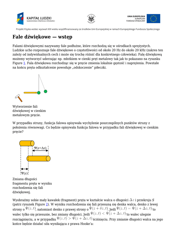 Fale dźwiękowe — wstęp Falami dźwiękowymi nazywamy fale podłużne, które rozchodzą się w ośrodkach sprężystych. Ludzkie ucho rozpoznaje fale dźwiękowe o częstotliwości od około 20 Hz do około 20 kHz (zakres ten zależy od indywidualnych cech i może się trochę różnić dla konkretnego człowieka). Falę dźwiękową możemy wytworzyć uderzając np. młotkiem w cienki pręt metalowy tak jak to pokazano na rysunku Figure 1. Fala dźwiękowa rozchodząc się w pręcie zmienia lokalnie gęstość i naprężenia. Powstałe na końcu pręta odkształcenie powoduje „odskoczenie” piłeczki. Wytworzenie fali dźwiękowej w cienkim metalowym pręcie. W przypadku struny, funkcja falowa opisywała wychylenie poszczególnych punktów struny z położenia równowagi. Co będzie opisywała funkcja falowa w przypadku fali dźwiękowej w cienkim pręcie? Zmiana długości fragmentu pręta w wyniku rozchodzenia się fali dźwiękowej. Wyobraźmy sobie mały kawałek (fragment) pręta w kształcie walca o długości i przekroju S (patrz rysunek Figure 2). W wyniku rozchodzenia się fali przesuną się denka walca, denko z lewej strony o , natomiast denko z prawej strony o walec tylko się przesunie, bez zmiany długości. Jeśli . Jeśli to to walec ulegnie rozciągnięciu, a w przypadku ściśnięciu. Przy zmianie długości walca na jego końce będzie działać siła wynikająca z prawa Hooke’a: gdzie parametr E jest modułem Younga. Uwzględniając siłę wypadkową działającą na walec (różnica sił działających na lewe i prawe denko) oraz masę walca: otrzymujemy równanie: Otrzymaliśmy podobnie jak dla struny klasyczne równanie falowe z prędkością rozchodzenia się fali dźwiękowej: . Przykładowo, dla cienkiego ołowianego pręta korzystając z powyższego wzoru łatwo możemy wyliczyć prędkość: stąd: Przeprowadzane rozważania, w tym wyprowadzenie klasycznego równania falowego były oparte na prawie Hooke’a, a więc dotyczyły cienkich prętów. Okazuje się jednak, że postać klasycznego równania falowego dla fal jest taka sama dla dowolnych materiałów objętościowych (o dowolnych kształtach), musimy jedynie w równaniu zamienić moduł Younga na współczynnik sprężystości objętościowej nazywany również modułem ściśliwości, który jest oznaczany zwykle literą . Moduł ściśliwości jest zdefiniowany: , a równanie falowe ma postać: Prędkość rozchodzenia się fali wynosi zatem: . Zwykle , a więc fala dźwiękowa rozchodzi się szybciej w materiale objętościowym niż w cienkim pręcie. Poniżej zebrano przykładowe prędkości fali dźwiękowej w wybranych materiałach (objętościowych). Substancja Uwagi Ciekły hel 211 4K Rtęć 1450 20° C Woda 1402 0° C Woda 1482 20° C Woda 1543 100° C Aluminium 6420 fale podłużne Miedź 4700 w materiałach Ołów 2160 objętościowych Stal 5941 niesk. rozciągł. Pleksiglas 2670 20° C Długość fali zależy od prędkości i częstotliwości . Zmienia się więc gdy np. fala dźwiękowa przechodzi z jednego ośrodka do drugiego. Zwróćmy też uwagę, że zdolność rozdzielcza przyrządów akustycznych zależy od częstotliwości. Np. sonar, który jest używany do wykrywania podwodnych obiektów wysyła fale dźwiękowe o częstotliwości 262 Hz co odpowiada . Fale odbite od podwodnych obiektów wracają do sonara. Sonar może więc wykrywać obiekty nie mniejsze niż długość fali a więc obiekty o rozmiarach co najmniej kilkumetrowych. Z kolei delfiny do wykrywania obiektów posługują się falami o długości a więc mogą wykrywać mniejsze obiekty niż sonar, natomiast w badaniach lekarskich za pomocą techniki USG wykorzystującej fale dźwiękowe o częstotliwości 5 MHz (ultradźwięki) można wykrywać obiekty o rozmiarach: . Przeprowadzając analogiczne rozważania jak wyżej dla gazów otrzymujemy identyczną postać klasycznego równania falowego. Możemy się zastanowić jakiej przemianie podlega gaz podczas rozchodzenia się w nim fali dźwiękowej, zakładając, że gaz jest idealny? Porównanie doświadczenia z wzorami teoretycznymi jednoznacznie wskazuje, że gaz podlega przemianie adiabatycznej. Wyprowadźmy zatem dla takiej przemiany wzór na prędkość rozchodzenia się fali. Dla przemiany adiabatycznej ciśnienie gazu wynosi: , gdzie wielkości z indeksem 0 odpowiadają ciśnieniu i objętości w stanie normalnym (gdy fala nie rozchodzi się w gazie) a moduł ściśliwości wynosi: . Dla tego przypadku . Z drugiej strony dla gazu idealnego: , gdzie jest liczbą moli, stałą gazową a temperaturą. Po prostych przekształceniach otrzymujemy: , gdzie jest gęstością gazu, masą a masą molową. Stąd łącząc powyższe wzory otrzymujemy wyrażenie na prędkość fali dźwiękowej w gazie: . Prędkość jest więc proporcjonalna do pierwiastka z temperatury. Korzystając z tego wzoru możemy łatwo policzyć prędkość dźwięku w powietrzu uwzględniając dane: stąd: Otrzymana wartość bardzo dobrze zgadza się z danymi doświadczalnymi. Zwróćmy uwagę, że gdyby podczas rozchodzenia się fali dźwiękowej gaz podlegał przemianie izotermicznej to wartość teoretyczna prędkości byłaby mniejsza około 1.18 razy czyli o około 18%. Poniżej pokazano prędkość dźwięku dla wybranych gazów. Substancja [m/s] Uwagi Hel 981 0° C, 1 atm Azot 336 0° C, 1 atm Tlen 313 0° C, 1 atm Wodór 1300 0° C, 1 atm Powietrze 331 0° C, 1 atm Powietrze 344 20° C, 1 atm Zwróćmy uwagę, że w przypadku fali rozchodzącej się w strunie funkcja falowa miała prosta interpretację, oznaczała bowiem wychylenie struny z położenia równowagi w danym punkcie z w chwili czasu . W przypadku fali podłużnej interpretacja funkcji falowej jest trudniejsza, wedle naszych rozważań oznacza bowiem przesuniecie hipotetycznego denka wydzielonego walca materiału. Łatwo jednak możemy przejść do innych wielkości fizycznych jak zmiana ciśnienia lub gęstości oś
