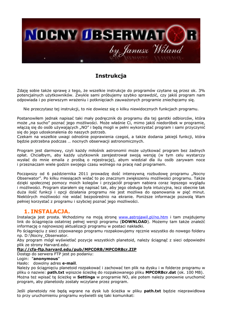 Instrukcja Zdaję sobie takŜe sprawę z tego, Ŝe wszelkie instrukcje do programów czytane są przez ok. 3% potencjalnych uŜytkowników. Zwykle sami próbujemy szybko sprawdzić, czy jakiś program nam odpowiada i po pierwszym wraŜeniu i potknięciach zauwaŜonych programie zniechęcamy się. Nie przeczytasz tej instrukcji, to nie dowiesz się o kilku niewidocznych funkcjach programu. Postanowiłem jednak napisać taki mały podręcznik do programu dla tej garstki odbiorców, która moŜe „na sucho” poznać jego moŜliwości. MoŜe właśnie Ci, mimo jakiś niedoróbek w programie, włączą się do osób uŜywających „NO” i będą mogli w pełni wykorzystać program i sami przyczynić się do jego udoskonalenia do naszych potrzeb. Czekam na wszelkie uwagi odnośnie poprawienia czegoś, a takŜe dodania jakiejś funkcji, która będzie potrzebna podczas … nocnych obserwacji astronomicznych. Program jest darmowy, czyli kaŜdy miłośnik astronomii moŜe uŜytkować program bez Ŝadnych opłat. Chciałbym, aby kaŜdy uŜytkownik zarejestrował swoją wersję (w tym celu wystarczy wysłać do mnie emaila z prośbą o rejestrację), abym wiedział dla ilu osób zarywam noce i przeznaczam wiele godzin swojego czasu wolnego na pracę nad programem. Począwszy od 6 października 2011 prowadzę dość intensywną rozbudowę programu „Nocny Obserwator”. Po kilku miesiącach widać to po znacznym zwiększeniu moŜliwości programu. TakŜe dzięki społecznej pomocy moich kolegów i przyjaciół program nabiera coraz lepszego wyglądu i moŜliwości. Program starałem się napisać tak, aby jego obsługa była intuicyjna, lecz obecnie tak duŜa ilość funkcji i opcji działania programu nie jest moŜliwa do opanowania w pięć minut. Niektórych moŜliwości nie widać bezpośrednio na ekranie. PoniŜsze informacje pozwolą Wam pełniej korzystać z programu i szybciej poznać jego moŜliwości. 1. INSTALACJA. Instalacja jest prosta. Wchodzimy na moją stronę www.astrojawil.pl/no.htm i tam znajdujemy link do ściągnięcia ostatniej pełnej wersji programu (DOWNLOAD). MoŜemy tam takŜe znaleźć informację o najnowszej aktualizacji programu w postaci nakładki. Po ściągnięciu z sieci zzipowanego programu rozpakowujemy ręcznie wszystko do nowego folderu np. D:\Nocny_Obserwator. Aby program mógł wyświetlać pozycje wszystkich planetoid, naleŜy ściągnąć z sieci odpowiedni plik ze strony Harvard.edu: ftp://cfa-ftp.harvard.edu/pub/MPCORB/MPCORBcr.ZIP Dostęp do serwera FTP jest po podaniu: Login: "anonymous" Hasło: dowolny adres e-mail. NaleŜy po ściągnięciu planetoid rozpakować i zachować ten plik na dysku i w folderze programu w pliku o nazwie: path.txt wpiszcie ścieŜkę do rozpakowanego pliku MPCORBcr.dat (ok. 100 MB). MoŜna teŜ wpisać tę ścieŜkę w Settings w programie NO, ale potem naleŜy ponownie uruchomić program, aby planetoidy zostały wczytane przez program. Jeśli planetoidy nie będą wgrane na dysk lub ścieŜka w pliku path.txt będzie nieprawidłowa to przy uruchomieniu programu wyświetli się taki komunikat: Po instalacji pełnej wersji sprawdzamy tutaj: WWW.astrojawil.pl/no.htm, czy jest jakaś nakładka na program o wyŜszym numerze. Program jest w trakcie rozbudowy i aktualizacje zdarzają się dość często. Jeśli rozbudowa jest znaczna, wraz ze zmianami w katalogach, to moŜe się zdarzyć, Ŝe będzie wymagana ponowna pełna instalacja. Dlatego polecam zachować sobie swój kod do programu gdzieś w komputerze. Teraz program jest juŜ gotowy do uruchomienia. 2. URUCHOMIENIE i USTAWIENIA W folderze programu znajdujemy plik no.exe i klikamy w niego prawym przyciskiem myszy. Z pojawiającego się menu wybieramy „Utwórz skrót”. Powstały „Skrót do no.exe” przewlekamy myszą na pulpit. W ten sposób na pulpicie pojawi się ikonka programu „Nocny Obserwator”. Dwukliknięcie w tę ikonkę uruchamia program. Po ok. 2 sekundach na czarnym tle pojawi się grafika wejściowa, w którą klikamy, aby przejść do programu. Z chwilą uruchomienia NO włącza się w Tryb Nocny, czyli mamy czarne tło, a pozostałe gwiazdki, linie, opisy i grafika jest w tonacji ciemno-czerwonej, ograniczającej oślepianie podczas prowadzenia obserwacji astronomicznych z uŜyciem komputera podczas ciemnych nocy. Po kliknięciu w przycisk moŜemy przejść w Tryb Dzienny, gdzie juŜ mamy dostęp do wszystkich kolorów. Na początku ustawiamy lokalizację naszego miejsca obserwacji. MoŜemy wybrać dowolny punkt wybieramy lokalizację z listy . Jeśli na na kuli ziemskiej. W Ustawieniach tej liście nasze miejsce nie figuruje, to wpisujemy w okienka od góry długość szerokość geograficzną miejsca obserwacji, strefę czasową (dla Polski zawsze +1) oraz czy w danym momencie obowiązuje czas letni czy zimowy. NaleŜy pamiętać, Ŝe w momencie zmiany daty i czasu w programie, czas letni/zimowy nie jest automatycznie zmieniany. W programie mamy moŜliwość ustawienia na 9-ciu lokalizacjach linię ograniczającą widoczność z danego miejsca obserwacji przez domy, drzewa czy inne przeszkody terenowe. Informacje o tych lokalizacjach są w plikach hor1.txt do hor9.txt, które moŜna edytować z programu. Przyciskiem [Poprz] i [Nast] wybieramy lokalizację i klikamy na [Edit], aby móc edytować dane. Od góry podane: Moje okno w Piotrkowie Piotrków Tryb. 20,75 51,80 1 0 PIOTRKOW -090 90 -090 00 -090 12 +040 12 +040 00 +060 00 +060 50 +090 70 +090 00 +090 90 Opis tekstowy miejsca obserwacji Nazwę miejsca Długość geograficzna (+wschodnia , -zachodnia) Szerokość geograficzna (+północna, -południowa) Strefa czasowa (1-Polska, 0-Anglia, 5-Nowy Jork) 0-czas zimowy, 1-czas letni nazwa do zakryć i rocznej widoczności (do 8 LITER) ciąg azymutów (-180° do +180°) i wysokości (0° do 90°) tworzących linię ciągłą po kliknięciu w „Pilocie” w przycisk z domkiem. Podajemy tylko wartości całkowite i koniecznie w pierwszej kolumnie 