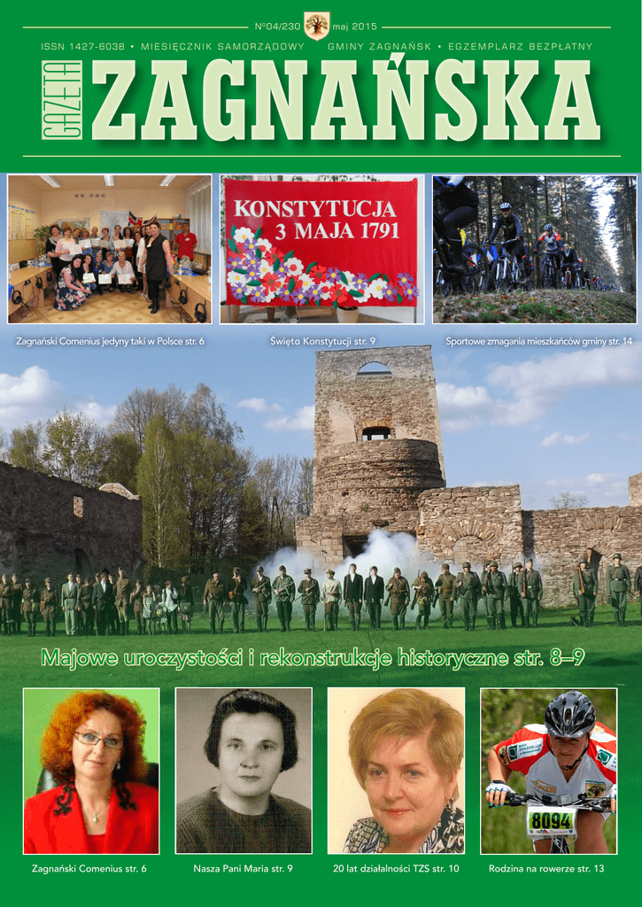 Nº04/230 ISSN 1427-6038 • M I E S I Ę C Z N I K S A M O R Z Ą D O W Y Zagnański Comenius jedyny taki w Polsce str. 6 maj 2015 G M I N Y Z A G N A Ń S K • E G Z E M P LA R Z B E Z P ŁAT N Y Święto Konstytucji str. 9 Sportowe zmagania mieszkańców gminy str. 14 Majowe uroczystości i rekonstrukcje historyczne str. 8–9 Zagnański Comenius str. 6 Nasza Pani Maria str. 9 20 lat działalności TZS str. 10 Rodzina na rowerze str. 13 wydarzenia maj 2015 Promowanie gminy na Agrotravel W dniach od 10 do 12 kwietnia br. na terenie Targów Kielce odbywały się VII Międzynarodowe Targi Turystyki Wiejskiej i Agroturystyki AGROTRAVEL, podczas których wójt Szczepan Skorupski wspólnie z wójtem Miedzianej Góry Zdzisławem Wrzałką promowali gminy LGD „Dorzecza Bobrzy”. Program targów AGROTRAVEL 2015 obejmował prezentacje wystawców krajowych i zagranicznych, oferty atrakcyjnego wypoczynku na wsi, jarmark rękodzielnictwa i wyrobów artystycznych, degustacje potraw regionalnych oraz konkursy dla wystawców i zwiedzających. Apis Podziękowania dla sołtysów i przewodniczących rad sołeckich Na sesji Rady Gminy Zagnańsk w dniu 24 kwietnia br. wójt Szczepan Skorupski oraz wiceprzewodniczący Kazimierz Tomasiak złożyli uroczyste podziękowania sołtysom i przewodniczącym rad sołeckich za zaangażowanie w wykonywanie swoich funkcji oraz w problemy wsi, a także za umiejętność integracji wokół ważnych dla wspólnoty sołeckiej spraw. Podziękowania oraz życzenia wielu sukcesów otrzymali sołtysi przewodniczący rad sołeckich wszystkich sołectw gminy Zagnańsk: Bartków – Stanisław Kundera i Bogusława Długosz, Belno – Sławomir Wiech i Marcin Wiech, Chrusty – Andrzej Staniec i Feliks Grzybowski, Długojów – Zbigniew Karpeta i Anna Cedro, Gruszka – Marcin Fąfara i Anna Wroniewska-Rzońca, Janaszów – Natalia Wójcik i Krystyna Karcz, Jaworze – Jan Olszewski i Hubert Kozieł, Kajetanów – Jan Adach i Tadeusz Król, Kaniów – Andrzej Starz i Janusz Zawrzykraj, Kołomań – Krzysztof Gębski i Andrzej Piwoński, Lekomin – Krzysztof Bernatek i Zdzisław Piskulak, Samsonów – Honorata Durlik i Marta Polak, Szałas – Władysław Zaczkiewicz i Halina Kuncik, Tumlin – Zofia Korska i Leszek Niebudek, Umer – Edward Krzeszowski i Ewa Kiniorska, Zachełmie – Renata Salwa i Kazimierz Salwa, Zagnańsk – Grażyna Wawszczak i Waldemar Wiech. Apis Wyniki wyborów sołtysów w gminie Zagnańsk OBWIESZCZENIE GMINNEJ KOMISJI WYBORCZEJ W ZAGNAŃSKU z dnia 26 kwietnia 2015 r. o wynikach wyborów sołtysów w gminie Zagnańsk odbytych w dniu 26 kwietnia 2015 r. Na podstawie par. 21 oraz 29 Statutów Sołectw (Dz. Urz. Woj. Św. z 9 marca 2015, poz. 820 – 836) Gminna Komisja Wyborcza podaje do wiadomości informacje o wynikach wyborów sołtysów: Lp. Nazwa sołectwa Imię i nazwisko kandydata, liczba ważnych głosów 1. Bartków Krzysztof Gil – 52 • Stanisław Kundera – 79 • Sołtysem wybrany został: STANISŁAW KUNDERA 2. Belno Edward Milcarz – 40 • Sławomir Wiech – 86 • Sołtysem wybrany został: SŁAWOMIR WIECH 3. Chrusty Andrzej Staniec Tak – 51 • Nie – 0 • Sołtysem wybrany został: ANDRZEJ STANIEC 4. Długojów Zbigniew Karpeta • Tak – 37 • Nie – 2 • Sołtysem wybrany został: ZBIGNIEW KARPETA 5. Gruszka Marcin Fąfara • Tak – 29 • Nie – 0 • Sołtysem wybrany został: MARCIN FĄFARA 6. Janaszów Natalia Wójcik • Tak – 62 • Nie – 1 • Sołtysem wybrana została: NATALIA WÓJCIK 7. Jaworze Jan Olszewski • Tak – 64 • Nie – 4 • Sołtysem wybrany został: JAN OLSZEWSKI 8. Kajetanów Jan Adach • Tak – 93 • Nie – 5 • Sołtysem wybrany został: JAN ADACH 9. Kaniów Renata Knez • Tak – 45 • Nie – 4 • Sołtysem wybrana została: RENATA KNEZ 10. Kołomań Małgorzata Bekier-Bochenek – 37 • Aleksandra Kwiatek – 54 Sołtysem wybrana została: ALEKSANDRA KWIATEK 11. Lekomin Krzysztof Bernatek • Tak – 26 • Nie – 4 • Sołtysem wybrany został: KRZYSZTOF BERNATEK 12. Samsonów Honorata Durlik • Tak 137 • Nie – 6 • Sołtysem wybrana została: HONORATA DURLIK 13. Szałas Mieczysław Kondrak – 69 • Halina Kuncik – 82 • Artur Wzorek – 44 Sołtysem wybrana została: HALINA KUNCIK 14. Tumlin Zofia Korska – 274 • Aneta Starz – 117 • Sołtysem wybrana została: ZOFIA KORSKA 15. Umer Ewa Kiniorska – 85 • Edward Krzeszowski – 120 • Sołtysem wybrany został: EDWARD KRZESZOWSKI 16. Zachełmie Włodzimierz Garycki – 81 • Renata Salwa – 74 • Sołtysem wybrany został: WŁODZIMIERZ GARYCKI 17. Zagnańsk Alicja Knez • Tak – 61 • Nie – 4 • Sołtysem wybrana została: ALICJA KNEZ Przewodnicząca Gminnej Komisji Wyborczej Grażyna Wawszczak –2– inwestycje Gazeta Zagnańska Budowa chodnika i poszerzenie drogi w Borowej Górze Trwają intensywne prace przy budowie chodnika i poszerzeniu drogi w miejscowości Borowa Góra. Wykonawca robót Przedsiębiorstwo Budowlane KAMBUD z Tumlina zobowiązane jest umową do zakończenia prac do 29 maja 2015 roku. W ramach inwestycji zostanie poszerzona jezdnia oraz wykonany chodnik przez miejscowość Borowa Góra łącznie do istniejącego placu zabaw. Całość ciągu pieszego połączona będzie z wykonanym wcześniej chodnikiem przy łączniku Kaniów-Borowa Góra i stanowić będzie jeden ciąg komunikacyjny. Zdaniem mieszkańców Borowej Góry, inwestycja ta jest bardzo potrzebna, gdyż spowoduje uatrakcyjnienie miejscowości i znacznie poprawi bezpieczeństwo na drodze. Rozbudowa drogi jest kolejną inwestycją, na którą gmina uzyskała dofinansowanie ze środków pochodzących z PROW – Programu Rozwoju Obszarów Wiejskich, środków Unii Europejskiej. Zadanie nosi nazwę: „Budowa ciągu pieszego w miejscowości Borowa Góra, gm. Zagnańsk”, a umowę na budowę chodnika w Borowej Górze wójt Szczepan Skorupski podpisał z Krzysztofem Domagałą – właścicielem Przedsięb
