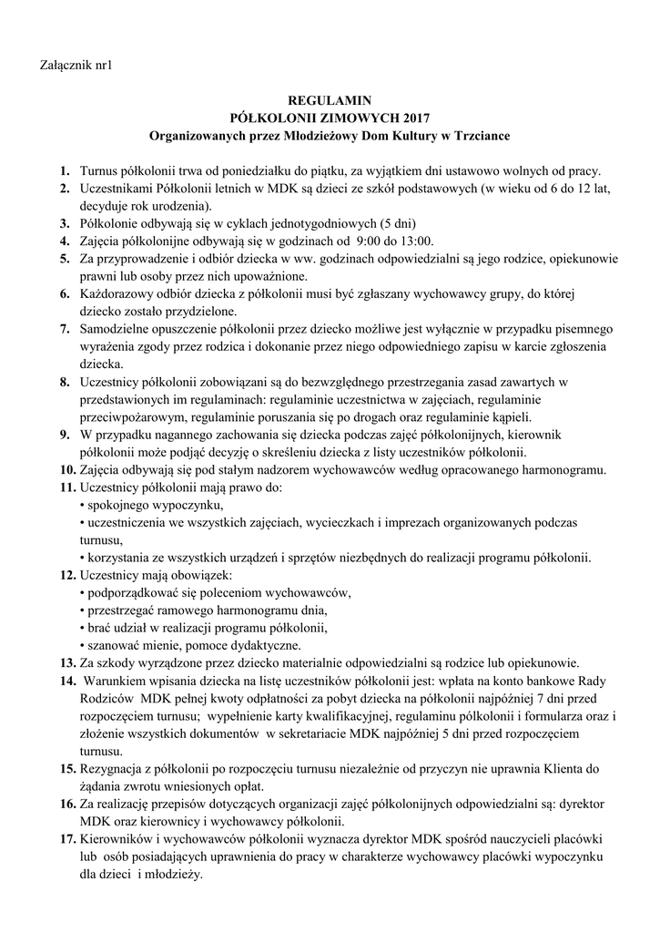 Załącznik nr1 REGULAMIN PÓŁKOLONII ZIMOWYCH 2017 Organizowanych przez Młodzieżowy Dom Kultury w Trzciance 1. Turnus półkolonii trwa od poniedziałku do piątku, za wyjątkiem dni ustawowo wolnych od pracy. 2. Uczestnikami Półkolonii letnich w MDK są dzieci ze szkół podstawowych (w wieku od 6 do 12 lat, decyduje rok urodzenia). 3. Półkolonie odbywają się w cyklach jednotygodniowych (5 dni) 4. Zajęcia półkolonijne odbywają się w godzinach od 9:00 do 13:00. 5. Za przyprowadzenie i odbiór dziecka w ww. godzinach odpowiedzialni są jego rodzice, opiekunowie prawni lub osoby przez nich upoważnione. 6. Każdorazowy odbiór dziecka z półkolonii musi być zgłaszany wychowawcy grupy, do której dziecko zostało przydzielone. 7. Samodzielne opuszczenie półkolonii przez dziecko możliwe jest wyłącznie w przypadku pisemnego wyrażenia zgody przez rodzica i dokonanie przez niego odpowiedniego zapisu w karcie zgłoszenia dziecka. 8. Uczestnicy półkolonii zobowiązani są do bezwzględnego przestrzegania zasad zawartych w przedstawionych im regulaminach: regulaminie uczestnictwa w zajęciach, regulaminie przeciwpożarowym, regulaminie poruszania się po drogach oraz regulaminie kąpieli. 9. W przypadku nagannego zachowania się dziecka podczas zajęć półkolonijnych, kierownik półkolonii może podjąć decyzję o skreśleniu dziecka z listy uczestników półkolonii. 10. Zajęcia odbywają się pod stałym nadzorem wychowawców według opracowanego harmonogramu. 11. Uczestnicy półkolonii mają prawo do: • spokojnego wypoczynku, • uczestniczenia we wszystkich zajęciach, wycieczkach i imprezach organizowanych podczas turnusu, • korzystania ze wszystkich urządzeń i sprzętów niezbędnych do realizacji programu półkolonii. 12. Uczestnicy mają obowiązek: • podporządkować się poleceniom wychowawców, • przestrzegać ramowego harmonogramu dnia, • brać udział w realizacji programu półkolonii, • szanować mienie, pomoce dydaktyczne. 13. Za szkody wyrządzone przez dziecko materialnie odpowiedzialni są rodzice lub opiekunowie. 14. Warunkiem wpisania dziecka na listę uczestników półkolonii jest: wpłata na konto bankowe Rady Rodziców MDK pełnej kwoty odpłatności za pobyt dziecka na półkolonii najpóźniej 7 dni przed rozpoczęciem turnusu; wypełnienie karty kwalifikacyjnej, regulaminu pólkolonii i formularza oraz i złożenie wszystkich dokumentów w sekretariacie MDK najpóźniej 5 dni przed rozpoczęciem turnusu. 15. Rezygnacja z półkolonii po rozpoczęciu turnusu niezależnie od przyczyn nie uprawnia Klienta do żądania zwrotu wniesionych opłat. 16. Za realizację przepisów dotyczących organizacji zajęć półkolonijnych odpowiedzialni są: dyrektor MDK oraz kierownicy i wychowawcy półkolonii. 17. Kierowników i wychowawców półkolonii wyznacza dyrektor MDK spośród nauczycieli placówki lub osób posiadających uprawnienia do pracy w charakterze wychowawcy placówki wypoczynku dla dzieci i młodzieży. 18. Obowiązki wychowawców półkolonii: sprawowanie pełnej opieki nad powierzonymi uczestnikami zajęć w określonych regulaminem godzinach prowadzenia zajęć; sprawowanie nadzoru nad przestrzeganiem przez dzieci regulaminów pobytu na półkolonii, ze szczególnym uwzględnieniem zasad bezpieczeństwa; współdziałanie z kierownictwem i pozostałymi pracownikami placówki w zakresie opieki nad dziećmi oraz realizacji programu; dbałość o wysoką jakość prowadzonych zajęć programowych. 19. Organizator półkolonii nie bierze odpowiedzialności za zaginięcie cennych przedmiotów będących w posiadaniu dziecka (telefon komórkowy, aparat fotograficzny, pieniądze itp.). 20. Sprawy nieuregulowane niniejszym Regulaminem rozstrzyga się na podstawie Statutu MDK oraz innych przepisów wyższego rzędu. 21. W sytuacji wypadku dziecka podczas zajęć półkolonijnych stosuje się odpowiednio przepisy dotyczące postępowania w razie wypadku w szkołach i placówkach publicznych. Oświadczam, że akceptuję postanowienia niniejszego regulaminu. Jednocześnie wyrażam zgodę na przetwarzanie moich danych osobowych przez Organizatora w celach informacyjnych i marketingowych zgodnie z ustawą z dnia 29.08.97 r. o ochronie danych osobowych (Dz.U. 97.101. 926 ze zmianami). Z treścią powyższego regulaminu zapoznałam/łem się, przyjmuje do wiadomości i akceptuję jego treść. Data i czytelny podpis Rodzica: Data i czytelny podpis Organizatora: …………………………………. ……………………………………….