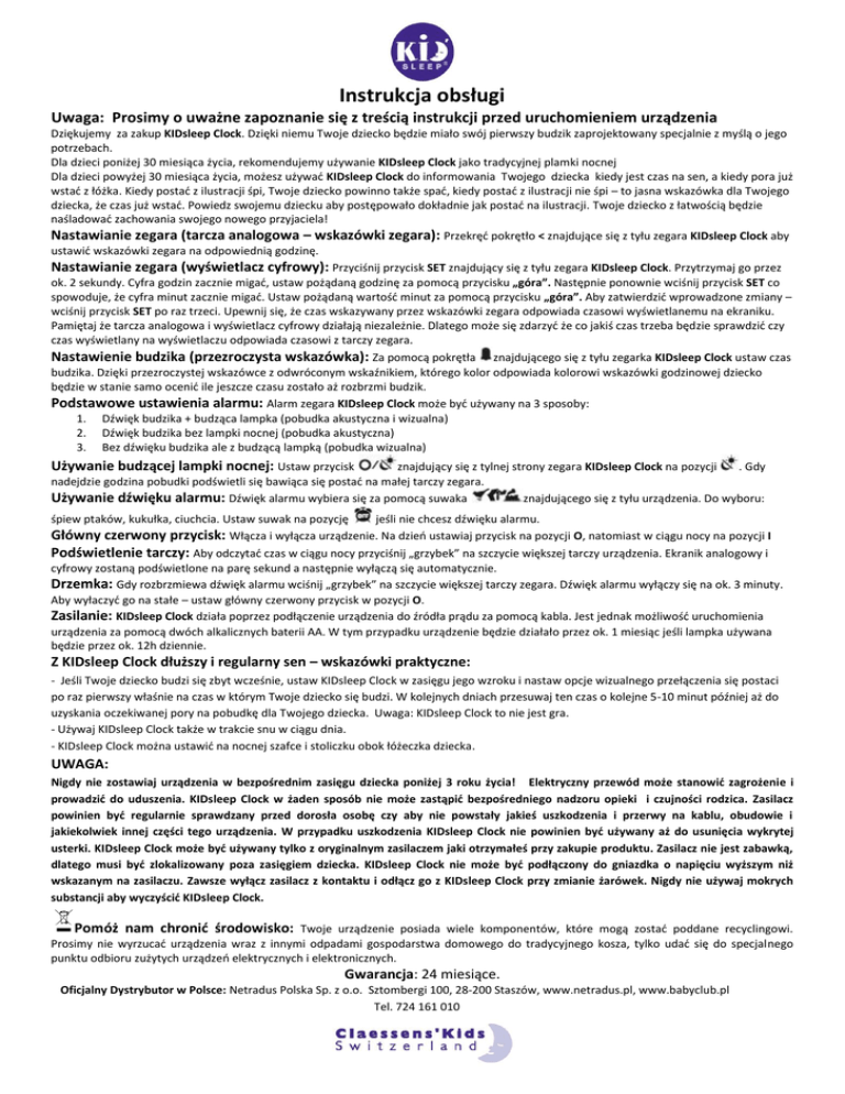 Instrukcja obsługi Uwaga: Prosimy o uważne zapoznanie się z treścią instrukcji przed uruchomieniem urządzenia Dziękujemy za zakup KIDsleep Clock. Dzięki niemu Twoje dziecko będzie miało swój pierwszy budzik zaprojektowany specjalnie z myślą o jego potrzebach. Dla dzieci poniżej 30 miesiąca życia, rekomendujemy używanie KIDsleep Clock jako tradycyjnej plamki nocnej Dla dzieci powyżej 30 miesiąca życia, możesz używad KIDsleep Clock do informowania Twojego dziecka kiedy jest czas na sen, a kiedy pora już wstad z łóżka. Kiedy postad z ilustracji śpi, Twoje dziecko powinno także spad, kiedy postad z ilustracji nie śpi – to jasna wskazówka dla Twojego dziecka, że czas już wstad. Powiedz swojemu dziecku aby postępowało dokładnie jak postad na ilustracji. Twoje dziecko z łatwością będzie naśladowad zachowania swojego nowego przyjaciela! Nastawianie zegara (tarcza analogowa – wskazówki zegara): Przekręd pokrętło < znajdujące się z tyłu zegara KIDsleep Clock aby ustawid wskazówki zegara na odpowiednią godzinę. Nastawianie zegara (wyświetlacz cyfrowy): Przyciśnij przycisk SET znajdujący się z tyłu zegara KIDsleep Clock. Przytrzymaj go przez ok. 2 sekundy. Cyfra godzin zacznie migad, ustaw pożądaną godzinę za pomocą przycisku „góra”. Następnie ponownie wciśnij przycisk SET co spowoduje, że cyfra minut zacznie migad. Ustaw pożądaną wartośd minut za pomocą przycisku „góra”. Aby zatwierdzid wprowadzone zmiany – wciśnij przycisk SET po raz trzeci. Upewnij się, że czas wskazywany przez wskazówki zegara odpowiada czasowi wyświetlanemu na ekraniku. Pamiętaj że tarcza analogowa i wyświetlacz cyfrowy działają niezależnie. Dlatego może się zdarzyd że co jakiś czas trzeba będzie sprawdzid czy czas wyświetlany na wyświetlaczu odpowiada czasowi z tarczy zegara. Nastawienie budzika (przezroczysta wskazówka): Za pomocą pokrętła znajdującego się z tyłu zegarka KIDsleep Clock ustaw czas budzika. Dzięki przezroczystej wskazówce z odwróconym wskaźnikiem, którego kolor odpowiada kolorowi wskazówki godzinowej dziecko będzie w stanie samo ocenid ile jeszcze czasu zostało aż rozbrzmi budzik. Podstawowe ustawienia alarmu: Alarm zegara KIDsleep Clock może byd używany na 3 sposoby: 1. Dźwięk budzika + budząca lampka (pobudka akustyczna i wizualna) 2. Dźwięk budzika bez lampki nocnej (pobudka akustyczna) 3. Bez dźwięku budzika ale z budzącą lampką (pobudka wizualna) Używanie budzącej lampki nocnej: Ustaw przycisk znajdujący się z tylnej strony zegara KIDsleep Clock na pozycji . Gdy nadejdzie godzina pobudki podświetli się bawiąca się postad na małej tarczy zegara. Używanie dźwięku alarmu: Dźwięk alarmu wybiera się za pomocą suwaka znajdującego się z tyłu urządzenia. Do wyboru: śpiew ptaków, kukułka, ciuchcia. Ustaw suwak na pozycję jeśli nie chcesz dźwięku alarmu. Główny czerwony przycisk: Włącza i wyłącza urządzenie. Na dzień ustawiaj przycisk na pozycji O, natomiast w ciągu nocy na pozycji I Podświetlenie tarczy: Aby odczytad czas w ciągu nocy przyciśnij „grzybek” na szczycie większej tarczy urządzenia. Ekranik analogowy i cyfrowy zostaną podświetlone na parę sekund a następnie wyłączą się automatycznie. Drzemka: Gdy rozbrzmiewa dźwięk alarmu wciśnij „grzybek” na szczycie większej tarczy zegara. Dźwięk alarmu wyłączy się na ok. 3 minuty. Aby wyłaczyd go na stałe – ustaw główny czerwony przycisk w pozycji O. Zasilanie: KIDsleep Clock działa poprzez podłączenie urządzenia do źródła prądu za pomocą kabla. Jest jednak możliwośd uruchomienia urządzenia za pomocą dwóch alkalicznych baterii AA. W tym przypadku urządzenie będzie działało przez ok. 1 miesiąc jeśli lampka używana będzie przez ok. 12h dziennie. Z KIDsleep Clock dłuższy i regularny sen – wskazówki praktyczne: - Jeśli Twoje dziecko budzi się zbyt wcześnie, ustaw KIDsleep Clock w zasięgu jego wzroku i nastaw opcje wizualnego przełączenia się postaci po raz pierwszy właśnie na czas w którym Twoje dziecko się budzi. W kolejnych dniach przesuwaj ten czas o kolejne 5-10 minut później aż do uzyskania oczekiwanej pory na pobudkę dla Twojego dziecka. Uwaga: KIDsleep Clock to nie jest gra. - Używaj KIDsleep Clock także w trakcie snu w ciągu dnia. - KIDsleep Clock można ustawid na nocnej szafce i stoliczku obok łóżeczka dziecka. UWAGA: Nigdy nie zostawiaj urządzenia w bezpośrednim zasięgu dziecka poniżej 3 roku życia! Elektryczny przewód może stanowid zagrożenie i prowadzid do uduszenia. KIDsleep Clock w żaden sposób nie może zastąpid bezpośredniego nadzoru opieki i czujności rodzica. Zasilacz powinien byd regularnie sprawdzany przed dorosła osobę czy aby nie powstały jakieś uszkodzenia i przerwy na kablu, obudowie i jakiekolwiek innej części tego urządzenia. W przypadku uszkodzenia KIDsleep Clock nie powinien byd używany aż do usunięcia wykrytej usterki. KIDsleep Clock może byd używany tylko z oryginalnym zasilaczem jaki otrzymałeś przy zakupie produktu. Zasilacz nie jest zabawką, dlatego musi byd zlokalizowany poza zasięgiem dziecka. KIDsleep Clock nie może byd podłączony do gniazdka o napięciu wyższym niż wskazanym na zasilaczu. Zawsze wyłącz zasilacz z kontaktu i odłącz go z KIDsleep Clock przy zmianie żarówek. Nigdy nie używaj mokrych substancji aby wyczyścid KIDsleep Clock. Pomóż nam chronid środowisko: Twoje urządzenie posiada wiele komponentów, które mogą zostad poddane recyclingowi. Prosimy nie wyrzucad urządzenia wraz z innymi odpadami gospodarstwa domowego do tradycyjnego kosza, tylko udad się do specjalnego punktu odbioru zużytych urządzeo elektrycznych i elektronicznych. Gwarancja: 24 miesiące. Oficjalny Dystrybutor w Polsce: Netradus Polska Sp. z o.o. Sztombergi 100, 28-200 Staszów, www.netradus.pl, www.babyclub.pl Tel. 724 161 010