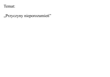 Temat: „Przyczyny nieporozumień” Wieloznaczności i ryzyko sporu słownego (→ logomachii). Supozycje (role znaczeniowe) nazw: prosta: „Wczoraj na podwórku widziałem psa.” „Pies podał mi łapę.” formalna: „Pies jest popularnym zwierzęciem domowym.” materialna: „«Pies» składa się z 4 liter.” Supozycje (role znaczeniowe) czasowników: znaczenie aktualne / znaczenie potencjalne: „Piotr gra w szachy.” Nieporozumienia spowodowane przez okazjonalność: ja, ty, on, ona, tutaj, tam, teraz, dzisiaj, wczoraj, itp. Nieporozumienia spowodowane przez okazjonalność: ja, ty, on, ona, tutaj, tam, teraz, dzisiaj, wczoraj, itp. automatyczne wyrażenia okazjonalne versus wyrażenia wskazujące Nieporozumienia spowodowane przez okazjonalność: referencyjne / anaforyczne użycie wyrażeń okazjonalnych „On jest pilotem” „Piotr jest pilotem. On jest wspaniały!” Nieporozumienia spowodowane przez okazjonalność: „Piotr podarował Jankowi samochód. Chyba go lubię!” Ekwiwokacja: → błąd logiczny powstały na skutek używania w wywodzie tego samego słowa lub zwrotu w różnych znaczeniach, mimo że względy poprawności wymagają, by znaczenie było to samo. Jeśli ktoś jest pełnoletni, może kupić dom. Jeśli ktoś może kupić dom, to ma dużo pieniędzy. Jeśli ktoś jest pełnoletni, to ma dużo pieniędzy. Ekwiwokacja: → błąd logiczny powstały na skutek używania w wywodzie tego samego słowa lub zwrotu w różnych znaczeniach, mimo że względy poprawności wymagają, by znaczenie było to samo. Jeśli Piotr jest inteligentny, to gra w szachy. Jeśli Piotr gra w szachy, to nie może do nas przyjść. Jeśli Piotr jest inteligentny, to nie może do nas przyjść. Ekwiwokacja: → błąd logiczny powstały na skutek używania w wywodzie tego samego słowa lub zwrotu w różnych znaczeniach, mimo że względy poprawności wymagają, by znaczenie było to samo. Pegaz jest skrzydlatym koniem. Pegaz jest. Amfibolie, czyli wieloznaczności składniowe ― wieloznaczność strony czynnej: „Dzieci zjadły rekiny.” „Środki wyznaczają cele.” „Byt określa świadomość.” „Spadek indeksów giełdowych spowodował wzrost bezrobocia.” „Koszty przewyższają dochody.” Amfibolie, czyli wieloznaczności składniowe ― wieloznaczność składni dopełniacza: „krytyka opozycji”, „oskarżenie ministra”, „książka Jana”, „polski obóz koncentracyjny”, „Piotr przedstawił krytykę teorii, która ma wiele luk.” Amfibolie, czyli wieloznaczności składniowe ― wieloznaczność spowodowana brakiem przecinka: „Wypuścić nie wolno rozstrzelać” (treść rozkazu na piśmie). Amfibolie, czyli wieloznaczności składniowe ― inne przykłady: „Jan zakopał skarb wraz z żoną i teściową.” „W przychodni nie przyjmuje się dzieci z gorączką lub obrzękiem szyi i wysypką.” „Zatrudnię osobę potrafiącą obsługiwać komputer i tapicera.”