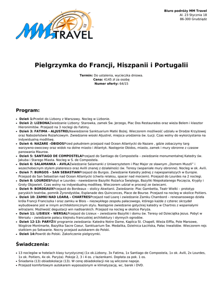 Biuro podróży MM Travel Al. 23 Stycznia 18 86-300 Grudziądz Pielgrzymka do Francji, Hiszpanii i Portugalii Termin: Do ustalenia, wycieczka dniowa. Cena: 4145 zł za osobę Numer oferty: 64/15 Program: ● ● ● ● ● ● ● ● ● ● ● ● ● Dzień 1:Przelot do Lizbony z Warszawy. Nocleg w Lizbonie. Dzień 2: LIZBONAZwiedzanie Lizbony: Starowka, zamek Św. Jerzego, Plac Dos Restaurados oraz wieża Belem i klasztor Hieronimitów. Przejazd na 3 noclegi do Fatimy. Dzień 3: FATIMA - ALJUSTRELNawiedzenie Sanktuarium Matki Bożej. Wieczorem możliwość udziału w Drodze Krzyżowej oraz Nabożeństwie Rożańcowym. Zwiedzanie wioski Aljustrel, miejsca urodzenia św. Łucji. Czas wolny do wykorzystania na indywidualną modlitwę. Dzień 4: NAZARE –OBIDOSPrzed południem przejazd nad Ocean Atlantycki do Nazare , gdzie zobaczymy targ warzywno-owocowy oraz widok na dolne miasto i Atlantyk. Następnie Obidos, miasto, zamek i mury obronne z czasow panowania Maurow. Dzień 5: SANTIAGO DE COMPOSTELAPrzejazd do Santiago de Compostella – zwiedzanie monumentalnej Katedry św. Jakuba i Starego Miasta. Nocleg w S. de Compostela. Dzień 6: SALAMANKA – AVILAZwiedzanie Salamanki z Uniwersytetem i Plaz Major ze sławnym „Domem Muszli” i wszechobecnym stylem plateresco oraz Avilli znanej z działalności św. Teresy (wspaniałe mury obronne). Nocleg w ok. Avili. Dzień 7: BURGOS – SAN SEBASTIANPrzejazd do Burgos. Zwiedzanie Katedry jednej z najwspanialszych w Europie. Przejazd do San Sebastian nad Ocean Atlantycki (chwila relaksu, spacer nad morzem). Przejazd do Lourdes na 2 noclegi. Dzień 8: LOURDESPobyt w Lourdes - nawiedzenie Bazyliki Rożańca Świętego, Bazyliki Niepokalanego Poczęcia, Krypty i Groty Objawień. Czas wolny na indywidualną modlitwę. Wieczorem udział w procesji ze świecami. Dzień 9: BORDEAUXPrzejazd do Bordeaux – stolicy Akwitanii. Zwiedzanie: Plac Gambetta, Teatr Wielki – prototyp paryskich teatrów, pomnik Żyrondystów, Esplanade des Quinconces, Place de Bourse. Przejazd na nocleg w okolice Poitiers. Dzień 10: ZAMKI NAD LOARĄ – CHARTRESPrzejazd nad Loarę i zwiedzanie Zamku Chambord – renesansowego dzieła króla Francji Franciszka I oraz zamku w Blois – niezwykłego zespołu pałacowego, którego każde z czterec skrzydeł wybudowane jest w innym architektonicznym stylu. Następnie zwiedzanie gotyckiej katedry w Chartres z wspaniałymi witrażami. Możliwość degustacji win nadloarskich. Przejazd na nocleg w okolice Paryża. Dzień 11: LISIEUX – WERSALPrzejazd do Lisieux – zwiedzanie Bazyliki i domu św. Teresy od Dzieciątka Jezus. Pobyt w Wersalu – zwiedzanie pałacu klejnotu francuskiej architektury i słynnych ogrodów. Dzień 12-13: PARYŻW programie zwiedzania: Katedra Notre Dame, Kaplica St. Chapell, Wieża Eiffla, Pole Marsowe, Wzgórze Montmarte, Bazylika Sacre Coeur, Sanktuarium Św. Medalika, Dzielnica Łacińska, Pałac Inwalidów. Wieczorem rejs statkiem po Sekwanie. Nocny przejazd autokarem do Polski. Dzień 14:Powrót do Polski. Zakończenie pielgrzymki. Świadczenia: ● ● ● 13 noclegów w hotelach klasy turystycznej (1x ok.Lizbony, 3x Fatima, 1x Santiago de Compostela, 1x ok. Avili, 2x Lourdes, 1x ok. Poitiers, 4x ok. Paryża). Pokoje 2, 3 i 4 os. z łazienkami. Dopłata za pok. 1 os. Śniadania (13) obiadokolacje (13). W cenę obiadokolacji nie są wliczone napoje. Przejazd komfortowym autokarem wyposażonym w klimatyzację, wc, barek i DVD. Biuro podróży MM Travel Al. 23 Stycznia 18 86-300 Grudziądz ● ● ● Bilet na trasie Warszawa - Lizbona wraz z wszelkimi opłatami lotniskowymi Ubezpieczenie KL do 15 000 EUR, NW i bagaż do 800 zł Opieka Pilota Uwagi: KOLEJNOŚC ZWIEDZANIA MOŻE ULEC ZMIANIE. Wydatki programowe Wstępy + przewodnicy miejscowi + komunikacja miejska w Paryżu około 120 euro. Wydatki programowe są opłacane indywidualnie przez uczestników pielgrzymki.