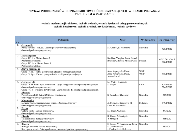 WYKAZ PODRĘCZNIKÓW DO PRZEDMIOTÓW OGÓLNOKSZTAŁCĄCYCH W KLASIE PIERWSZEJ TECHNIKUM W ZAWODACH : technik mechanizacji rolnictwa, technik awionik, technik żywienia i usług gastronomicznych, technik hotelarstwa, technik architektury krajobrazu, technik spedytor Podręcznik Lp. 1. Język polski Ponad słowami . kl.I, cz.I .Zakres podstawowy i rozszerzony do nowej podstawy programowej 2 3. 4. 5. 6. 7. 8. 9. Język angielski Grupa IV. 1r.- Matura Focus 2 Podręcznik wieloletni Grupa IV .1p. - Matura Focus 1 Podręcznik wieloletni Język niemiecki Autor Wydawnictwo M. Chmiel, E. Kostrzewa Nowa Era Sue Kay, Vaughan Jones, Daniel Brayshaw, Bartosz Michałowski Pearson Nr ewidencyjny 425/1/2012 672/2/2013/2015 672/1/2015 Grupa IV .1r. – Fokus 2 podręcznik dla szkół ponadgimnazjalnych Grupa IV .1p. - Focus 1 podręcznik dla szkół ponadgimnazjalnych Anna Kryczyńska-Pham Anna Kryczyńska-Pham, Joanna Szczek Język rosyjski Grupa I V.O -Wot i my 1. Podręcznik - Język rosyjski do szkół ponadgimnazjalnych do nowej podstawy programowej Grupa IV.1p.- Wot i my 2 Podręcznik - Język rosyjski dla szkół ponadgimnazjalnych. HistoriaPoznać przeszłość. Wiek XX Zakres podstawowy do nowej podstawy programowej Matematyka Matematyka w otaczającym nas świecie. Zakres podstawowy do nowej podstawy programowej Fizyka Odkryć fizykę . Zakres podstawowy do nowej podstawy programowej Chemia To jest chemia. Zakres podstawowy do nowej podstawy programowej Biologia Biologia na czasie .Zakres podstawowy. Karty pracy ucznia. Zakres podstawowy do nowej podstawy programowej M. Wiatr – Kmieciak S. Wujec PWN S. Roszak, J. Kłaczkow Nowa Era 525/2012 A. Cewa, M. Krawczyk, M. Kruk. H. Nachorska Podkowa 549/1/2012 M. Braun, W. Śliwa Nowa Era 447/2012 R. Hussa, A. Mrzigod, J. Mrzigod Nowa Era WSiP WSiP E. Bonar, W. Krzeszowiec-Jeleń, Nowa Era S. Czachorowski J. Pawłowski, J. Holeczek 695/1/2014 324/1/2011 324/2/2012 438/2012 450/2012 10. Geografia Oblicza geografii . Zakres podstawowy do nowej podstawy programowej 11. Informatyka Informatyka nie tylko dla uczniów . Zakres podstawowy do nowej podstawy programowej 12. Edukacja dla bezpieczeństwa Żyję i działam bezpiecznie. do nowej podstawy programowej R. Uliszak, K. Wiedermann Nowa Era 433/2012 E. Krawczyński, Z. Talaga, M. Wilk PWN J. Słoma Nowa Era 13. Wiedza o społeczeństwie Ciekawi świata. Zakres podstawowy do nowej podstawy programowej M. Batorski Operon 14. Wiedza o kulturze Spotkanie z kulturą. do nowej podstawy programowej M. Bokiniec B. Forysiewicz J. Michałowski Nowa Era 15. Religia Moje miejsce w Kościele. AZ-41-01/10-PO-1/11 (5 działów) do nowej podstawy programowej- zgodny z programem nauczania AZ-4-01/10 Ks.J. Szpet, D. Jackowiak Św. Wojciech 414/2012 426/2012 469/2012/2015 449/2012 2011 WYKAZ PODRĘCZNIKÓW DO PRZEDMIOTÓW ZAWODOWYCH W KLASIE PIERWSZEJ TECHNIKUM W ZAWODACH: technik mechanizacji rolnictwa 1. 2. 3. 4. Przepisy ruchu drogowego - teoria Kodeks drogowy – aktualny, materiały własne .Podręcznik kierowcy kategorii T Podstawy techniki - teoria Podstawy techniki Rysunek techniczny dla mechaników Użytkowanie maszyn i pojazdów rolniczych - teoria Maszyny rolnicze do produkcji roślinnej. Pojazdy rolnicze. Zajęcia praktyczne - praktyczne Materiały własne opracowane przez nauczyciela ,karty pracy. Podręcznik niewymagany. Karty pracy. W. Kędziora SPH Credo 01/2013 A .Lisowski T.Lewandowski Rea WSiP 01/2008 Cz. Waszkiewicz, J. Kuczewski A .Skrobacki WSiP WSiP 16/1995 technik awionik 1. 2. 3. 4. 5. Podstawy elektrotechniki - teoria Podstawy elektroniki Podstawy elektroniki - teoria Podstawy elektroniki Materiałoznawstwo - teoria Materiały i wyroby metalowe. Materiałoznawstwo lotnicze Pracownia elektroniki i technik pomiarowych - praktyczne Podstawy elektroniki Zajęcia praktyczne - praktyczne Podstawy ślusarstwa. Materiały własne opracowane przez nauczyciela E. Dekler i inni Rea E. Dekler i inni J. Godzimirski J.Chodakowski, A.Ciszewski Rea WAT WAT E. Dekler i inni Rea A.Kosiński WSiP J.Orłowska, M.Tkaczyk Rea R. Tylińska M. Wajgner Rea M. Milewska, A. Stasiak WSiP P. Chomicki M. Samulczyk -Wolska WSiP WSiP A. Kmiołek A. Kmiołek WSiP WSiP A.Kmiołek WSiP 23/2005 23/2005 2009 2003 23/2005 technik hotelarstwa 1. 2. 3. 4. Organizacja pracy w hotelarstwie - teoria Organizacja pracy w hotelarstwie Podstawy prawa w działalności hotelarskiej - teoria Podstawy działalności przedsiębiorstwa hotelarskiego. Tom V Obsługa informatyczna w hotelarstwie - praktyczne Obsługa informatyczna w hotelarstwie + CD - ROM Język obcy zawodowy Język niemiecki. Podręcznik J. niemiecki zawodowy w branży turystyczno - hotelarskiej Język angielski Podręcznik J. angielski zawodowy w branży turystyczno - hotelarskiej 2011 2013 2012 2013 2013 technik żywienia i usług gastronomicznych 1. 2. Technologia gastronomiczna - teoria Technologia gastronomiczna cz. I Sporządzanie napojów i potraw. Towaroznawstwo i przechowywanie żywności. Zajęcia praktyczne – sporządzanie potraw i napojów - praktyczne Pracownia gastronomiczna .Sporządzanie potraw i napojów .Kwalifikacja T..6 Praktyczna nauka zawodu. 2013 21/2013 2015 technik architektury krajobrazu 1. 2. 3. 4. 5. Podstawy projektowania architektury krajobrazu - teoria Podstawy architektury krajobrazu. E. Gadomska, A. Różańska, D Sikora Hortpress Rośliny ozdobne w architekturze krajobrazu - teoria Rośliny ozdobne w architekturze krajobrazu. Cz. I E. Gadomska, P. Sikorski, W. Smogorzewska Hortpress Przepisy ruchu drogowego ( kat. B) - teoria Materiały własne. Kodeks drogowy – aktualny. Podręcznik kierowcy kat. B Uprawa roślin ozdobnych – praktyczne Materiały własne opracowane przez nauczyciela, praca w terenie W. Kędziora SPH Credo Ochrona i kształtowanie krajobrazu - teoria Podstawy architektury krajobrazu. E. Gadomska, A. Różańska, D Sikora Hortpress Podstawy organizacji przedsiębiorstwa transportowo – spedycyjnego - teoria Transport i spedyc