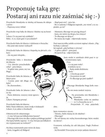 Proponuję taką grę: Postaraj ani razu nie zaśmiać się :-) Przychodzi blondynka ze skórką od banana do sklepu i mówi: - Poproszę nowy wkład. - Skąd pani wie? - pyta Jaś. - Bo w zadaniu 5 Małgosia napisała „nie wiem”, a ty napisałeś „ja też” Przychodzi trup baby do lekarza i kładzie się na kozetce. Lekarz: Co się pani tak rozkłada? Baba : A co, mam gnić w poczekalni?! - Mamusiu, dlaczego ten pociąg skrąca? - Jasiu, nie mówi się skrąca, lecz skręca! - To dlaczego on skręca? - Bo szyna się wygła - odpowiada mama. Przychodzi baba do lekarza z telefonem w brzuchu. - Kto pani taki numer wykręcił? Pani nauczycielka zadała uczniom napisać zdanie: „Piję herbatę z cukrem”. Jaś napisał: „piję herbatę z cytryną”. - A gdzie cukier? - pyta pani. - Rozpuścił się - odpowiada Jaś. Przychodzi baba do lekarza z koparką na plecach, a lekarz: - Ale się pani wkopała... Jasio siedzi w autobusie obok pani w zaawansowanej ciąży. Pyta: - Co się pani stało? A kobieta na to: - Będę miała dzidziusia. Jasiu: - A kocha go pani? - Oczywiście że tak! - To dlaczego go pani zjadła?? Przychodzi baba z dzieckiem do lekarza. - Czy dziecko przechodziło odrę? - pyta lekarz. - Ta gdzie tam, panie, my zza Buga... Przychodzi baba do lekarza, a lekarz pyta: - Czemu pani tak długo nie było? - Bo chorowałam... -Dlaczego blondynka biega koło wanny? -Bo nie może znaleźć wejścia. Przychodzi baba do lekarza i skarży się: - Panie doktorze, wszyscy mnie ignorują. Lekarz: Następny proszę! Przychodzi baba do lekarza; Baba: Panie doktorze, mam wodę w kolanach! Lekarz: A ja cukier w kostkach! obie. Na przystanku stoi blondynka i brunetka. Blondynka czeka na autobus nr 5 a brunetka na nr 7. Przyjechało 57 więc pojechały Jasiu rozmawia z ojcem: Oskarżyciel do oskarżonego: - Tatusiu, chyba muszę iść do okulisty! - A więc był pan już kilkakrotnie karany? - Dlaczego? - Dlaczego nikt teraz nie dba o piękno polskiego języka? - Bo od dawna nie widzę kieszonkowego, które miałeś Nie lepiej byłoby zapytać: "A więc był pan już kilkakrot- mi dawać! nie wypuszczany na wolność?" Uczniowie wchodzą do sali lekcyjnej. Nagle Profesor Na lekcji matematyki pani mówi do Jasia: woła: - Jasiu, ściągałeś od Małgosi! - Jaś Kowalski! Przeczytaj mi swoje zadanie domowe! 2