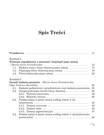 Spis Treści Przedmowa . . . . . . . . . . . . . . . . . . . . . . . . . . . . . . . . . . . . . . . . . . . . . . . . 11 Rozdział 1 Wybrane zagadnienia z anatomii i fizjologii jamy ustnej – Maria Anna Nowakowska . . . . . . . . . . . . . . . . . . . . . . . . . . . . . . . . . . 1.1. Budowa warg i błony śluzowej jamy ustnej . . . . . . . . . . . . . . . 1.2. Fizjologia błony śluzowej jamy ustnej . . . . . . . . . . . . . . . . . . . 1.3. Flora bakteryjna jamy ustnej . . . . . . . . . . . . . . . . . . . . . . . . . . 13 13 19 23 Rozdział 2 Zasady badania pacjenta – Maria Anna Nowakowska, Olga Androsz-Kowalska . . . . . . . . . . . . . . . . . . . . . . . . . . . . . . . . . . . . . . 2.1. Badanie podmiotowe i przedmiotowe oraz badania pomocnicze 2.2. Symptomatologia chorób błony śluzowej . . . . . . . . . . . . . . . . . 2.2.1. Wykwity pierwotne . . . . . . . . . . . . . . . . . . . . . . . . . . . . . 2.2.2. Wykwity wtórne . . . . . . . . . . . . . . . . . . . . . . . . . . . . . . . . 2.3. Podział zmian w jamie ustnej według różnic w ich zabarwieniu . . . . . . . . . . . . . . . . . . . . . . . . . . . . . . . . . . . . . . . . . 2.3.1. Zmiany czerwone . . . . . . . . . . . . . . . . . . . . . . . . . . . . . . . 2.3.2. Zmiany białe . . . . . . . . . . . . . . . . . . . . . . . . . . . . . . . . . . . 2.3.3. Zmiany pigmentacyjne . . . . . . . . . . . . . . . . . . . . . . . . . . 2.4. Podział zmian w jamie ustnej według różnic w ukształtowaniu powierzchni . . . . . . . . . . . . . . . . . . . . . . . . . . . . . . . . . . . . . . . . . . 25 25 29 30 36 42 42 43 47 48 5 Diagnostyka i leczenie chorób błony śluzowej jamy ustnej Rozdział 3 Wady rozwojowe i choroby w obrębie warg i języka – Maria Anna Nowakowska, Jan Kowalski . . . . . . . . . . . . . . . . . . . . . 3.1. Wady szpary ustnej i przedsionka jamy ustnej . . . . . . . . . . . . 3.2. Wady rozwojowe wędzidełek warg . . . . . . . . . . . . . . . . . . . . . . 3.3. Znamiona błony śluzowej jamy ustnej . . . . . . . . . . . . . . . . . . . 3.4. Wady wrodzone podłoża kostnego . . . . . . . . . . . . . . . . . . . . . . . 3.5. Wady wrodzone dziąseł . . . . . . . . . . . . . . . . . . . . . . . . . . . . . . . . 3.6. Wady i choroby warg . . . . . . . . . . . . . . . . . . . . . . . . . . . . . . . . . . 3.7. Zapalenia warg . . . . . . . . . . . . . . . . . . . . . . . . . . . . . . . . . . . . . . . 3.7.1. Zapalenie kątów warg . . . . . . . . . . . . . . . . . . . . . . . . . . . 3.7.2. Gruczołowe zapalenie warg . . . . . . . . . . . . . . . . . . . . . . 3.7.3. Ziarniniakowe zapalenie warg . . . . . . . . . . . . . . . . . . . . 3.7.4. Słoneczne zapalenie warg . . . . . . . . . . . . . . . . . . . . . . . . 3.7.5. Rogowacenie starcze . . . . . . . . . . . . . . . . . . . . . . . . . . . . 3.8. Wady i zapalenia języka . . . . . . . . . . . . . . . . . . . . . . . . . . . . . . . 3.8.1. Wady rozwojowe języka . . . . . . . . . . . . . . . . . . . . . . . . . 3.8.2. Choroby języka . . . . . . . . . . . . . . . . . . . . . . . . . . . . . . . . . Piśmiennictwo do rozdziałów 1, 2, 3 . . . . . . . . . . . . . . . . . . . . . . . . . . . . . 50 50 52 55 57 57 58 65 66 68 69 71 72 73 73 79 89 Rozdział 4 Choroby infekcyjne – Renata Górska, Olga Androsz-Kowalska . . . 4.1. Choroby wirusowe . . . . . . . . . . . . . . . . . . . . . . . . . . . . . . . . . . . . 4.1.1. Choroby wywołane przez wirusy DNA . . . . . . . . . . . . . 4.1.2. Choroby wywołane przez wirusy RNA . . . . . . . . . . . . . 4.2. Infekcje drożdżakowe . . . . . . . . . . . . . . . . . . . . . . . . . . . . . . . . . 4.2.1. Rzekomobłoniasta postać kandydiazy . . . . . . . . . . . . . . 4.2.2. Ostra zanikowa postać kandydiazy . . . . . . . . . . . . . . . . 4.2.3. Przewlekła zanikowa postać kandydiazy . . . . . . . . . . . 4.2.4. Postać przewlekła śluzówkowo-skórna . . . . . . . . . . . . . 4.3. Infekcje bakteryjne . . . . . . . . . . . . . . . . . . . . . . . . . . . . . . . . . . . 4.3.1. Choroby dziąseł pochodzenia bakteryjnego . . . . . . . . . 4.3.2. Martwiczo-wrzodziejące zapalenie dziąseł . . . . . . . . . . 4.3.3. Martwiczo-wrzodziejące zapalenie przyzębia . . . . . . . . Piśmiennictwo . . . . . . . . . . . . . . . . . . . . . . . . . . . . . . . . . . . . . . . . . . . . . . . 90 90 91 101 106 108 110 111 114 115 115 116 118 119 6 Spis treści Rozdział 5 Zakażenie wirusem HIV i zespół nabytego upośledzenia odporności – Olga Androsz-Kowalska, Maciej Zaremba, . . . . . . . . . 121 5.1. Etiopatogeneza . . . . . . . . . . . . . . . . . . . . . . . . . . . . . . . . . . . . . . 122 5.2. Objawy i przebieg kliniczny . . . . . . . . . . . . . . . . . . . . . . . . . . . . 123 5.2.1. Objawy kliniczne pełnoobjawowego zespołu AIDS . . . . . . . . . . . . . . . . . . . . . . . . . . . . . . . . . . 124 5.3. Zmiany na błonie śluzowej jamy ustnej w przebiegu infekcji oportunistycznych . . . . . . . . . . . . . . . . . . . . . . . . . . . . . . . . . . . . 126 5.3.1. Infekcje grzybicze . . . . . . . . . . . . . . . . . . . . . . . . . . . . . . 126 5.3.2. Infekcje wirusowe . . . . . . . . . . . . . . . . . . . . . . . . . . . . . . 128 5.3.3. Infekcje bakteryjne . . . . . . . . . . . . . . . . . . . . . . . . . . . . . 131 5.4. Zmiany nowotworowe na skórze i błonie śluzowej jamy ustnej w przebiegu zakażenia wirusem HIV . . . . . . . . . . . . . . . . . . . . 132 Piśmiennictwo . . . . . . . . . . . . . . . . . . . . . . . . . . . . . . . . . . . . . . . . . . . . . . . 134 Rozdział 6 Aftozy – Maciej Nowak, Renata Górska . . . . . . . . . . . . . . . . . . . . . . . . 6.1. Epidemiologia aft nawracających . . . . . . . . . . . . . . . . . . . . . . . 6.2. Etiologia aft nawracających . . . . . . . . . . . . . . . . . . . . . . . . . . . . 6.3. Afty nawracające . . . . . . . . . . . . . . . . . . . . . . . . . . . . . . . . . . . . . 6.4. Afty Mikulicza (afty małe) . . . . . . . . . . . . . . .