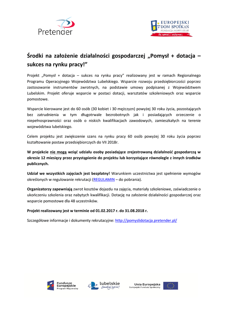 Środki na założenie działalności gospodarczej „Pomysł + dotacja – sukces na rynku pracy!” Projekt „Pomysł + dotacja – sukces na rynku pracy” realizowany jest w ramach Regionalnego Programu Operacyjnego Województwa Lubelskiego. Wsparcie rozwoju przedsiębiorczości poprzez zastosowanie instrumentów zwrotnych, na podstawie umowy podpisanej z Województwem Lubelskim. Projekt oferuje wsparcie w postaci dotacji, warsztatów szkoleniowych oraz wsparcie pomostowe. Wsparcie kierowane jest do 60 osób (30 kobiet i 30 mężczyzn) powyżej 30 roku życia, pozostających bez zatrudnienia w tym długotrwale bezrobotnych jak i posiadających orzeczenie o niepełnosprawności oraz osób o niskich kwalifikacjach zawodowych, zamieszkałych na terenie województwa lubelskiego. Celem projektu jest zwiększenie szans na rynku pracy 60 osób powyżej 30 roku życia poprzez kształtowanie postaw przedsiębiorczych do VII 2018r. W projekcie nie mogą wziąć udziału osoby posiadające zrejestrowaną działalność gospodarczą w okresie 12 miesięcy przez przystąpienie do projektu lub korzystające równolegle z innych środków publicznych. Udział we wszystkich zajęciach jest bezpłatny! Warunkiem uczestnictwa jest spełnienie wymogów określonych w regulowanie rekrutacji (REGULAMIN – do pobrania). Organizatorzy zapewniają zwrot kosztów dojazdu na zajęcia, materiały szkoleniowe, zaświadczenie o ukończeniu szkolenia oraz nabytych kwalifikacji. Dotację na założenie działalności gospodarczej oraz wsparcie pomostowe dla 48 uczestników. Projekt realizowany jest w terminie od 01.02.2017 r. do 31.08.2018 r. Szczegółowe informacje i dokumenty rekrutacyjne: http://pomyslidotacja.pretender.pl/