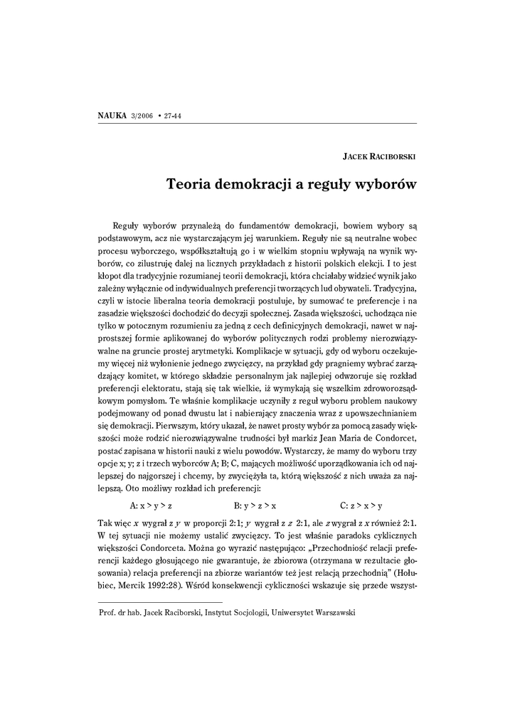 NAUKA 3/2006 • 27-44 JACEK RACIBORSKI Teoria demokracji a reguły wyborów Reguły wyborów przynależą do fundamentów demokracji, bowiem wybory są podstawowym, acz nie wystarczającym jej warunkiem. Reguły nie są neutralne wobec procesu wyborczego, współkształtują go i w wielkim stopniu wpływają na wynik wyborów, co zilustruję dalej na licznych przykładach z historii polskich elekcji. I to jest kłopot dla tradycyjnie rozumianej teorii demokracji, która chciałaby widzieć wynik jako zależny wyłącznie od indywidualnych preferencji tworzących lud obywateli. Tradycyjna, czyli w istocie liberalna teoria demokracji postuluje, by sumować te preferencje i na zasadzie większości dochodzić do decyzji społecznej. Zasada większości, uchodząca nie tylko w potocznym rozumieniu za jedną z cech definicyjnych demokracji, nawet w najprostszej formie aplikowanej do wyborów politycznych rodzi problemy nierozwiązywalne na gruncie prostej arytmetyki. Komplikacje w sytuacji, gdy od wyboru oczekujemy więcej niż wyłonienie jednego zwycięzcy, na przykład gdy pragniemy wybrać zarządzający komitet, w którego składzie personalnym jak najlepiej odwzoruje się rozkład preferencji elektoratu, stają się tak wielkie, iż wymykają się wszelkim zdroworozsądkowym pomysłom. Te właśnie komplikacje uczyniły z reguł wyboru problem naukowy podejmowany od ponad dwustu lat i nabierający znaczenia wraz z upowszechnianiem się demokracji. Pierwszym, który ukazał, że nawet prosty wybór za pomocą zasady większości może rodzić nierozwiązywalne trudności był markiz Jean Maria de Condorcet, postać zapisana w historii nauki z wielu powodów. Wystarczy, że mamy do wyboru trzy opcje x; y; z i trzech wyborców A; B; C, mających możliwość uporządkowania ich od najlepszej do najgorszej i chcemy, by zwyciężyła ta, którą większość z nich uważa za najlepszą. Oto możliwy rozkład ich preferencji: A: x > y > z B: y > z > x C: z > x > y Tak więc wygrał z w proporcji 2:1; wygrał z 2:1, ale wygrał z również 2:1. W tej sytuacji nie możemy ustalić zwycięzcy. To jest właśnie paradoks cyklicznych większości Condorceta. Można go wyrazić następująco: „Przechodniość relacji preferencji każdego głosującego nie gwarantuje, że zbiorowa (otrzymana w rezultacie głosowania) relacja preferencji na zbiorze wariantów też jest relacją przechodnią” (Hołubiec, Mercik 1992:28). Wśród konsekwencji cykliczności wskazuje się przede wszystx y y z z Prof. dr hab. Jacek Raciborski, Instytut Socjologii, Uniwersytet Warszawski x 28 Jacek Raciborski kim możliwość wpływu na wynik głosowania za pomocą manipulacji porządkiem głosowania. Nie brak głosów teoretyków, iż niebezpieczeństwo cykliczności dla praktyki demokracji jest przeceniane, gdyż Condercetowski typ głosowania nie występuje w wyborach powszechnych, a poza tym – jak argumentuje Shapiro (2006: 18) – „(...)można uznać przechodniość za sensowną właściwość racjonalności jednostek, ale nie bardzo wiadomo, dlaczego mielibyśmy brać ją pod uwagę w przypadku decyzji grupowych”. W dalszej krytyce nadwartościowywania paradoksu cyklicznych większości Shapiro zdaje się jednak mylić cykliczność zmian rzeczywistych preferencji wyborców, dzięki czemu możliwa jest alternacja rządów, z cyklicznością agregacji tych preferencji, o której traktują teoretycy racjonalnego wyboru. Czym innym jest rzeczywisty rozkład preferencji w jakiejś populacji i czym innym jest rozkład odwzorowany za pomocą jakiejś reguły agregacji preferencji jednostek składających się na tę populację. I to, najprościej mówiąc, jest wielkim problemem demokracji, zwłaszcza liberalnej. Inny kłopot z zasadą większości, który może wystąpić, gdy wybieramy przedstawicieli w okręgach jednomandatowych, ilustruje przykład zaprezentowany na rysunkach 1-3 (źródło: Golański, Kasprzyk 1999: 34). L P L L P P P P L L P L L P P P P L L P L L P P P P L Ryc. 1. Rozkład preferencji w elektoracie: L = 4 wyborców, P = 5 wyborców Ryc. 2. Rozdział mandatów w 3 okręgach (poziomych): L = 1, P = 2 Ryc. 3. Rozdział mandatów w 3 okręgach (pionowych): L = 2, P = 1 Przykład pokazuje, jak podział na okręgi przy stałych preferencjach wyborców różnicuje rozkład mandatów i może prowadzić do sytuacji, w której partia mniejszościowa (L) uzyskuje więcej mandatów niż partia większościowa (P). Do kwestii tej wypadnie jeszcze powrócić. Teoria demokracji a reguły wyborów 29 Zasada większości zawodzi także w sytuacji oczywistej, o czym trzeba dla porządku wspomnieć, gdy dwie lub więcej opcji (alternatyw – w terminologii teoretyków racjonalnego wyboru, do której nie mogę się przekonać) otrzymują równą liczbę głosów. W wyborach politycznych ordynacje na ogół przewidują taką możliwość i często stanowią, iż w takich przypadkach rozstrzygnięcie następuje drogą losowania. Nie jest moim głównym celem pokazanie ułomności reguły większościowej. Ułomność wszelkich reguł demokratycznego wyboru udowodnił już dawno ekonomista Kenneth J. Arrow w słynnym twierdzeniu o możliwości, które upowszechniło się pod nazwą: twierdzenie o nieistnieniu. Jego ogólny sens, ważny dla naszej problematyki, wyraża się w sformułowaniu, iż przy wyborze spośród co najmniej trzech alternatyw (opcji), dokonywanym przez co najmniej dwóch wyborców, nie istnieje reguła agregacji preferencji indywidualnych, która jednocześnie spełniałaby przyjęte ogólnie normatywne warunki demokratycznego głosowania1. Z wiedzy, że nie ma doskonałych reguł wyborów, nie wynika jednak niemożność oceny, na ile konkretne ordynacje wyborcze realizują demokratyczne postulaty. Te postulaty też są przedmiotem ożywionej dyskusji (Sartori 1994; Dahl 1971), bywają wobec siebie konfliktowe (Raciborski 2001a), a nade wszystko w zderzeniu z praktyką muszą być przyjmowa