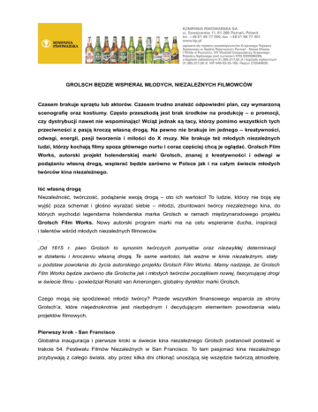 GROLSCH BĘDZIE WSPIERAŁ MŁODYCH, NIEZALEŻNYCH FILMOWCÓW Czasem brakuje sprzętu lub aktorów. Czasem trudno znaleźć odpowiedni plan, czy wymarzoną scenografię oraz kostiumy. Często przeszkodą jest brak środków na produkcję – o promocji, czy dystrybucji nawet nie wspominając! Wciąż jednak są tacy, którzy pomimo wszystkich tych przeciwności z pasją kroczą własną drogą. Na pewno nie brakuje im jednego – kreatywności, odwagi, energii, pasji tworzenia i miłości do X muzy. Nie brakuje też młodych niezależnych ludzi, którzy kochają filmy spoza głównego nurtu i coraz częściej chcą je oglądać. Grolsch Film Works, autorski projekt holenderskiej marki Grolsch, znanej z kreatywności i odwagi w podążaniu własną drogą, wspierać będzie zarówno w Polsce jak i na całym świecie młodych twórców kina niezależnego. Iść własną drogą Niezależność, twórczość, podążanie swoją drogą – oto ich wartości! To ludzie, którzy nie boją się wyjść poza schemat i głośno wyrażać siebie – młodzi, zbuntowani twórcy niezależnego kina, do których wychodzi legendarna holenderska marka Grolsch w ramach międzynarodowego projektu Grolsch Film Works. Nowy autorski program marki ma na celu wspieranie ducha, inspiracji i talentów wśród młodych niezależnych filmowców. . „Od 1615 r. piwo Grolsch to synonim twórczych pomysłów oraz niezwykłej determinacji w działaniu i kroczeniu własną drogą. Te same wartości, tak ważne w kinie niezależnym, stały u podstaw powołania do życia autorskiego projektu Grolsch Film Works. Mamy nadzieje, że Grolsch Film Works będzie zarówno dla Grolscha jak i młodych twórców początkiem nowej, fascynującej drogi w świecie filmu - powiedział Ronald van Amerongen, globalny dyrektor marki Grolsch. Czego mogą się spodziewać młodzi twórcy? Przede wszystkim finansowego wsparcia ze strony Grolsch’a, które niejednokrotnie jest niezbędnym i decydującym elementem powodzenia wielu projektów filmowych. Pierwszy krok - San Francisco Globalna inauguracja i pierwsze kroki w świecie kina niezależnego Grolsch postanowił postawić w trakcie 54. Festiwalu Filmów Niezależnych w San Francisco. To tam pasjonaci kina niezależnego przybywają z całego świata, aby przez kilka dni chłonąć unoszącą się wszędzie twórczą atmosferę. Jednocześnie zebrani goście mają niezwykłą okazję spotkać się ze swoimi guru – reżyserami oraz aktorami. Grolsch, jako sponsor San Francisco International Film Festival, obecny jest m.in. w trakcie Pokazu Otwierającego, na którym w dn 24.04 wyświetlony został nowy obraz Mike'a Millsa z Evanem McGregorem w roli głównej - “Amator” oraz odbył się pokaz polskiego filmu „Krzyż i Młyn” Lecha Majewskiego. Marka dba też o to, aby goście festiwalu mogli delektować się przez cały okres trwania festiwalu doskonałym piwem, m.in. na Imprezie Premierowej, która miała miejsce w legendarnej galerii TERRA. „54. Festiwal Filmów Niezależnych w San Francisco to idealna okazja, aby zainagurować naszą nową inicjatywę. Ta szczególna atmosfera wydarzenia i najlepsi twórcy z całego świata stanowią naturalne otoczenie marki, która w trakcie swojej wielowiekowej tradycji zawsze stawiała na niezależność – podkreśla Ronald van Amerongen. Graham Leggat, dyrektor wykonawczy Towarzystwa Filmowego w San Francisco dodaje – „Bardzo nas cieszy, że Grolsch będzie naszym partnerem, gdyż jest to marka będąca synonimem niezależnego myślenia. Grolsch Film Works to świetna inicjatywa, która może bardzo pozytywnie wpłynąć na świadomość tego, czym właściwie jest kino niezależne.” Z myślą o fanach kina niezależnego, którzy nie będą mogli dotrzeć na festiwal, specjalnie powołany reporter marki Grolsch razem z ekipą filmową będzie odwiedzał najważniejsze imprezy festiwalu, skąd będzie relacjonował ich przebieg oraz śledził kuluarowe rozmowy. Więcej już niebawem na: www.grolsch.pl oraz na http://www.facebook.com/Grolsch.Polska Do redaktora: Grolsch. Idziesz własną drogą? Grolsch to wyjątkowa, międzynarodowa marka piwa premium. To piwo dla ludzi niezależnych duchem, podążających własną drogą, którzy doceniają nie tylko jego wyśmienity smak, ale i unikalne zamknięcie typu Swingtop. Grolsch powstaje w jednym z najnowocześniejszych i najbardziej ekologicznych browarów w Europie, w holenderskim mieście Enschede. Swój doskonały smak zawdzięcza unikalnej technice warzenia w niskiej temperaturze. Grolsch to najwyższej jakości holenderskie piwo typu lager, zawierające 5% alkoholu i 11,3% ekstraktu. Najlepiej smakuje podawane w temperaturze 6-8 C. Grolsch to marka dystrybuowana przez Kompanię Piwowarską od sierpnia 2009 roku. Grolsch w Polsce będzie patronował niezależnym wydarzeniom artystycznym, angażując się także w działania, których celem jest wspieranie niestandardowego sposobu myślenia. Kompania Piwowarska - Lider branży piwowarskiej w Polsce Kompania Piwowarska jest największym przedsiębiorstwem piwowarskim w Polsce. Kilkusetletnie doświadczenia w warzeniu piwa, nowoczesne technologie i rygorystyczne przestrzeganie zasad produkcji na światowym poziomie gwarantują najwyższą jakość naszych produktów. Do portfela marek KP należą najpopularniejsze polskie piwa - m.in. Tyskie, Żubr, Lech, Dębowe Mocne, Redd's, a także międzynarodowe marki premium: Pilsner Urquell, Grolsch oraz Peroni Nastro Azzurro. Kompania Piwowarska (utworzona w 1999 roku) posiada trzy browary (w Tychach, Poznaniu i Białymstoku) oraz oddziały handlowe na terenie całego kraju. Kompania Piwowarska prowadzi także działalność społeczną nastawioną na walkę z wykluczeniem społecznym na tle ubóstwa oraz programy edukacyjne popularyzujące odpowiedzialność i umiar w konsumowaniu alkoholu. Wielkość sprzedaży osiągniętej przez KP w roku finansowym zakończonym 31 marca 2010 r. wynios