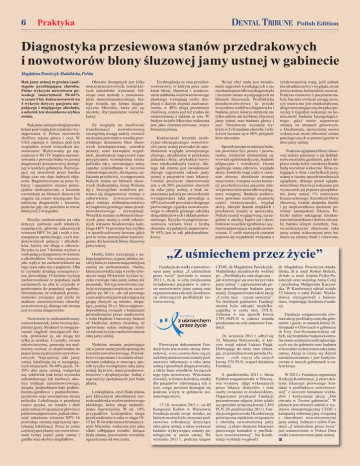 6 Praktyka DENTAL TRIBUNE Polish Edition Diagnostyka przesiewowa stanów przedrakowych i nowotworów błony śluzowej jamy ustnej w gabinecie Magdalena Pawelczyk-Madalińska, Polska Rak jamy ustnej to groźna i podstępnie przebiegająca choroba. Późne wykrycie nowotworu powoduje śmiertelność 50-60% w czasie 5 lat. Jeden nowotwór na 4 wykryte dotyczy pacjenta niepalącego i niepijącego alkoholu, a odsetek ten stosunkowo szybko rośnie. Obecnie dostępnych jest kilka metod przesiewowych, wśród których należałoby wymienić Velscope oraz metody z zastosowaniem monochromatycznego, białego światła, np. lampa diagnostyczna Microlux, które nie są, niestety, zbyt popularne wśród lekarzy. Rak jamy ustnej to drugi po raku krtani pod względem częstości występowania w Polsce nowotwór złośliwy rejonu głowy i szyi. W USA zajmuje 6. miejsce pod tym względem wśród wszystkich nowotworów. Wykrywamy go najczęściej w III i IV stopniu zaawansowania z powodu braku wczesnej diagnostyki przesiewowej dostępnej w każdym gabinecie. Rozwijający się nowotwór przez bardzo długi czas nie daje żadnych objawów. Bagatelizowane są przez lekarzy i pacjentów zmiany potencjalnie niebezpieczne, a leczenie owrzodzeń na błonach śluzowych ciągnie się często miesiącami bez należytej diagnostyki i leczenia, podczas gdy nie powinno to trwać dłużej niż 2-6 tygodni. Ze względu na możliwość transformacji nowotworowej szczególną uwagę należy zwrócić na zmiany powstałe w wyniku przewlekłego drażnienia błon śluzowych (niedopasowane, szorstkie protezy, ostre krawędzie wypełnień, parafunkcje nagryzowe typu przygryzanie wewnętrznej strony policzka itp.), nawracające stany zapalne (zaniedbania w leczeniu stomatologicznym, zła higiena, zakażenia grzybicze), występowanie białych zmian na błonach śluzowych (leukoplakia, liszaj Wilsona itp.). Szczególnie wnikliwie powinno się diagnozować zmiany o zabarwieniu żywoczerwonym, gdyż istnieje niebezpieczeństwo wystąpienia groźnego stanu przednowotworowego – erytroplazji. Wszelkie zmiany na błonach śluzowych jamy ustnej u osób zakażonych wirusem brodawczaka ludzkiego HPV 16 powinny być szybko i w sposób celowany leczone, gdyż jest to wirus potencjalnie kancerogenny dla komórek błony śluzowej jamy ustnej. Ryzyko zachorowania na raka dotyczy zarówno osób młodych, niepalących, głównie zakażonych wirusem HPV 16, jak i osób z tzw. marginesu społecznego, czyli niedożywionych palaczy i alkoholików, którzy nie dbają o zdrowie. Ryzyko to jest 7-krotnie wyższe u osób palących papierosy i 6-krotnie u alkoholików. Nie wiemy jeszcze, jaki wpływ na zachorowalność na tego typu raka ma e-papieros. Oba te czynniki działają synergistycznie, powodując 15-krotnie wyższą zachorowalność w populacji osób narażonych na oba te czynniki w porównaniu do populacji ogólnej. Stwierdzono, że wskaźnik przeżywalności związany jest ściśle ze stadium zaawansowania choroby nowotworowej, dlatego tak istotna jest wczesna diagnostyka. Nowotwór to niekontrolowany rozrost komórek, które tworzą skupienia i guzy. Struktury te mogą naruszać ciągłość otaczających tkanek, przerastać je, ale mogą też tylko je uciskać. Czynniki, zwane rakotwórczymi, generują ten nadmierny rozrost, co doprowadza do pojawienia się procesów nowotworowych. Najczęściej raki jamy ustnej lokalizują się w następujących miejscach: 30-40% język, 1420% dno jamy ustnej, warga/kąt ust, szkliwiak (rak kości wyrostka zębodołowego lub żuchwy), okolica trójkąta zatrzonowcowego, dziąsła, podniebienie/łuki podniebienno-gardłowe i podniebiennojęzykowe oraz wewnętrzna strona policzka. Lokalizacja w przedniej części języka, na wardze i dnie jamy ustnej związana jest głównie z paleniem papierosów, jednak obecność zakażenia wirusem HPV 16 powoduje zmianę najczęściej spotykanej lokalizacji. Przez to coraz częściej spotykamy się z nowotworami tylnej części jamy ustnej i gardła oraz okolicy migdałków. Osoby, które zrezygnują z nałogu (papierosy, cygara, tabaka, żucie tytoniu) z czasem mają mniejszą szansę na zachorowanie. Osoby, które przewlekle żują wyroby tytoniowe mają 50-krotnie wyższe ryzyko rozwoju raka jamy ustnej niż pozostałe. Ten typ nowotworu częściej występuje u mężczyzn, szczególnie po 40 r.ż., ale od pewnego czasu najliczniej powiększającą się grupą chorych są młodzi, niepalący, poniżej 30 r.ż. Ma to najprawdopodobniej związek z badaniami prowadzonymi przez naukowców z John Hopkins University School of Medicine, którzy twierdzą, że uprawianie seksu oralnego może zwiększać ryzyko zachorowania na raka jamy ustnej. Niektóre zmiany pojawiające się w jamie ustnej predysponują do rozrostu nowotworowego. Prawidłowo rozpoznane i wcześnie eliminowane redukują w znaczący sposób ryzyko wystąpienia raka jamy ustnej. Są to tzw. stany przednowotworowe i dysplastyczne. Jedną z najczęściej spotykanych jest biała plama. Leukoplakia, czyli biała plama jest klinicznym określeniem rozrostu nabłonka wielowarstwowego płaskiego, który ulega nadmiernemu rogowaceniu. W ok. 10% przypadków leukoplakia ulega przekształceniu w raka w ciągu 1015 lat. W świetle monochromatycznym Microlux widoczna jest jako silnie odbijająca światło, lśniąca biała plama, przeważnie wyraźnie ograniczona od otoczenia. Erythroplazja to stan przednowotworowy, w którym poza zanikiem błony śluzowej i ścieńczeniem nabłonka wielowarstwowego płaskiego występują cechy dysplazji o dużym stopniu zaawansowania, w 40% ulega przemianie złośliwej, często jest też trudna do różnicowania z rakiem in situ. W białym świetle Microlux widoczna jest jako ciemnoczerwona, wręcz brunatna plama. Konieczność leczenia resekcyjno-chirurgicznego nowotworów jamy ustnej prowadzi do upośledzenia wyglądu zewnętrznego chorego, utrudnienia w połykaniu jedzenia i śliny, ar