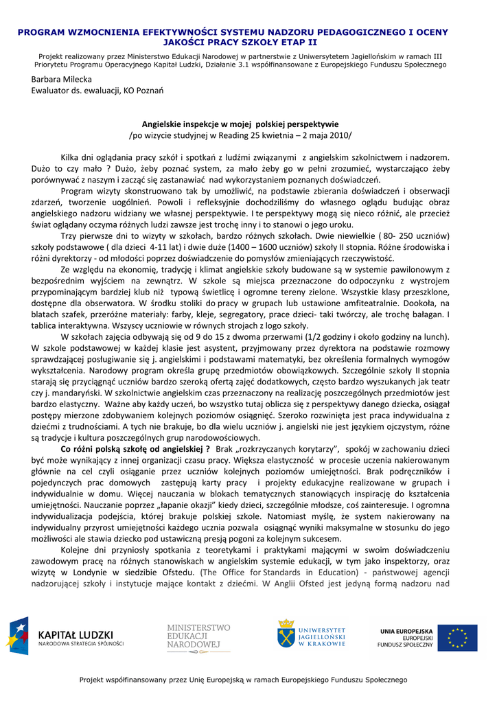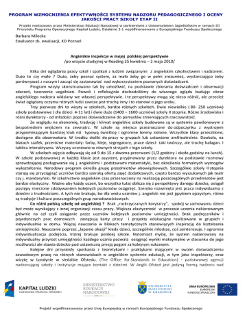 PROGRAM WZMOCNIENIA EFEKTYWNOŚCI SYSTEMU NADZORU PEDAGOGICZNEGO I OCENY JAKOŚCI PRACY SZKOŁY ETAP II Projekt realizowany przez Ministerstwo Edukacji Narodowej w partnerstwie z Uniwersytetem Jagiellońskim w ramach III Priorytetu Programu Operacyjnego Kapitał Ludzki, Działanie 3.1 współfinansowane z Europejskiego Funduszu Społecznego Barbara Milecka Ewaluator ds. ewaluacji, KO Poznań Angielskie inspekcje w mojej polskiej perspektywie /po wizycie studyjnej w Reading 25 kwietnia – 2 maja 2010/ Kilka dni oglądania pracy szkół i spotkań z ludźmi związanymi z angielskim szkolnictwem i nadzorem. Dużo to czy mało ? Dużo, żeby poznać system, za mało żeby go w pełni zrozumieć, wystarczająco żeby porównywać z naszym i zacząć się zastanawiać nad wykorzystaniem poznanych doświadczeń. Program wizyty skonstruowano tak by umożliwić, na podstawie zbierania doświadczeń i obserwacji zdarzeń, tworzenie uogólnień. Powoli i refleksyjnie dochodziliśmy do własnego oglądu budując obraz angielskiego nadzoru widziany we własnej perspektywie. I te perspektywy mogą się nieco różnić, ale przecież świat oglądany oczyma różnych ludzi zawsze jest trochę inny i to stanowi o jego uroku. Trzy pierwsze dni to wizyty w szkołach, bardzo różnych szkołach. Dwie niewielkie ( 80- 250 uczniów) szkoły podstawowe ( dla dzieci 4-11 lat) i dwie duże (1400 – 1600 uczniów) szkoły II stopnia. Różne środowiska i różni dyrektorzy - od młodości poprzez doświadczenie do pomysłów zmieniających rzeczywistość. Ze względu na ekonomię, tradycję i klimat angielskie szkoły budowane są w systemie pawilonowym z bezpośrednim wyjściem na zewnątrz. W szkole są miejsca przeznaczone do odpoczynku z wystrojem przypominającym bardziej klub niż typową świetlicę i ogromne tereny zielone. Wszystkie klasy przeszklone, dostępne dla obserwatora. W środku stoliki do pracy w grupach lub ustawione amfiteatralnie. Dookoła, na blatach szafek, przeróżne materiały: farby, kleje, segregatory, prace dzieci- taki twórczy, ale trochę bałagan. I tablica interaktywna. Wszyscy uczniowie w równych strojach z logo szkoły. W szkołach zajęcia odbywają się od 9 do 15 z dwoma przerwami (1/2 godziny i około godziny na lunch). W szkole podstawowej w każdej klasie jest asystent, przyjmowany przez dyrektora na podstawie rozmowy sprawdzającej posługiwanie się j. angielskimi i podstawami matematyki, bez określenia formalnych wymogów wykształcenia. Narodowy program określa grupę przedmiotów obowiązkowych. Szczególnie szkoły II stopnia starają się przyciągnąć uczniów bardzo szeroką ofertą zajęć dodatkowych, często bardzo wyszukanych jak teatr czy j. mandaryński. W szkolnictwie angielskim czas przeznaczony na realizację poszczególnych przedmiotów jest bardzo elastyczny. Ważne aby każdy uczeń, bo wszystko tutaj oblicza się z perspektywy danego dziecka, osiągał postępy mierzone zdobywaniem kolejnych poziomów osiągnięć. Szeroko rozwinięta jest praca indywidualna z dziećmi z trudnościami. A tych nie brakuje, bo dla wielu uczniów j. angielski nie jest językiem ojczystym, różne są tradycje i kultura poszczególnych grup narodowościowych. Co różni polską szkołę od angielskiej ? Brak „rozkrzyczanych korytarzy”, spokój w zachowaniu dzieci być może wynikający z innej organizacji czasu pracy. Większa elastyczność w procesie uczenia nakierowanym głównie na cel czyli osiąganie przez uczniów kolejnych poziomów umiejętności. Brak podręczników i pojedynczych prac domowych zastępują karty pracy i projekty edukacyjne realizowane w grupach i indywidualnie w domu. Więcej nauczania w blokach tematycznych stanowiących inspirację do kształcenia umiejętności. Nauczanie poprzez „łapanie okazji” kiedy dzieci, szczególnie młodsze, coś zainteresuje. I ogromna indywidualizacja podejścia, której brakuje polskiej szkole. Natomiast myślę, że system nakierowany na indywidualny przyrost umiejętności każdego ucznia pozwala osiągnąć wyniki maksymalne w stosunku do jego możliwości ale stawia dziecko pod ustawiczną presją pogoni za kolejnym sukcesem. Kolejne dni przyniosły spotkania z teoretykami i praktykami mającymi w swoim doświadczeniu zawodowym pracę na różnych stanowiskach w angielskim systemie edukacji, w tym jako inspektorzy, oraz wizytę w Londynie w siedzibie Ofstedu. (The Office for Standards in Education) - państwowej agencji nadzorującej szkoły i instytucje mające kontakt z dziećmi. W Anglii Ofsted jest jedyną formą nadzoru nad Projekt współfinansowany przez Unię Europejską w ramach Europejskiego Funduszu Społecznego PROGRAM WZMOCNIENIA EFEKTYWNOŚCI SYSTEMU NADZORU PEDAGOGICZNEGO I OCENY JAKOŚCI PRACY SZKOŁY ETAP II Projekt realizowany przez Ministerstwo Edukacji Narodowej w partnerstwie z Uniwersytetem Jagiellońskim w ramach III Priorytetu Programu Operacyjnego Kapitał Ludzki, Działanie 3.1 współfinansowane z Europejskiego Funduszu Społecznego szkołami, czyli łączy funkcje spełniane w Polsce przez kontrolę, ewaluację i wspomaganie. Standardowo szkoły podlegają inspekcji raz na trzy lata. W przypadku uzyskiwania dobrych wyników czas ten może być wydłużony do 5 lat, natomiast dla najsłabszych szkół skrócony nawet do 6 tygodni. Inspekcja Ofstedu przeprowadzana jest w ciągu dwóch dni przez kilku inspektorów . Ich ilość zależy głównie od wielkości szkoły. Efektem jest raport o pracy szkoły w różnych obszarach wraz z ocenami w czterostopniowej skali: wyśmienita, dobra, satysfakcjonująca, nie satysfakcjonująca. Najniższa ocena może grozić dymisją dyrektora a nawet upadłością szkoły. Wszyscy dyrektorzy są zgodni, że treść raportu jest tak ważna dla szkoły, że nikt nie pozwoli sobie na jakiekolwiek zaniedbanie w przygotowaniach do inspekcji i w czasie jej trwania, które mogłoby wpłynąć na obniżenie oceny. Bo słowo ocena, w przeciw