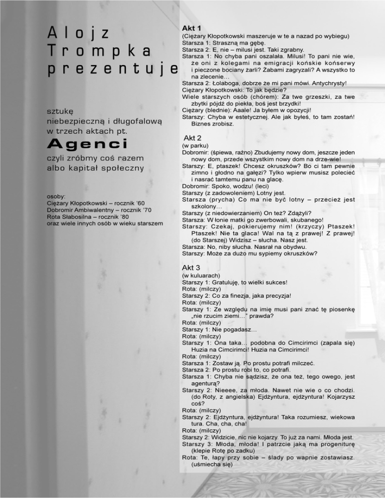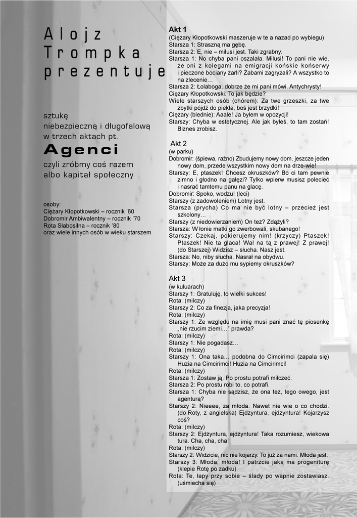 Alojz Tr ompka prezentuje sztukê niebezpieczn¹ i d³ugofalow¹ w trzech aktach pt. Agenci czyli zróbmy co razem albo kapita³ spo³eczny osoby: Ciê¿ary K³opotkowski rocznik 60 Dobromir Ambiwalentny rocznik 70 Rota S³abosilna rocznik 80 oraz wiele innych osób w wieku starszem Akt 1 (Ciê¿ary K³opotkowski maszeruje w te a nazad po wybiegu) Starsza 1: Straszn¹ ma gêbê. Starsza 2: E, nie milusi jest. Taki zgrabny. Starsza 1: No chyba pani oszala³a. Milusi! To pani nie wie, ¿e oni z kolegami na emigracji koñskie koñserwy i pieczone bociany ¿arli? ¯abami zagryzali? A wszystko to na zlecenie Starsza 2: £olaboga, dobrze ¿e mi pani mówi. Antychrysty! Ciê¿ary K³opotkowski: To jak bêdzie? Wiele starszych osób (chórem): Za twe grzeszki, za twe zbytki pójd do piek³a, bo jest brzydki! Ciê¿ary (blednie): Aaale! Ja by³em w opozycji! Starszy: Chyba w estetycznej. Ale jak by³e, to tam zostañ! Biznes zrobisz. Akt 2 (w parku) Dobromir: (piewa, rano) Zbudujemy nowy dom, jeszcze jeden nowy dom, przede wszystkim nowy dom na drze-wie! Starszy: E, ptaszek! Chcesz okruszków? Bo ci tam pewnie zimno i g³odno na ga³êzi? Tylko wpierw musisz polecieæ i nasraæ tamtemu panu na glacê. Dobromir: Spoko, wodzu! (leci) Starszy (z zadowoleniem) Lotny jest. Starsza (prycha) Co ma nie byæ lotny przecie¿ jest szkolony Starszy (z niedowierzaniem) On te¿? Zd¹¿yli? Starsza: W ³onie matki go zwerbowali, skubanego! Starszy: Czekaj, pokierujemy nim! (krzyczy) Ptaszek! Ptaszek! Nie ta glaca! Wal na t¹ z prawej! Z prawej! (do Starszej) Widzisz s³ucha. Nasz jest. Starsza: No, niby s³ucha. Nasra³ na obydwu. Starszy: Mo¿e za du¿o mu sypiemy okruszków? Akt 3 (w kuluarach) Starszy 1: Gratulujê, to wielki sukces! Rota: (milczy) Starszy 2: Co za finezja, jaka precyzja! Rota: (milczy) Starszy 1: Ze wzglêdu na imiê musi pani znaæ tê piosenkê nie rzucim ziemi prawda? Rota: (milczy) Starszy 1: Nie pogadasz Rota: (milczy) Starszy 1: Ona taka podobna do Cimcirimci (zapala siê) Huzia na Cimcirimci! Huzia na Cimcirimci! Rota: (milczy) Starsza 1: Zostaw j¹. Po prostu potrafi milczeæ. Starsza 2: Po prostu robi to, co potrafi. Starsza 1: Chyba nie s¹dzisz, ¿e ona te¿, tego owego, jest agentur¹? Starszy 2: Nieeee, za m³oda. Nawet nie wie o co chodzi. (do Roty, z angielska) Ejd¿yntura, ejd¿yntura! Kojarzysz co? Rota: (milczy) Starszy 2: Ejd¿yntura, ejd¿yntura! Taka rozumiesz, wiekowa tura. Cha, cha, cha! Rota: (milczy) Starszy 2: Widzicie, nic nie kojarzy. To ju¿ za nami. M³oda jest. Starszy 3: M³oda, m³oda! I patrzcie jak¹ ma progeniturê (klepie Rotê po zadku) Rota: Te, ³apy przy sobie lady po wapnie zostawiasz. (umiecha siê)