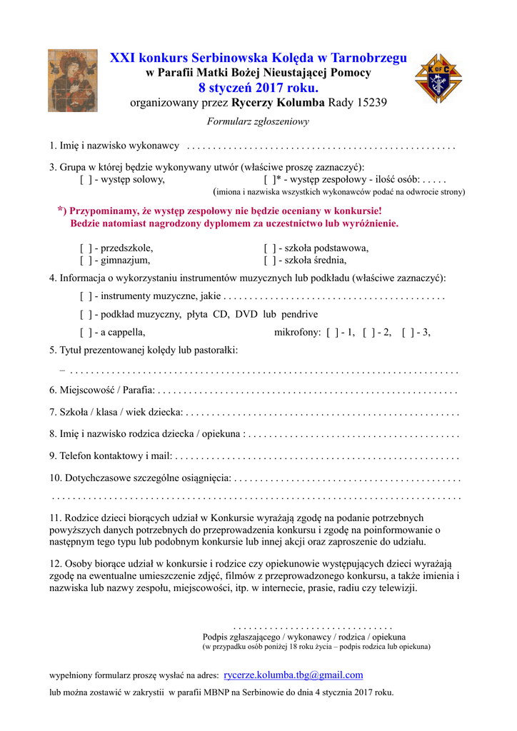 XXI konkurs Serbinowska Kolęda w Tarnobrzegu w Parafii Matki Bożej Nieustającej Pomocy 8 styczeń 2017 roku. organizowany przez Rycerzy Kolumba Rady 15239 Formularz zgłoszeniowy 1. Imię i nazwisko wykonawcy . . . . . . . . . . . . . . . . . . . . . . . . . . . . . . . . . . . . . . . . . . . . . . . . . . . . 3. Grupa w której będzie wykonywany utwór (właściwe proszę zaznaczyć): [ ] - występ solowy, [ ]* - występ zespołowy - ilość osób: . . . . . (imiona i nazwiska wszystkich wykonawców podać na odwrocie strony) *) Przypominamy, że występ zespołowy nie będzie oceniany w konkursie! Bedzie natomiast nagrodzony dyplomem za uczestnictwo lub wyróżnienie. [ ] - przedszkole, [ ] - gimnazjum, [ ] - szkoła podstawowa, [ ] - szkoła średnia, 4. Informacja o wykorzystaniu instrumentów muzycznych lub podkładu (właściwe zaznaczyć): [ ] - instrumenty muzyczne, jakie . . . . . . . . . . . . . . . . . . . . . . . . . . . . . . . . . . . . . . . . . . . [ ] - podkład muzyczny, płyta CD, DVD lub pendrive [ ] - a cappella, mikrofony: [ ] - 1, [ ] - 2, [ ] - 3, 5. Tytuł prezentowanej kolędy lub pastorałki: – ........................................................................... 6. Miejscowość / Parafia: . . . . . . . . . . . . . . . . . . . . . . . . . . . . . . . . . . . . . . . . . . . . . . . . . . . . . . . . . . 7. Szkoła / klasa / wiek dziecka: . . . . . . . . . . . . . . . . . . . . . . . . . . . . . . . . . . . . . . . . . . . . . . . . . . . . . 8. Imię i nazwisko rodzica dziecka / opiekuna : . . . . . . . . . . . . . . . . . . . . . . . . . . . . . . . . . . . . . . . . . 9. Telefon kontaktowy i mail: . . . . . . . . . . . . . . . . . . . . . . . . . . . . . . . . . . . . . . . . . . . . . . . . . . . . . . . 10. Dotychczasowe szczególne osiągnięcia: . . . . . . . . . . . . . . . . . . . . . . . . . . . . . . . . . . . . . . . . . . . . ............................................................................... 11. Rodzice dzieci biorących udział w Konkursie wyrażają zgodę na podanie potrzebnych powyższych danych potrzebnych do przeprowadzenia konkursu i zgodę na poinformowanie o następnym tego typu lub podobnym konkursie lub innej akcji oraz zaproszenie do udziału. 12. Osoby biorące udział w konkursie i rodzice czy opiekunowie występujących dzieci wyrażają zgodę na ewentualne umieszczenie zdjęć, filmów z przeprowadzonego konkursu, a także imienia i nazwiska lub nazwy zespołu, miejscowości, itp. w internecie, prasie, radiu czy telewizji. ............................... Podpis zgłaszającego / wykonawcy / rodzica / opiekuna (w przypadku osób poniżej 18 roku życia – podpis rodzica lub opiekuna) wypełniony formularz proszę wysłać na adres: [email protected] lub można zostawić w zakrystii w parafii MBNP na Serbinowie do dnia 4 stycznia 2017 roku.