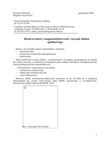 Krzysztof Zbierski1 Zbigniew Kossowski2 1 Instytut Pojazdów Politechniki Łódzkiej tel. 42 631 23 90 2 Centralny Ośrodek Badawczo Rozwojowy Maszyn Włókienniczych „Polmatex-Cenaro” 90-608 Łódź, ul. Wólczańska 55/59 tel. 42 630 19 59, e-mail [email protected] październik 2003 Bezkrzywkowy magnetoelektryczny rozrząd silnika spalinowego Każdy z nas chciałby jeździć samochodem z silnikiem: − ekonomicznym, − przyjaznym środowisku (ekologicznym), − elastycznym. Takie możliwości stwarza silnik z „uzmiennionym” rozrządem, pozwalającym na zmianę faz i skoku zaworów w zależności od warunków pracy silnika. Nad takimi rozrządami pracuje wiele przodujących firm samochodowych. „Uzmiennienie” uzyskiwane jest na drodze: − mechaniczno-elektrycznej, − elektryczno-mechanicznej lub − czysto elektrycznej. Pierwsze układy mechaniczno-elektryczne stosowane są już od kilku lat w seryjnych samochodach np. system Valve-Tronic firmy BMW zastosowany w 4-cylindrowym, benzynowym silniku samochodu BMW 316ti. Rys.1. Rozrząd Valve-Tronic. 1 W rozwiązaniu tym źródłem siły poruszającej zawory jest, jak w układzie klasycznym, układ krzywkowy, ale o zmiennej, regulowanej elektrycznie geometrii. Druga grupa, układy elektryczno-mechaniczne są obecnie testowane na silnikach i samochodach doświadczalnych. Są to rozwiązania firm Siemens i FEV. Schemat. Widok. 1 – zawór 2,3 – górna i dolna cewka elektromagnesu 4 – zwora elektromagnesu 5,6 – górna i dolna sprężyna zaworu Rys.2. Elektryczno - mechaniczny napęd zaworów firmy Siemens. W obu tych konstrukcjach część sił potrzebnych do otwierania i zamykania zaworów wytwarzana jest przez układ sprężyn, a część przez elektromagnesy. Rozrząd magnetoelektryczny, będącym rozwiązaniem autorskim, należy do trzeciej grupy. Wszystkie siły konieczne przy sterowaniu pracą zaworów wytwarzane są na drodze elektrycznej, jako efekt wzajemnego oddziaływania pola magnetycznego i przewodnika z prądem. B I F mr Na przewodnik o długości L przez który płynie prąd I umieszczony w polu magnetycznym o indukcji B oddziałuje siła elektromagnetyczna Fm (siła Lorentza) Fm = B ⋅ I ⋅ L Rys.3. Model fizyczny magnetoelektrycznego napędu zaworów. 2 Wykorzystując powyższe zjawisko zaprojektowany został siłownik magnetoelektryczny do napędu zaworów silnika spalinowego. Schemat. Widok. 7 4 6 3 5 2 8 9 1 1 – zawór, 2 – cewka, 3 – rdzeń, 4,5 – nabiegunniki, 6 – magnes stały, 7,9 – sprężyny doprowadzające prąd, 8 – uchwyt zaworu Rys.4. Magnetoelektryczny napęd zaworów rozrządu. Taka koncepcja rozrządu została zrealizowana i zastosowana w 1-cylindrowym doświadczalnym silniku spalinowym. Rys.5. Doświadczalny 1-cylindrowy silnik z magnetoelektrycznym rozrządem. Działanie rozrządu zostało wstępnie sprawdzone na silniku bez obciążenia, a następnie z obciążeniem silnikiem elektrycznym pracującym jako prądnica. Wykorzystany do sterowania pracą zaworów napęd magnetoelektryczny może mieć zastosowania w innych dziedzinach techniki, tam gdzie potrzebna jest duża szybkość działania i dokładne sterowanie generowaną siłą, np. w automatyce, robotyce, budowie aparatów elektrycznych i maszyn włókienniczych. 3