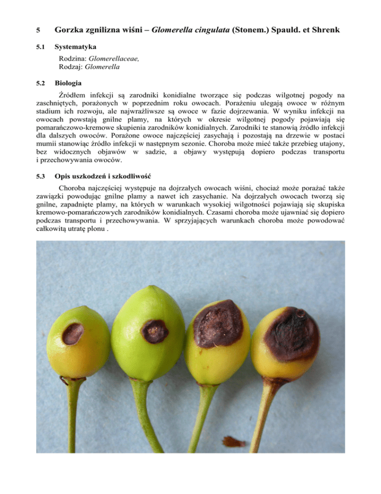 5 Gorzka zgnilizna wiśni – Glomerella cingulata (Stonem.) Spauld. et Shrenk 5.1 Systematyka Rodzina: Glomerellaceae, Rodzaj: Glomerella 5.2 Biologia Źródłem infekcji są zarodniki konidialne tworzące się podczas wilgotnej pogody na zaschniętych, porażonych w poprzednim roku owocach. Porażeniu ulegają owoce w różnym stadium ich rozwoju, ale najwrażliwsze są owoce w fazie dojrzewania. W wyniku infekcji na owocach powstają gnilne plamy, na których w okresie wilgotnej pogody pojawiają się pomarańczowo-kremowe skupienia zarodników konidialnych. Zarodniki te stanowią źródło infekcji dla dalszych owoców. Porażone owoce najczęściej zasychają i pozostają na drzewie w postaci mumii stanowiąc źródło infekcji w następnym sezonie. Choroba może mieć także przebieg utajony, bez widocznych objawów w sadzie, a objawy występują dopiero podczas transportu i przechowywania owoców. 5.3 Opis uszkodzeń i szkodliwość Choroba najczęściej występuje na dojrzałych owocach wiśni, chociaż może porażać także zawiązki powodując gnilne plamy a nawet ich zasychanie. Na dojrzałych owocach tworzą się gnilne, zapadnięte plamy, na których w warunkach wysokiej wilgotności pojawiają się skupiska kremowo-pomarańczowych zarodników konidialnych. Czasami choroba może ujawniać się dopiero podczas transportu i przechowywania. W sprzyjających warunkach choroba może powodować całkowitą utratę plonu . 5.4 Metodyka obserwacji Obserwacje prowadzić w okresie wybarwiania się wiśni (skala BBCH 81-83), zwłaszcza w lata z dużą ilością opadów i w sadach gdzie w poprzednim sezonie choroba występowała w dużym nasileniu. Stopień nasilenia choroby można określić w okresie zbiorów owoców oceniając procent porażonych owoców w 4 miejscach sadu na próbie 100 owoców. Dodatkowo można przeprowadzić oznaczenie porażenia utajonego owoców przeprowadzając obserwacje po 24 lub 48 godzinach przechowywania wiśni w warunkach pokojowych. 5.5 Terminy zabiegów, progi szkodliwości Rozwojowi choroby sprzyjają lata z dużą ilością opadów w okresie dojrzewania wiśni (skala BBCH 75-87). Odmianą szczególnie podatną na gorzką zgniliznę jest ‘Northstar’, ale w lata sprzyjające infekcjom silnie porażone mogą być także inne odmiany, w tym najpowszechniej uprawiana ‘Łutówka’. Liczba opryskiwań musi być ściśle uzależniona od zagrożenia chorobowego. W lata przeciętne dla uzyskania dobrych efektów ochrony wystarczające są trzy zabiegi po kwitnieniu (skala BBCH 7585) wykonane co 2 tygodnie. Natomiast w lata szczególnie sprzyjające infekcjom i w sadach, w których w poprzednich sezonach choroba była notowana, konieczne jest wykonanie czterech pięciu opryskiwań. W lata z dużą ilością opadów ważne są zabiegi w okresie wybarwiania się owoców, zachowując okres karencji.