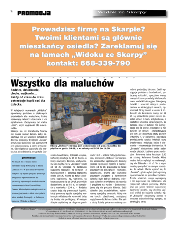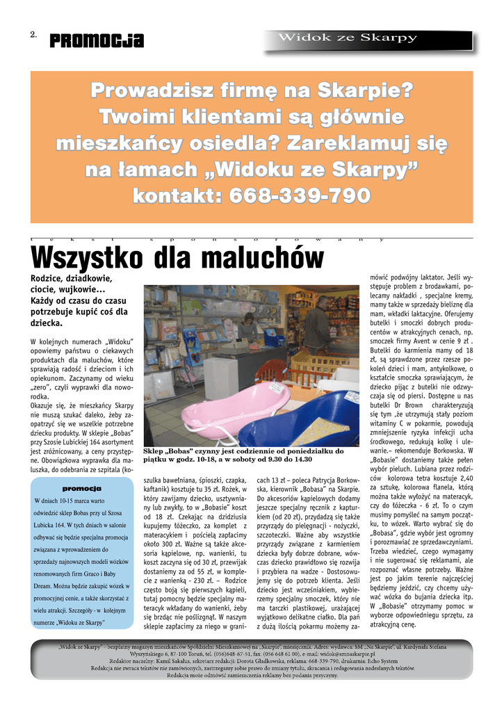 promocja Widok ze Skarpy Prowadzisz firmę na Skarpie? Twoimi klientami są głównie mieszkańcy osiedla? Zareklamuj się na łamach „Widoku ze Skarpy” kontakt: 668-339-790 t e k s t s p o n s o r o w Wszystko dla maluchów a n Rodzice, dziadkowie, ciocie, wujkowie… Każdy od czasu do czasu potrzebuje kupić coś dla dziecka. W kolejnych numerach „Widoku” opowiemy państwu o ciekawych produktach dla maluchów, które sprawiają radość i dzieciom i ich opiekunom. Zaczynamy od wieku „zero”, czyli wyprawki dla noworodka. Okazuje się, że mieszkańcy Skarpy nie muszą szukać daleko, żeby zaopatrzyć się we wszelkie potrzebne dziecku produkty. W sklepie „Bobas” przy Szosie Lubickiej 164 asortyment jest zróżnicowany, a ceny przystępne. Obowiązkowa wyprawka dla maluszka, do odebrania ze szpitala (kopromocja W dniach 10-15 marca warto odwiedzić sklep Bobas przy ul Szosa Lubicka 164. W tych dniach w salonie odbywać się będzie specjalna promocja związana z wprowadzeniem do sprzedaży najnowszych modeli wózków renomowanych firm Graco i Baby Dream. Można będzie zakupić wózek w promocyjnej cenie, a także skorzystać z wielu atrakcji. Szczegóły - w kolejnym numerze „Widoku ze Skarpy” Sklep „Bobas” czynny jest codziennie od poniedziałku do piątku w godz. 10-18, a w soboty od 9.30 do 14.30 szulka bawełniana, śpioszki, czapka, kaftanik) kosztuje tu 35 zł. Rożek, w który zawijamy dziecko, usztywniany lub zwykły, to w „Bobasie” koszt od 18 zł. Czekając na dzidziusia kupujemy łóżeczko, za komplet z materacykiem i pościelą zapłacimy około 300 zł. Ważne są także akcesoria kąpielowe, np. wanienki, tu koszt zaczyna się od 30 zł, przewijak dostaniemy za od 55 zł, w komplecie z wanienką - 230 zł. – Rodzice często boją się pierwszych kąpieli, tutaj pomocny będzie specjalny materacyk wkładany do wanienki, żeby się brzdąc nie poślizgnął. W naszym sklepie zapłacimy za niego w grani- cach 13 zł – poleca Patrycja Borkowska, kierownik „Bobasa” na Skarpie. Do akcesoriów kąpielowych dodamy jeszcze specjalny ręcznik z kapturkiem (od 20 zł), przydadzą się także przyrządy do pielęgnacji - nożyczki, szczoteczki. Ważne aby wszystkie przyrządy związane z karmieniem dziecka były dobrze dobrane, wówczas dziecko prawidłowo się rozwija i przybiera na wadze - Dostosowujemy się do potrzeb klienta. Jeśli dziecko jest wcześniakiem, wybierzemy specjalny smoczek, który nie ma tarczki plastikowej, urażającej wyjątkowo delikatne ciałko. Dla pań z dużą ilością pokarmu możemy za- y mówić podwójny laktator. Jeśli występuje problem z brodawkami, polecamy nakładki , specjalne kremy, mamy także w sprzedaży bieliznę dla mam, wkładki laktacyjne. Oferujemy butelki i smoczki dobrych producentów w atrakcyjnych cenach, np. smoczek firmy Avent w cenie 9 zł . Butelki do karmienia mamy od 18 zł, są sprawdzone przez rzesze pokoleń dzieci i mam, antykolkowe, o kształcie smoczka sprawiającym, że dziecko pijąc z butelki nie odzwyczaja się od piersi. Dostępne u nas butelki Dr Brown charakteryzują się tym ,że utrzymują stały poziom witaminy C w pokarmie, powodują zmniejszenie ryzyka infekcji ucha środkowego, redukują kolkę i ulewanie.– rekomenduje Borkowska. W „Bobasie” dostaniemy także pełen wybór pieluch. Lubiana przez rodziców kolorowa tetra kosztuje 2,40 za sztukę, kolorowa flanela, którą można także wyłożyć na materacyk, czy do łóżeczka - 6 zł. To o czym musimy pomyśleć na samym początku, to wózek. Warto wybrać się do „Bobasa”, gdzie wybór jest ogromny i porozmawiać ze sprzedawczyniami. Trzeba wiedzieć, czego wymagamy i nie sugerować się reklamami, ale rozpoznać własne potrzeby. Ważne jest po jakim terenie najczęściej będziemy jeździć, czy chcemy używać wózka do bujania dziecka itp. W „Bobasie” otrzymamy pomoc w wyborze odpowiedniegu sprzętu, za atrakcyjną cenę.