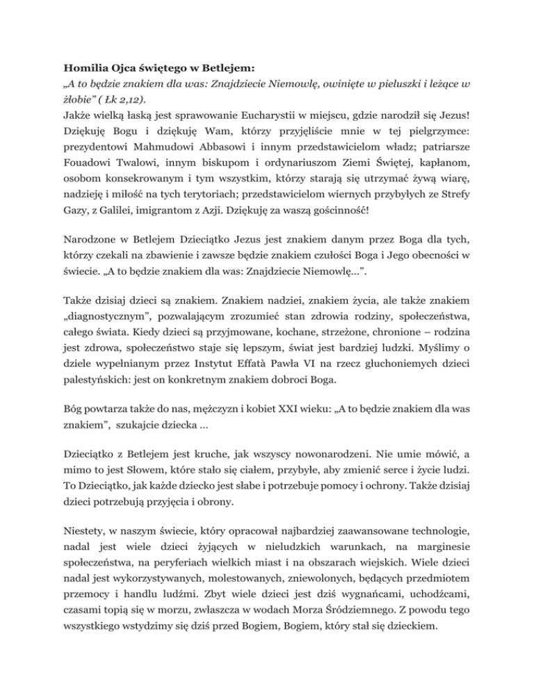 Homilia Ojca świętego w Betlejem: „A to będzie znakiem dla was: Znajdziecie Niemowlę, owinięte w pieluszki i leżące w żłobie” ( Łk 2,12). Jakże wielką łaską jest sprawowanie Eucharystii w miejscu, gdzie narodził się Jezus! Dziękuję Bogu i dziękuję Wam, którzy przyjęliście mnie w tej pielgrzymce: prezydentowi Mahmudowi Abbasowi i innym przedstawicielom władz; patriarsze Fouadowi Twalowi, innym biskupom i ordynariuszom Ziemi Świętej, kapłanom, osobom konsekrowanym i tym wszystkim, którzy starają się utrzymać żywą wiarę, nadzieję i miłość na tych terytoriach; przedstawicielom wiernych przybyłych ze Strefy Gazy, z Galilei, imigrantom z Azji. Dziękuję za waszą gościnność! Narodzone w Betlejem Dzieciątko Jezus jest znakiem danym przez Boga dla tych, którzy czekali na zbawienie i zawsze będzie znakiem czułości Boga i Jego obecności w świecie. „A to będzie znakiem dla was: Znajdziecie Niemowlę…”. Także dzisiaj dzieci są znakiem. Znakiem nadziei, znakiem życia, ale także znakiem „diagnostycznym”, pozwalającym zrozumieć stan zdrowia rodziny, społeczeństwa, całego świata. Kiedy dzieci są przyjmowane, kochane, strzeżone, chronione – rodzina jest zdrowa, społeczeństwo staje się lepszym, świat jest bardziej ludzki. Myślimy o dziele wypełnianym przez Instytut Effatà Pawła VI na rzecz głuchoniemych dzieci palestyńskich: jest on konkretnym znakiem dobroci Boga. Bóg powtarza także do nas, mężczyzn i kobiet XXI wieku: „A to będzie znakiem dla was znakiem”, szukajcie dziecka … Dzieciątko z Betlejem jest kruche, jak wszyscy nowonarodzeni. Nie umie mówić, a mimo to jest Słowem, które stało się ciałem, przybyłe, aby zmienić serce i życie ludzi. To Dzieciątko, jak każde dziecko jest słabe i potrzebuje pomocy i ochrony. Także dzisiaj dzieci potrzebują przyjęcia i obrony. Niestety, w naszym świecie, który opracował najbardziej zaawansowane technologie, nadal jest wiele dzieci żyjących w nieludzkich warunkach, na marginesie społeczeństwa, na peryferiach wielkich miast i na obszarach wiejskich. Wiele dzieci nadal jest wykorzystywanych, molestowanych, zniewolonych, będących przedmiotem przemocy i handlu ludźmi. Zbyt wiele dzieci jest dziś wygnańcami, uchodźcami, czasami topią się w morzu, zwłaszcza w wodach Morza Śródziemnego. Z powodu tego wszystkiego wstydzimy się dziś przed Bogiem, Bogiem, który stał się dzieckiem. I zadajemy sobie pytanie: kim jesteśmy przed Dzieciątkiem Jezus? Kim jesteśmy w obliczu dzisiejszych dzieci? Czy jesteśmy jak Maryja i Józef, którzy przyjęli Jezusa i zatroszczyli się o Niego z miłością macierzyńską i ojcowską? Czy jesteśmy jak Herod, który chce Go wyeliminować? Czy jesteśmy jak pasterze, którzy udają się w pospiechu, klękają, aby oddać Mu pokłon i ofiarowują swoje skromne dary? Czy też jesteśmy obojętni? Czy jesteśmy może pompatyczni i świętoszkowaci, ludźmi wykorzystującymi obrazy biednych dzieci dla osiągnięcia zysku? Czy potrafimy stanąć obok nich, „tracić czas” z nimi? Czy umiemy ich słuchać, strzec, modlić się za nie i wraz z nimi? Czy też je zaniedbujemy, aby zająć się naszymi interesami? „A to będzie znakiem dla was: Znajdziecie Niemowlę…”. Może to dziecko płacze. Płacze, bo jest głodne, bo jest mu zimno, bo chce pozostać w ramionach … Także i dzisiaj dzieci płaczą, bardzo płaczą, a ich płacz jest dla nas wyzwaniem. W świecie, który każdego dnia wyrzuca tony żywności i leków, są dzieci płaczące na próżno z powodu głodu i chorób, którym można z łatwością zapobiec. W czasie głoszącym ochronę nieletnich handluje się bronią, która trafia w ręce dzieci-żołnierzy; handluje się produktami pakowanymi przez małych robotników przymusowych. Ich krzyk jest tłumiony: powinny walczyć, pracować, nie wolno im płakać! Ale płaczą za nie matki, dzisiejsze Rachele: opłakują swoje dzieci i nie chcą utulić się w żalu (por. Mt 2,18). „A to będzie znakiem dla was”. Dzieciątko Jezus narodzone w Betlejem, każde dziecko, które rodzi się i rośnie w każdej części świata jest znakiem diagnostycznym, pozwalającym nam na sprawdzenie stanu zdrowia naszej rodziny, naszej wspólnoty, naszego państwa. Z tej diagnozy szczerej i uczciwej może wypłynąć nowy styl życia, w którym relacje nie byłyby już naznaczone konfliktem, uciskiem, konsumpcjonizmem, ale były by relacjami braterstwa, przebaczenia i pojednania, wzajemnego dzielenia się i miłości. O Maryjo, Matko Jezusa, Która przyjęłaś, naucz nas przyjmować; Która adorowałaś, naucz nas adorować; Ty, która naśladowałaś, naucz nas naśladować. Amen . Tłumaczenie: vatican.va