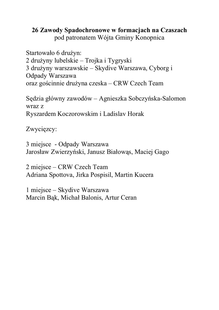 26 Zawody Spadochronowe w formacjach na Czaszach pod patronatem Wójta Gminy Konopnica Startowało 6 drużyn: 2 drużyny lubelskie – Trojka i Tygryski 3 drużyny warszawskie – Skydive Warszawa, Cyborg i Odpady Warszawa oraz gościnnie drużyna czeska – CRW Czech Team Sędzia główny zawodów – Agnieszka Sobczyńska-Salomon wraz z Ryszardem Koczorowskim i Ladislav Horak Zwycięzcy: 3 miejsce - Odpady Warszawa Jarosław Zwierzyński, Janusz Białowąs, Maciej Gago 2 miejsce – CRW Czech Team Adriana Spottova, Jirka Pospisil, Martin Kucera 1 miejsce – Skydive Warszawa Marcin Bąk, Michał Balonis, Artur Ceran