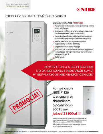 CIEPŁO Z GRUNTU TAŃSZE O 3 000 zł Charakterystyka NIBE F1126/1226 Przeznaczona do ogrzewania i produkcji ciepłej wody użytkowej Niezwykle szybka i prosta konfiguracja pompy ciepła za pomocą kreatora rozruchu Intuicyjny interfejs umożliwia użytkownikowi ustawienie optymalnych parametrów pracy Monochromatyczny wyświetlacz LCD wyposażony w menu pomocy Elegancki, uniwersalny wygląd Gniazdo USB ułatwia serwisowanie urządzenia i aktualizację oprogramowania sterownika do najnowszej wersji Cicha praca POMPY CIEPŁA NIBE F1126/F1226 DO OGRZEWANIA I PRODUKCJI C.W.U. W NIEWIARYGODNIE NISKICH CENACH! Pompa ciepła NIBE F1126 w zestawie ze zbiornikiem o pojemności 300 litrów już od 21 900 zł !!! Promocja trwa od 11.03.2014 r. do 30.06.2014 r. lub do wyczerpania zapasów. Promocją objętych jest łącznie 100 sztuk pomp ciepła NIBE F1126 i NIBE F1226. Więcej informacji o produktach NIBE znajdą Państwo na stronie www.biawar.com.pl NIBE-BIAWAR Sp. z o.o. al. Jana Pawła II 57, 15-703 Białystok, tel. (085) 662-84-90, fax (085) 662-84-81, e-mail: [email protected], infolinia: 0801 003 066 www.biawar.com.pl NIBE F1126 / F1226 POMPY CIEPŁA W NIŻSZYCH CENACH NIBE F1126/F1226 to pompy ciepła nowej generacji typu solanka/ woda lub woda/woda, zaprojektowane do oszczędnego i ekologicznego ogrzewania i produkcji c.w.u. w domach jednoi wielorodzinnych. Pompa ciepła NIBE F1126 umożliwia podłączenie zewnętrznego zbiornika c.w.u. (np. BIAWAR MEGA SOLAR) różnej budowy i pojemności. Z kolei NIBE F1226 to pompa dwufunkcyjna ze zintegrowanym wężownicowym zasobnikiem c.w.u. o poj. 180 litrów z wysokiej klasy izolacją termiczną (Neopor). Pompy ciepła nowej generacji NIBE wyróżnia prostota instalacji i obsługi. Nowoczesny intuicyjny panel sterowania z monochromatycznym wyświetlaczem, wbudowaną instrukcją obsługi, kreatorem rozruchu i menu w języku polskim, pokazuje pełne informacje o statusie pompy, czasie pracy oraz wszystkich parametrach odczytywanych w urządzeniu. Gniazdo USB ułatwia serwisowanie urządzenia i aktualizację oprogramowania sterownika do najnowszej wersji. Systemowe rozwiązania opracowane przez koncern NIBE umożliwiają łączenie pompy ciepła NIBE z modułem FLM, rozszerzającym jej funkcje o wentylację z odzyskiem ciepła. Spójny design i modułowa budowa jednostek pozwalają zachować zwartą bryłę i estetyczny wygląd urządzeń, dzięki czemu pompa ciepła może stanąć w pomieszczeniu pełniącym inne funkcje niż kotłownia, np. w pralni, suszarni, siłowni, a nawet w kuchni. Zestaw z gruntową pompą ciepła F1126 i wymiennikiem biwalentnym MEGA SOLAR do produkcji ciepłej wody użytkowej o pojemności 300 litrów. Kompaktowa gruntowa pompa ciepła F1226 z wbudowanym zbiornikiem ciepłej wody użytkowej o pojemności 180 litrów. Oferta produktowa Cena promocyjna Oferta produktowa Cena promocyjna NIBE F 1126-6kW+ W-E 300.82 A 21 900 zł netto NIBE F 1226-6kW 22 900 zł netto NIBE F 1126-8kW+ W-E 300.82 A 22 900 zł netto NIBE F 1226-8kW 23 900 zł netto NIBE F 1126-11kW+ W-E 300.82 A 25 500 zł netto NIBE F 1226-11kW 26 500 zł netto TYP POMPY CIEPŁA Współczynnik sprawności COP Typoszereg mocy grzewczej NIBE F1126 NIBE F1226 4,71* 4,71* 3-fazy: 6, 8 , 11 3-fazy: 6, 8, 11 Wysokość [mm] 1500 1800 Szerokość [mm] 600 600 Głębokość [mm] 620 620 Poziom hałasu [dB (A)] 44 44 142-173 307-330 - 180 Masa [kg] Pojemność zbiornika ciepłej wody [l] * F1126 i F1226 8kW (B0/W35) (bez uwzględnienia pomp obiegowych) TYP ZBIORNIKÓW MEGA SOLAR W-E 300.82 A Pojemność [l] 300 Powierzchnia wężownicy górnej [m2] 0,92 Powierzchnia wężownicy dolnej [m2] 1,6 Łączna powierzchnia wężownic [m2] 2,52* Masa [kg] 135 Wysokość całkowita [mm] 1622 + 15/-0 Średnica wewnętrzna bez izolacji [mm] 530 Szerokość z izolacją [mm] 738 * Połączenie obu wężownic pozwala na uzyskanie odpowiedniej powierzchni wymiany ciepła. NIBE-BIAWAR Sp. z o.o. al. Jana Pawła II 57, 15-703 Białystok, tel. (085) 662-84-90, fax (085) 662-84-81, e-mail: [email protected], infolinia: 0801 003 066 www.biawar.com.pl