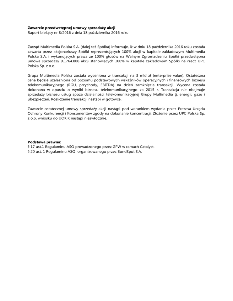 Zawarcie przedwstępnej umowy sprzedaży akcji Raport bieżący nr 8/2016 z dnia 18 października 2016 roku Zarząd Multimedia Polska S.A. (dalej też Spółka) informuje, iż w dniu 18 października 2016 roku została zawarta przez akcjonariuszy Spółki reprezentujących 100% akcji w kapitale zakładowym Multimedia Polska S.A. i wykonujących prawa ze 100% głosów na Walnym Zgromadzeniu Spółki przedwstępna umowa sprzedaży 91.764.808 akcji stanowiących 100% w kapitale zakładowym Spółki na rzecz UPC Polska Sp. z o.o. Grupa Multimedia Polska została wyceniona w transakcji na 3 mld zł (enterprise value). Ostateczna cena będzie uzależniona od poziomu podstawowych wskaźników operacyjnych i finansowych biznesu telekomunikacyjnego (RGU, przychody, EBITDA) na dzień zamknięcia transakcji. Wycena została dokonana w oparciu o wyniki biznesu telekomunikacyjnego za 2015 r. Transakcja nie obejmuje sprzedaży biznesu usług spoza działalności telekomunikacyjnej Grupy Multimedia tj. energii, gazu i ubezpieczeń. Rozliczenie transakcji nastąpi w gotówce. Zawarcie ostatecznej umowy sprzedaży akcji nastąpi pod warunkiem wydania przez Prezesa Urzędu Ochrony Konkurencji i Konsumentów zgody na dokonanie koncentracji. Złożenie przez UPC Polska Sp. z o.o. wniosku do UOKiK nastąpi niezwłocznie. Podstawa prawna: § 17 ust.1 Regulaminu ASO prowadzonego przez GPW w ramach Catalyst. § 20 ust. 1 Regulaminu ASO organizowanego przez BondSpot S.A.