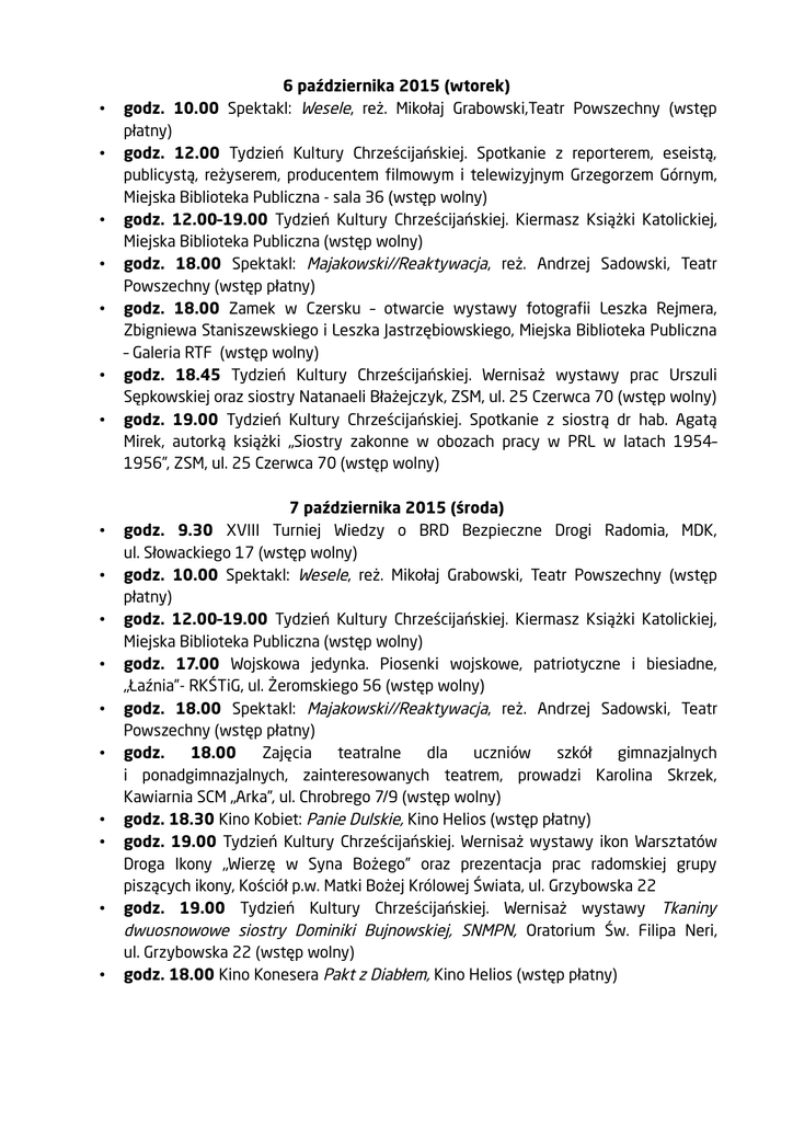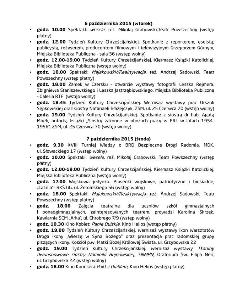 • • • • • • • • • • • • • • • • • 6 października 2015 (wtorek) godz. 10.00 Spektakl: Wesele, reż. Mikołaj Grabowski,Teatr Powszechny (wstęp płatny) godz. 12.00 Tydzień Kultury Chrześcijańskiej. Spotkanie z reporterem, eseistą, publicystą, reżyserem, producentem filmowym i telewizyjnym Grzegorzem Górnym, Miejska Biblioteka Publiczna - sala 36 (wstęp wolny) godz. 12.00–19.00 Tydzień Kultury Chrześcijańskiej. Kiermasz Książki Katolickiej, Miejska Biblioteka Publiczna (wstęp wolny) godz. 18.00 Spektakl: Majakowski//Reaktywacja, reż. Andrzej Sadowski, Teatr Powszechny (wstęp płatny) godz. 18.00 Zamek w Czersku – otwarcie wystawy fotografii Leszka Rejmera, Zbigniewa Staniszewskiego i Leszka Jastrzębiowskiego, Miejska Biblioteka Publiczna – Galeria RTF (wstęp wolny) godz. 18.45 Tydzień Kultury Chrześcijańskiej. Wernisaż wystawy prac Urszuli Sępkowskiej oraz siostry Natanaeli Błażejczyk, ZSM, ul. 25 Czerwca 70 (wstęp wolny) godz. 19.00 Tydzień Kultury Chrześcijańskiej. Spotkanie z siostrą dr hab. Agatą Mirek, autorką książki „Siostry zakonne w obozach pracy w PRL w latach 1954– 1956”, ZSM, ul. 25 Czerwca 70 (wstęp wolny) 7 października 2015 (środa) godz. 9.30 XVIII Turniej Wiedzy o BRD Bezpieczne Drogi Radomia, MDK, ul. Słowackiego 17 (wstęp wolny) godz. 10.00 Spektakl: Wesele, reż. Mikołaj Grabowski, Teatr Powszechny (wstęp płatny) godz. 12.00–19.00 Tydzień Kultury Chrześcijańskiej. Kiermasz Książki Katolickiej, Miejska Biblioteka Publiczna (wstęp wolny) godz. 17.00 Wojskowa jedynka. Piosenki wojskowe, patriotyczne i biesiadne, „Łaźnia”- RKŚTiG, ul. Żeromskiego 56 (wstęp wolny) godz. 18.00 Spektakl: Majakowski//Reaktywacja, reż. Andrzej Sadowski, Teatr Powszechny (wstęp płatny) godz. 18.00 Zajęcia teatralne dla uczniów szkół gimnazjalnych i ponadgimnazjalnych, zainteresowanych teatrem, prowadzi Karolina Skrzek, Kawiarnia SCM „Arka”, ul. Chrobrego 7/9 (wstęp wolny) godz. 18.30 Kino Kobiet: Panie Dulskie, Kino Helios (wstęp płatny) godz. 19.00 Tydzień Kultury Chrześcijańskiej. Wernisaż wystawy ikon Warsztatów Droga Ikony „Wierzę w Syna Bożego” oraz prezentacja prac radomskiej grupy piszących ikony, Kościół p.w. Matki Bożej Królowej Świata, ul. Grzybowska 22 godz. 19.00 Tydzień Kultury Chrześcijańskiej. Wernisaż wystawy Tkaniny dwuosnowowe siostry Dominiki Bujnowskiej, SNMPN, Oratorium Św. Filipa Neri, ul. Grzybowska 22 (wstęp wolny) godz. 18.00 Kino Konesera Pakt z Diabłem, Kino Helios (wstęp płatny) • • • • • • 8 października 2015 (czwartek) godz. 10.00 Spektakl: Wesele, reż. Mikołaj Grabowski, Teatr Powszechny (wstęp płatny) godz. 16.30 Jubileusz Klubu Seniora „Pszczółki” – działającego przy DK „Borki”, DK „Borki” (wstęp za zaproszeniem) godz. 17.00 Tydzień Kultury Chrześcijańskiej. Przegląd teatrów amatorskich z Radomia i okolic, Oratorium Św. Filipa Neri, ul. Grzybowska 22 (wstęp wolny) godz. 18.00 Otwarcie wystawy akwareli Hanny Ozimek, DK „Idalin” (wstęp wolny) godz. 18.00 Kultura Dostępna: Bilet na Księżyc, Kino Helios (wstęp płatny) godz. 18.30 Tydzień Kultury Chrześcijańskiej. Wernisaż wystawy fotografii ks. płk. dr. Leonarda Sadowskiego i Jerzego Bogdana Kutkowskiego „Terra Sancta. Ludzie”, Filia MBP nr 6, ul. Kusocińskiego 13 (wstęp wolny) • • • • • • • • • • • • • • • 9 października 2015 (piątek) godz. 10.00 i 12.00 Spektakl: Baśń o dzielnym Radomirze, reż. Marek Zákostelecký, Teatr Powszechny (wstęp płatny) godz. 11.00 Otwarcie wystawy Dwie szkoły, jedno miasto, Akademicka Galeria Sztuki Pentagon, ul. Malczewskiego 22 (wstęp wolny) godz. 13.00 Obchody Światowego Dnia Zwierząt. Spotkanie z Wojciechem Krupą – radomskim bajkopisarzem, Filia nr 16, ul Barycka 6 (wstęp wolny) godz. 13.00 Otwarcie wystawy Dwie szkoły, jedno miasto, Galeria Sztuki Zespołu Szkół Plastycznych im. J. Brandta, Al. J. Grzecznarowskiego 13 (wstęp wolny) godz. 17.00 Spotkanie poetyckie z Haliną Domaracką-Deją, „Łaźnia”- RKŚTiG, ul. Żeromskiego 56 (wstęp wolny) godz. 17.00 Otwarcie wystawy prac Leszka Kwiatkowskiego, pt. Rysunki, Muzeum Sztuki Współczesnej (wstęp wolny) godz. 18.00 Spektakl: Prawda, reż. Zbigniew Rybka, Teatr Powszechny (wstęp płatny) godz. 18.30 Tydzień Kultury Chrześcijańskiej. Spotkanie z Marią Emanuel Dziemian członkiem Bractwa Najświętszej Maryi Panny Królowej Korony Polski, autorką książki „Moc zawierzenia”, Kościół pw. Świętej Teresy od Dzieciątka Jezus, ul. Wierzbicka 1 (wstęp wolny) godz. 20.00 Spotkanie autorskie z Jarosławem Rabendą, Teatr Powszechny (wstęp wolny) Premiery filmowe: Hotel Transylwania 2; Legend; The Walk. Sięgając chmur, Multikino (wstęp płatny) Premiery filmowe: Hotel Transylwania 2 2D i 3D, Kino Helios (wstęp płatny) 10 października 2015 (sobota) godz. 10.30 i 12.00 Poranki dla dzieci, Multikino (wstęp płatny) godz. 11.00 Sporty motorowe dla osób niepełnosprawnych – uczyńmy świat bliższym, Automobilklub, ul. Warszawska 17/21 (wstęp wolny) godz. 18.00 Spektakl: Prawda, reż. Zbigniew Rybka, Teatr Powszechny (wstęp • • • • • • • • • płatny) godz. 19.00 Spektakl: Mayday, reż. Andrzej Zaorski, Teatr Powszechny (wstęp płatny) godz. 19.00 Tydzień Kultury Chrześcijańskiej. Projekcja filmu October Baby – Każde życie jest cudem, Oratorium Św. Filipa Neri, ul. Grzybowska 22 (wstęp wolny) 11 października 2015 (niedziela) godz. 10.30 Filmowe poranki ze Scooby-Doo, Kino Helios (wstęp płatny) godz. 10.30 i 12.00 Poranki dla dzieci, Multikino (wstęp płatny) godz. 16.00 Tydzień Kultury Chrześcijańskiej. Koncert z okazji XV Dnia Papieskiego w wykonaniu zespołu kleryków Wyższego Seminarium Duchownego w Radomiu „Jak najbardziej”, Oratorium Św. Filipa Neri, ul. Grzybowska 22 (wstęp wolny) godz. 17.00 Spotkanie Klubu Se