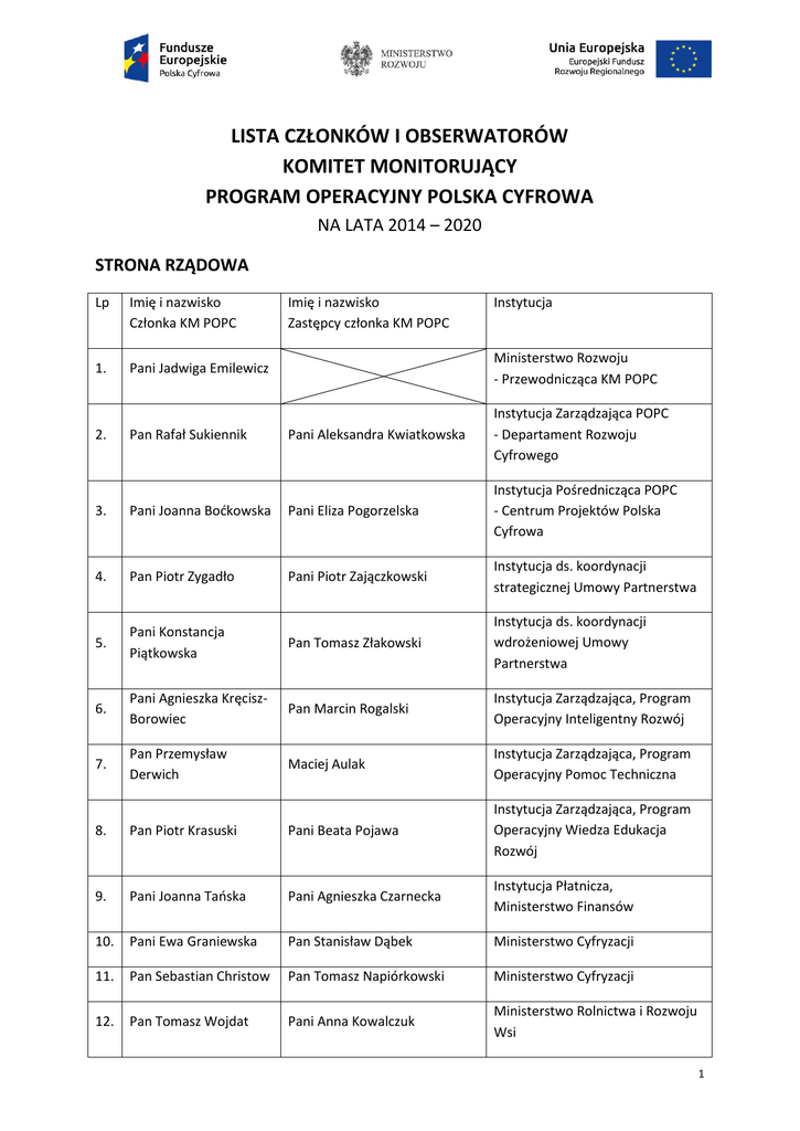 LISTA CZŁONKÓW I OBSERWATORÓW KOMITET MONITORUJĄCY PROGRAM OPERACYJNY POLSKA CYFROWA NA LATA 2014 – 2020 STRONA RZĄDOWA Lp Imię i nazwisko Członka KM POPC Imię i nazwisko Zastępcy członka KM POPC 1. Pani Jadwiga Emilewicz Ministerstwo Rozwoju - Przewodnicząca KM POPC 2. Pan Rafał Sukiennik Pani Aleksandra Kwiatkowska Instytucja Zarządzająca POPC - Departament Rozwoju Cyfrowego 3. Pani Joanna Boćkowska Pani Eliza Pogorzelska Instytucja Pośrednicząca POPC - Centrum Projektów Polska Cyfrowa 4. Pan Piotr Zygadło Pani Piotr Zajączkowski Instytucja ds. koordynacji strategicznej Umowy Partnerstwa 5. Pani Konstancja Piątkowska Pan Tomasz Złakowski Instytucja ds. koordynacji wdrożeniowej Umowy Partnerstwa 6. Pani Agnieszka KręciszBorowiec Pan Marcin Rogalski Instytucja Zarządzająca, Program Operacyjny Inteligentny Rozwój 7. Pan Przemysław Derwich Maciej Aulak Instytucja Zarządzająca, Program Operacyjny Pomoc Techniczna Instytucja 8. Pan Piotr Krasuski Pani Beata Pojawa Instytucja Zarządzająca, Program Operacyjny Wiedza Edukacja Rozwój 9. Pani Joanna Tańska Pani Agnieszka Czarnecka Instytucja Płatnicza, Ministerstwo Finansów 10. Pani Ewa Graniewska Pan Stanisław Dąbek Ministerstwo Cyfryzacji 11. Pan Sebastian Christow Pan Tomasz Napiórkowski Ministerstwo Cyfryzacji 12. Pan Tomasz Wojdat Pani Anna Kowalczuk Ministerstwo Rolnictwa i Rozwoju Wsi 1 13. Pan Przemysław Niedźwiecki Pani Karolina Tylus-Sowa Ministerstwo Kultury i Dziedzictwa Narodowego 14. Pan Janusz Krupa Pani Iwona Kurzępa Ministerstwo Edukacji Narodowej 15. Pan Piotr Dardziński Pani Agnieszka Tykarska Ministerstwo Nauki i Szkolnictwa Wyższego 16. Pan Bogusław Bieda Pan Andrzej Jarzewski b. Ministerstwo Gospodarki 17. Pani Anna Siejda Pan Wojciech Żukowski Ministerstwo Spraw Wewnętrznych i Administracji 18. Pani Agnieszka Kister Pani Anna Goławska Ministerstwo Zdrowia 19. Pan Leszek Grabarczyk Pan Daniel Maksym Narodowe Centrum Badań i Rozwoju 20. Pani Lidia Kozłowska Pani Klaudia Markwat Urząd Komunikacji Elektronicznej 21. Pani Alina WojtowiczPomierna Pani Małgorzata Janicka Pełnomocnik Rządu ds. Osób Niepełnosprawnych 22. Pani Barbara Szymborska Pani Rita Kameduła Tomaszewska Pełnomocnik Rządu ds. Równego Traktowania STRONA SAMORZĄDOWA 23. Pani Barbara Mrozowska-Nieradko Pan Przemysław Janczak Unia Metropolii Polskich 24. Pani Małgorzata Stępień-Przygoda Pan Jerzy Gąska Unia Miasteczek Polskich 25. Pan Sławomir Sosnowski Pan Krzysztof Filiński Związek Województw RP Pan Edward Trojanowski Związek Gmin Wiejskich RP 26. Pan Paweł Tomczak 27. Pan Jan Maciej Czajkowski 28. Pan Adam Andriaszkiewicz Związek Miast Polskich Pan Rudolf Borusiewicz Związek Powiatów Polskich 2 PARTNERZY SPOŁECZNI/GOSPODARCZY/CZŁONKOWIE SPOZA ADMINISTRACJI 29. Pan Rafał Pietruch 30. Pan Dariusz Grabowski Pan Bartłomiej Kubiaczyk Niezależny Samorządny Związek Zawodowy „Solidarność” Ogólnopolskie Porozumienie Związków Zawodowych 31. Pan Janusz Hyjek Pan Piotr Sadowski Forum Związków Zawodowych 32. Pan Piotr Wołejko Pani Beata Kosno Pracodawcy RP 33. Pan Łukasz Dyba Pani Marzena Chmielewska Konfederacja Lewiatan 34. Pani Agnieszka Clarey Pani Halina Matejek -Caban Związek Rzemiosła Polskiego 35. Pan Krzysztof Szubert Pan Marcin Tumanow Business Centre Club – Związek Pracodawców 36. Pan Eugeniusz Gaca Pani Małgorzata Zakrzewska Krajowa Izba Gospodarcza Elektroniki i Telekomunikacji 37. Pan Piotr Marciniak Pani Agnieszka Kuźnicka Krajowa Izba Komunikacji Ethernetowej Pani Małgorzata Kalinowska Polska Izba Informatyki i Telekomunikacji 39. Pan Jerzy Straszewski Pan Józef Kot Polska Izba Komunikacji Elektronicznej 40. Pan Łukasz Broniszewski Pani Katarzyna Sadło Ogólnopolska Federacja Organizacji Pozarządowych 41. Pan Zbigniew Kaliszyk Vacat Członek – Związek Ochotniczych Straży Pożarnych Rzeczypospolitej Polskiej Zastępca – Vacat 42. Pan Artur Marcinkowski Pani Monika Szczygielska Fundacja Widzialni Pani Elżbieta Dydak Członek – Fundacja Aktywizacja Zastępca – Fundacja Rozwoju Społeczeństwa Informacyjnego Pani Katarzyna Werner Fundacja Projekt: Polska 38. Pan Wiesław Paluszyński Pan Bartosz 43. Mioduszewski 44. Pan Aleksander Tarkowski 3 45. Pan Jacek Wojnarowski Pani Justyna Jasiewicz Członek – Instytut Spraw Publicznych Zastępca – Instytut Informacji Naukowej i Studiów Bibliologicznych 46. Pan Jacek Zadrożny Pani Anna Rozborska Fundacja Vis Maior 47. Pan Henryk Krawczyk Pan Marek Nawrocki Konferencja Rektorów Akademickich Szkół Polskich OBSERWATORZY 1. Pan Kazimierz Bujakowski Główny Urząd Geodezji i Kartografii 2. Pani Marzena Rajczewska Najwyższa Izba Kontroli 3. Pani Agnieszka Szymczak Instytucja Audytowa, Ministerstwo Finansów 4. Przedstawiciel Centralne Biuro Antykorupcyjne 5. Przedstawiciel Agencja Bezpieczeństwa Wewnętrznego 6. Pan Sylwester Zając Instytucja Certyfikująca Pan Sławomir Pęksa Instytucja Zarządzająca, Program Operacyjny Infrastruktura i Środowisko 7. 4