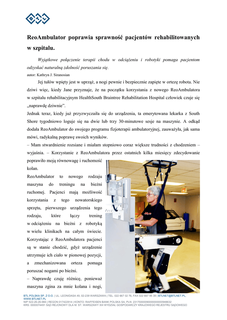 ReoAmbulator poprawia sprawność pacjentów rehabilitowanych w szpitalu. Wyjątkowe połączenie terapii chodu w odciążeniu i robotyki pomaga pacjentom odzyskać naturalną zdolność poruszania się. autor: Kathryn J. Siranosian Jej tułów wpięty jest w uprząż, a nogi pewnie i bezpiecznie zapięte w ortezę robota. Nie dziwi więc, kiedy Jane przyznaje, że na początku korzystania z nowego ReoAmbulatora w szpitalu rehabilitacyjnym HealthSouth Braintree Rehabilitation Hospital człowiek czuje się „naprawdę dziwnie”. Jednak teraz, kiedy już przyzwyczaiła się do urządzenia, ta emerytowana lekarka z South Shore tygodniowo loguje się na dwie lub trzy 30-minutowe sesje na maszynie. A odkąd dodała ReoAmbulator do swojego programu fizjoterapii ambulatoryjnej, zauważyła, jak sama mówi, radykalną poprawę swoich wyników. – Mam stwardnienie rozsiane i miałam stopniowo coraz większe trudności z chodzeniem – wyjaśnia. – Korzystanie z ReoAmbulatora przez ostatnich kilka miesięcy zdecydowanie poprawiło moją równowagę i ruchomość kolan. ReoAmbulator to maszyna treningu do nowego na rodzaju bieżni ruchomej. Pacjenci mają możliwość korzystania z tego nowatorskiego sprzętu, pierwszego urządzenia tego rodzaju, które łączy trening w odciążeniu na bieżni z robotyką w wielu klinikach na całym świecie. Korzystając z ReoAmbulatora pacjenci są w stanie chodzić, gdyż urządzenie utrzymuje ich ciało w pionowej pozycji, a zmechanizowana orteza pomaga poruszać nogami po bieżni. – Naprawdę czuję różnicę, ponieważ maszyna zgina za mnie kolana i nogi, BTL POLSKA SP. Z O.O. | UL. LEONIDASA 49, 02-239 WARSZAWA | TEL. 022 667 02 76, FAX 022 667 95 39 | [email protected], WWW.BTLNET.PL NIP 522-26-26-984 | REGON 017422914 | KONTO: RAIFFEISEN BANK POLSKA SA, PLN: 23175000090000000000948632 KRS: 0000074491 SĄD REJONOWY DLA M. ST. WARSZAWY XIII WYDZIAŁ GOSPODARCZY KRAJOWEGO REJESTRU SĄDOWEGO więc kiedy idę do domu, mój umysł pamięta jak powtarzać te ruchy – mówi Jane. – Wcześniej czułam się jakby tych obwodów mózgowych po prostu tam już nie było. Teraz jest znacznie lepiej. I jestem pewna, że jest tak dzięki tej maszynie. Jane jest oczywiście zadowolona z korzyści jakie odczuwa dzięki pracy z ReoAmbulatorem. – Czy ta maszyna pozwoli mi poczuć się znacznie pewniej, kiedy będę chodzić z pomocą potrzebnych mi urządzeń? Zdecydowanie tak. O ile trening na bieżni ruchomej w odciążeniu to nic nowego – proste urządzenia do trenowania chodu utrzymujące pacjenta w pozycji pionowej na bieżni są w użyciu od lat 80. XX w. – specjaliści stworzyli ReoAmbulator wprowadzając technologiczną innowację: skomputeryzowane i zautomatyzowane ortezy, które pomagają poruszać nogami. W przypadku starszych maszyn, terapeuci musieli ręcznie pomagać pacjentowi poruszać nogami na bieżni, a proces ten był czasochłonny, pracochłonny i męczący dla obu stron. Obecnie zaprogramować terapeuci w mogą komputerze ReoAmbulatora strategie treningowe stworzone indywidualnie dla każdego pacjenta. Elementy takie jak stopień podtrzymania, długość kroku i prędkość chodu można dostosowywać Dr med. Douglas Katz jest dyrektorem medycznym ds. programu urazów mózgu w szpitalu rehabilitacyjnym w miarę zmian w zakresie możliwości HealthSouth Braintree Rehabilitation Hospital oraz profesorem pacjenta. nadzwyczajnym neurologii na Wydziale Medycyny Boston Co więcej, dzięki temu, że ortezy University. robota wykonują pracę wspomagania ruchów nóg, pacjent może trenować symulację chodu przez kilka minut w każdej sesji. Towłaśnie powtarzalne, rytmiczne, indywidualnie określone kroczenie zdaje się być kluczem do poprawy czynności ruchowej. BTL POLSKA SP. Z O.O. | UL. LEONIDASA 49, 02-239 WARSZAWA | TEL. 022 667 02 76, FAX 022 667 95 39 | [email protected], WWW.BTLNET.PL NIP 522-26-26-984 | REGON 017422914 | KONTO: RAIFFEISEN BANK POLSKA SA, PLN: 23175000090000000000948632 KRS: 0000074491 SĄD REJONOWY DLA M. ST. WARSZAWY XIII WYDZIAŁ GOSPODARCZY KRAJOWEGO REJESTRU SĄDOWEGO – W ciągu ostatnich 20-30 lat coraz więcej dowiadywaliśmy się na temat tego w jaki sposób mózg zwykle zdobywa zdolności ruchowe i poznawcze i teraz wiemy już, że ośrodkowy układ nerwowy jest w stanie stale się zmieniać w ciągu całego życia człowieka. Ta neuroplastyczność to normalna zdolność uczenia się oraz normalna zdolność regeneracji mózgu po urazach – wyjaśnia neurolog, dr med. Douglas Katz, dyrektor medyczny programu ds. urazów mózgu w szpitalu rehabilitacyjnym HealthSouth Braintree Rehabilitation Hospital i profesor nadzwyczajny neurologii na Wydziale Medycyny Boston University. Ta regeneracja czy reorganizacja zależy zarówno od doświadczenia mózgu, jak i ćwiczenia odpowiednich czynności – mówi. ReoAmbulator zapewnia sposób na zapoznanie uszkodzonego układu nerwowego lub ciała z możliwie najbardziej naturalnymi ruchami, aby pacjent mógł ćwiczyć chodzenie tak normalnie jak to tylko możliwe. Te powtarzalne zdarzenia mogą sprawić, że układ nerwowy się dostosuje, skutecznie ucząc się czynności ruchowej na nowo. ReoAmbulator już okazał się cennym narzędziem w rehabilitacji wielu pacjentów hospitalizowanych w wyposażonym w 131 łóżek ośrodku w „ReoAmbulator zapewnia sposób na zapoznanie uszkodzonego układu nerwowego lub ciała z możliwie najbardziej naturalnymi ruchami, aby pacjent mógł ćwiczyć chodzenie tak normalnie jak to tylko możliwe. Te powtarzalne zdarzenia mogą sprawić, że układ nerwowy się dostosuje, skutecznie ucząc się czynności ruchowej na nowo.” Braintree. Pacjenci ze dr med. Douglas Katz Dyrektor medyczny programu ds. urazów mózgu HealthSouth Braintree Rehab stwardnieniem rozsianym, chorobą Parkinsona, po udarach, urazach mózgu lub rdzenia kręgowego i cierpiący na wiele innych zaburzeń neurologicznych mogą być kandydatami do rehabilitacji 