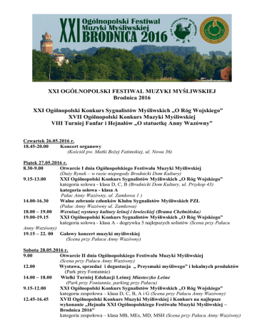 XXI OGÓLNOPOLSKI FESTIWAL MUZYKI MYŚLIWSKIEJ Brodnica 2016 XXI Ogólnopolski Konkurs Sygnalistów Myśliwskich „O Róg Wojskiego” XVII Ogólnopolski Konkurs Muzyki Myśliwskiej VIII Turniej Fanfar i Hejnałów „O statuetkę Anny Wazówny” Czwartek 26.05.2016 r. 18.45-20.00 Koncert organowy (Kościół pw. Matki Bożej Fatimskiej, ul. Nowa 36) Piątek 27.05.2016 r. 8.30-9.00 Otwarcie I dnia Ogólnopolskiego Festiwalu Muzyki Myśliwskiej (Duży Rynek – w razie niepogody Brodnicki Dom Kultury) 9.15-13.00 XXI Ogólnopolski Konkurs Sygnalistów Myśliwskich „O Róg Wojskiego” kategoria solowa - klasa D, C, B (Brodnicki Dom Kultury, ul. Przykop 43) kategoria solowa - klasa A Pałac Anny Wazówny, ul. Zamkowa 1 ) 14.00-16.30 Walne zebranie członków Klubu Sygnalistów Myśliwskich PZŁ (Pałac Anny Wazówny ul. Zamkowa) 18.00 – 19.00 Wernisaż wystawy kultury leśnej i łowieckiej (Brama Chełmińska) 19.00-19.15 XXI Ogólnopolski Konkurs Sygnalistów Myśliwskich „O Róg Wojskiego” kategoria solowa - klasa A - dogrywka 5 najlepszych solistów (Scena przy Pałacu Anny Wazówny) 19.15 – 22. 00 Galowy koncert muzyki myśliwskiej (Scena przy Pałacu Anny Wazówny) Sobota 28.05.2016 r. 9.00 Otwarcie II dnia Ogólnopolskiego Festiwalu Muzyki Myśliwskiej (Scena przy Pałacu Anny Wazówny) 12.00 Wystawa, sprzedaż i degustacja „ Przysmaki myśliwego” i lokalnych produktów (Park przy Fontannie) 14.00 – 18.00 Wielki Turniej Edukacji Leśnej Miasteczko Leśne (Park przy Fontannie, parking przy Pałacu) 9.15-12.00 XXI Ogólnopolski Konkurs Sygnalistów Myśliwskich „O Róg Wojskiego” kategoria zespołowa – klasa D, C, B, A i G (Scena przy Pałacu Anny Wazówny) 12.45-16.45 XVII Ogólnopolski Konkurs Muzyki Myśliwskiej i Konkurs na najlepsze wykonanie „Hejnału XXI Ogólnopolskiego Festiwalu Muzyki Myśliwskiej – Brodnica 2016” kategoria zespołowa – klasa MB, MEs, MD, MSH (Scena przy Pałacu Anny Wazówny) 16.45 -18.00 17. 00 18.05-18.20 18.20-20.00 20.00-21.10 21.10-22.00 22.00-23.00 III Przegląd Musztry Paradnej Zespołów Sygnalistów Myśliwskich wraz z Paradą Duży Rynek)oraz koncert Reprezentacyjnej Orkiestry Lasów Państwowych (Scena przy Pałacu Anny Wazówny) Wielka Patelnia (Dary lasu pieczone dziki) Przedzamcze) Podsumowanie konkursów edukacyjnych Galowy koncert laureatów konkursów i ogłoszenie wyników Koncert zespołu Krzysztofa Krawczyka Konkursy wiedzy leśnej na scenie Koncert zespołu Classic (Scena przy Pałacu Anny Wazówny) Niedziela 29.05.2016 r. 9.00-10.00 VIII Turniej Fanfar i Hejnałów (Wieża Zamkowa) 11.00-12.30 Msza św. Hubertowska Uroczyste zakończenie festiwalu wręczenie nagród w VIII Turnieju Fanfar i Hejnałów (Kościół pw. Matki Bożej Fatimskiej, ul. Nowa 36) Imprezy towarzyszące: Nocny spacer po Brodnicy – piątek 27. 05. 2016 r. godz. 23. 00 zbiórka przy Pałacu Anny Wazówny Spływ kajakowy – piątek 27. 05. 2016 r Zwiedzanie lasu z przewodnikiem piątek (27. 05. 2016 r.) lub niedziela (29. 05. 2016 r.) Konkurs wiedzy leśnej i łowieckiej ,,Las bez tajemnic’’ – (środa) 25. 05. 2016 r. Konkurs fotograficzny (Szkoły Ponadgimnazjalne) Konkurs krasomówczy pt. „Opowieści z mchu i paproci” ( Gimnazjum) Konkurs plastyczny pt. „Przyroda polska”(Szkoły Podstawowe w kat.kl. I – III i kl. IV - VI)