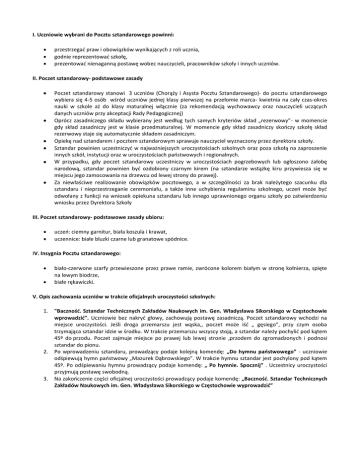 I. Uczniowie wybrani do Pocztu sztandarowego powinni: przestrzegad praw i obowiązków wynikających z roli ucznia, godnie reprezentowad szkołę, prezentowad nienaganną postawę wobec nauczycieli, pracowników szkoły i innych uczniów. II. Poczet sztandarowy- podstawowe zasady Poczet sztandarowy stanowi 3 uczniów (Chorąży i Asysta Pocztu Sztandarowego)- do pocztu sztandarowego wybiera się 4-5 osób wśród uczniów jednej klasy pierwszej na przełomie marca- kwietnia na cały czas-okres nauki w szkole aż do klasy maturalnej włącznie (za rekomendacją wychowawcy oraz nauczycieli uczących danych uczniów przy akceptacji Rady Pedagogicznej) Oprócz zasadniczego składu wybierany jest według tych samych kryteriów skład „rezerwowy”- w momencie gdy skład zasadniczy jest w klasie przedmaturalnej. W momencie gdy skład zasadniczy skooczy szkołę skład rezerwowy staje się automatycznie składem zasadniczym. Opiekę nad sztandarem i pocztem sztandarowym sprawuje nauczyciel wyznaczony przez dyrektora szkoły. Sztandar powinien uczestniczyd w najważniejszych uroczystościach szkolnych oraz poza szkołą na zaproszenie innych szkół, instytucji oraz w uroczystościach paostwowych i regionalnych. W przypadku, gdy poczet sztandarowy uczestniczy w uroczystościach pogrzebowych lub ogłoszono żałobę narodową, sztandar powinien byd ozdobiony czarnym kirem (na sztandarze wstążkę kiru przywiesza się w miejscu jego zamocowania na drzewcu od lewej strony do prawej). Za niewłaściwe realizowanie obowiązków pocztowego, a w szczególności za brak należytego szacunku dla sztandaru i nieprzestrzeganie ceremoniału, a także inne uchybienia regulaminu szkolnego, uczeo może byd odwołany z funkcji na wniosek opiekuna sztandaru lub innego uprawnionego organu szkoły po zatwierdzeniu wniosku przez Dyrektora Szkoły III. Poczet sztandarowy- podstawowe zasady ubioru: uczeo: ciemny garnitur, biała koszula i krawat, uczennice: białe bluzki czarne lub granatowe spódnice. IV. Insygnia Pocztu sztandarowego: biało-czerwone szarfy przewieszone przez prawe ramie, zwrócone kolorem białym w stronę kołnierza, spięte na lewym biodrze, białe rękawiczki. V. Opis zachowania uczniów w trakcie oficjalnych uroczystości szkolnych: 1. 2. 3. "Bacznośd. Sztandar Technicznych Zakładów Naukowych im. Gen. Władysława Sikorskiego w Częstochowie wprowadzid". Uczniowie bez nakryd głowy, zachowują postawę zasadniczą. Poczet sztandarowy wchodzi na miejsce uroczystości. Jeśli droga przemarszu jest wąska,, poczet może iśd „ gęsiego”, przy czym osoba trzymająca sztandar idzie w środku. W trakcie przemarszu wszyscy stoją, a sztandar należy pochylid pod kątem 45º do przodu. Poczet zajmuje miejsce po prawej lub lewej stronie ,przodem do zgromadzonych i podnosi sztandar do pionu. Po wprowadzeniu sztandaru, prowadzący podaje kolejną komendę: „Do hymnu paostwowego” - uczniowie odśpiewują hymn paostwowy „Mazurek Dąbrowskiego”. W trakcie hymnu sztandar jest pochylony pod kątem 45º. Po odśpiewaniu hymnu prowadzący podaje komendę: „ Po hymnie. Spocznij” . Uczestnicy uroczystości przyjmują postawę swobodną. Na zakooczenie części oficjalnej uroczystości prowadzący podaje komendę: „Bacznośd. Sztandar Technicznych Zakładów Naukowych im. Gen. Władysława Sikorskiego w Częstochowie wyprowadzid” VI. Postawy przy Poczcie Sztandarowym Postawa zasadnicza- Sztandar postawiony na trzewiku drzewca przy prawej nodze na wysokości czubka buta. Drzewce podtrzymywane prawą ręką powyżej pasa, łokied prawej ręki lekko przyciśnięty do ciała. Lewa ręka w postawie zasadniczej. Po komendach: "Poczet stój" (po marszu). Po komendzie: "Bacznośd" (podawanej przez prowadzącego uroczystośd). Postawa "spocznij" Sztandar trzymany przy prawej nodze, jak w postawie zasadniczej. Chorąży i asysta pozostają w postawie spocznij - ciężar ciała przenoszą na prawą nogę przy jednoczesnym wysunięciu pięty lewej stopy na wysokośd środka prawej, przy jednoczesnym skręcie lewej o 45 stopni w lewą stronę. Po komendzie: "Spocznij" (podawanej przez chorążego po zatrzymaniu pocztu) następuje tu automatycznie wyrównanie linii i odległości. Po komendach: "Po ślubowaniu", "Po hymnie". Postawa "na ramię sztandar" Chorąży przesuwa prawą rękę po drzewcu na wysokośd prawego barku, przy jednoczesnym położeniu lewej na drzewcu na wysokości pasa. Po przebrzmieniu zapowiedzi komendy: "sztandar" energicznym ruchem przenosi drzewce sztandaru na prawy bark, zatrzymując go w pochyleniu 45 stopni. Płachta sztandaru musi byd oddalona od barku przynajmniej na szerokośd dłoni. Automatycznie po komendzie "Sztandar wprowadzid" lub "Poczet sztandarowy - Wystąp" Postawa "prezentuj sztandar" Z postawy zasadniczej chorąży kładzie lewą rękę na drzewcu sztandaru poniżej kooca zaczepu płachty, przy jednoczesnym maksymalnym opuszczeniu prawej po drzewcu. Po przebrzmieniu komendy "prezentuj sztandar" wykonuje salutowanie sztandarem. Po komendzie prowadzącego "Na prawo/lewo patrz" Po komendzie chorążego pocztu "Bacznośd", w czasie czytania ewangelii, Podniesienia Hostii, Przeistoczenia, Błogosławieostwa Najświętszym Sakramentem, śpiewu hymnu kościelnego, roty, ogłoszenia minuty ciszy, składania trumny do grobu, podczas składania wieoców, śpiewu hymnu organizacji, na uroczystośd, której poczet został zaproszony, jeżeli wcześniej prowadzący nie podał odpowiednich komend oraz przed Najświętszym Sakramentem w czasie uroczystego wejścia do świątyni. Salutowanie sztandarem w miejscu- Wykonuje się z postawy prezentuj. Chorąży robi zwrot w prawo skos, przy jednoczesnym wysunięciu lewej nogi w przód na odległośd jednej stopy i pochyleniu sztandaru w przód do kąta 45 stopni. Ręka lewa pozostaje co najmniej w odległości dłoni od płachty sztandaru. Po komendach i w sytuacjach jak w rubryce powyżej oraz samoczynnie, gdy odbierający honor