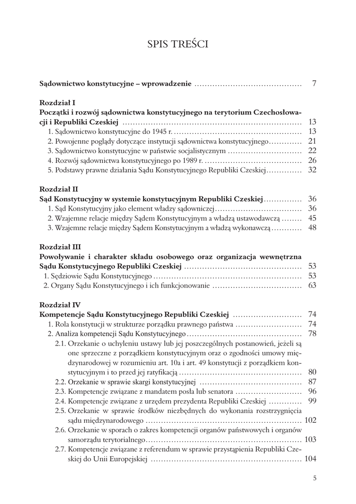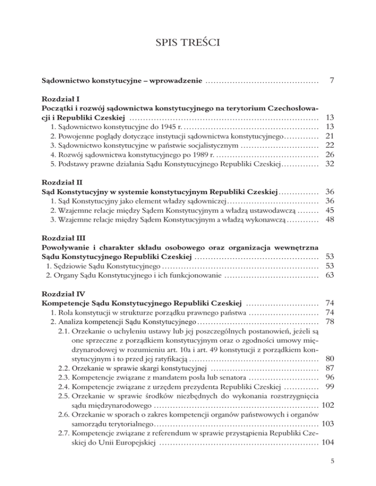 SPIS TREŚCI Sądownictwo konstytucyjne – wprowadzenie ....................................... ... 7 Rozdział I Początki i rozwój sądownictwa konstytucyjnego na terytorium Czechosłowacji i Republiki Czeskiej ...................................................................... 1. Sądownictwo konstytucyjne do 1945 r. . . . . . . . .. .. .. .. .. .. .. .. .. .. .. .. .. .. .. .. .. .. .. .. ... 2. Powojenne poglądy dotyczące instytucji sądownictwa konstytucyjnego . . . . . . . . . . . . . 3. Sądownictwo konstytucyjne w państwie socjalistycznym . . . . . . . . .. . . . . . . . . . . . . . . . . . . . 4. Rozwój sądownictwa konstytucyjnego po 1989 r. . . . . . . . . . . . . . . . . . .. . . . . . . . . . . . . . . . . . . . 5. Podstawy prawne działania Sądu Konstytucyjnego Republiki Czeskiej . . . . . . . . . . . . . . 13 13 21 22 26 32 Rozdział II Sąd Konstytucyjny w systemie konstytucyjnym Republiki Czeskiej ............... 1. Sąd Konstytucyjny jako element władzy sądowniczej . . . . . . . . . . . . . .. . . . . . . . . . . . . . . . . . . . 2. Wzajemne relacje między Sądem Konstytucyjnym a władzą ustawodawczą . . . . . . . . 3. Wzajemne relacje między Sądem Konstytucyjnym a władzą wykonawczą . . . . . . . . . . . . 36 36 45 48 Rozdział III Powoływanie i charakter składu osobowego oraz organizacja wewnętrzna Sądu Konstytucyjnego Republiki Czeskiej .............................................. 53 1. Sędziowie Sądu Konstytucyjnego . . . . . . . . . . . . . . . . . . . . . . . . . .. . . . . . . . . . . . . . . . . . . . . .. . . . . . . . . . 53 2. Organy Sądu Konstytucyjnego i ich funkcjonowanie . . . . . . . . . . . . . . . . . . . . . . . . . . . . . . . .. . . 63 Rozdział IV Kompetencje Sądu Konstytucyjnego Republiki Czeskiej ........................... 1. Rola konstytucji w strukturze porządku prawnego państwa . . . . . .. . . . . . . . . . . . . . . . . . . . 2. Analiza kompetencji Sądu Konstytucyjnego ............................................. 2.1. Orzekanie o uchyleniu ustawy lub jej poszczególnych postanowień, jeżeli są one sprzeczne z porządkiem konstytucyjnym oraz o zgodności umowy międzynarodowej w rozumieniu art. 10a i art. 49 konstytucji z porządkiem konstytucyjnym i to przed jej ratyfikacją . . . . . .. .. .. .. .. .. .. .. .. .. .. .. .. .. .. .. .. .. .. .. .. . 2.2. Orzekanie w sprawie skargi konstytucyjnej ........................................ 2.3. Kompetencje związane z mandatem posła lub senatora . . . . . .. . . . . . . . . . . . . . . . . . . . 2.4. Kompetencje związane z urzędem prezydenta Republiki Czeskiej . . . . . . . . . . . . . 2.5. Orzekanie w sprawie środków niezbędnych do wykonania rozstrzygnięcia sądu międzynarodowego . . . . . . . . . . . . . . . . . . .. .. .. .. .. .. .. .. .. .. .. .. .. .. .. .. .. .. .. .. .. . 2.6. Orzekanie w sporach o zakres kompetencji organów państwowych i organów samorządu terytorialnego . . . . . . . . . . . . . . . . . . .. .. .. .. .. .. .. .. .. .. .. .. .. .. .. .. .. .. .. .. .. . 2.7. Kompetencje związane z referendum w sprawie przystąpienia Republiki Czeskiej do Unii Europejskiej . . . . . . . . . . . . . . . . .. .. .. .. .. .. .. .. .. .. .. .. .. .. .. .. .. .. .. .. .. . 74 74 78 80 87 96 99 102 103 104 5 Rozdział V Postępowanie przed Sądem Konstytucyjnym Republiki Czeskiej ................. 1. Zasady ogólne dla wszystkich typów postępowań . . . . . . . . . . . . . . . . . .. . . . . . . . . . . . . . . . . . . . 1.1. Wszczęcie postępowania . . . . . . . . .. . . . . . . . . . . . . . . . . . . . . . . . . . . . . . . . . . . . . . .. . . . . . . . . . . . . . 1.2. Wstępna ocena wniosku . . . . . . . . .. . . . . . . . . . . . . . . . . . . . . . . . . . . . . . . . . . . . . . .. . . . . . . . . . . . . . 1.3. Rozprawa przed Sądem Konstytucyjnym . . . . . . . . . . . . . . . . . . . . . . . . . . . . . . . .. . . . . . . . . . . 1.4. Narada i głosowanie . . . . . . . . . . . . . . . . . . . . . . . .. .. .. .. .. .. .. .. .. .. .. .. .... .. .. .. .. .. .. .. .. 1.5. Orzeczenie i jego publikacja . . . .. . . . . . . . . . . . . . . . . . . . . . . . . . . . . . . . . . . . . . .. . . . . . .. . . . . . . 2. Kompetencje szczególne Sądu Konstytucyjnego związane z kwestiami odrębnymi dla poszczególnych typów postępowań . . . . . . . . . .. . . . . . . . . . . . . . . . . . . . . . . . . . . . . . . . . . . . . . .. 2.1. Postępowanie w sprawie uchylenia ustaw i innych przepisów prawnych . . . . . . . 2.2. Postępowanie w sprawach skarg konstytucyjnych . . . . . . . . . . . . .. . . . . . . . . . . . . . . . . . . . 2.3. Postępowanie w sprawach środków odwoławczych przeciwko rozstrzygnięciu w sprawie stwierdzenia ważności wyboru posła lub senatora . . . . . . . . . . . . . . . . . . . 2.4. Postępowanie w sprawie wątpliwości, co do utraty wybieralności oraz o niepołączalności wykonywania funkcji posła lub senatora w myśl art. 25 konstytucji .. . . . . . . . . . . . . . . . . . . . . . . . . . . . .. . . . . . . . . . . . . . . . . . . .. .. . . . . . . . . . . . . . . . . . . . . . . . . . . . . . . . . . . . 2.5. Postępowanie w sprawie konstytucyjnego oskarżenia prezydenta Republiki . . . 2.6. Postępowanie na wniosek prezydenta Republiki w sprawie uchylenia uchwały Izby poselskiej i Senatu, w myśl art. 66 konstytucji . . . . . . . . . . . . . . . . . . .. . . . . . . . . . . . 2.7. Postępowanie w sprawie środków niezbędnych dla wykonania rozstrzygnięcia sądu międzynarodowego . . . . . . . . . . . . . . . . . . .. .. .. .. .. .. .. .. .. .. .. .. .. .. .. .. .. .. .. .. .. . 2.8. Postępowanie w sporach o zakres kompetencji organów państwowych i organów samorządu terytorialnego . . . . . . . . . . . . .. .. .. .. .. .. .. .. .. .. .. .. .. .. .. .. .. .. .. .. .. . 2.9. Postępowania związane z referendum w sprawie przystąpienia Republiki Czeskiej do Unii Europejskiej . . . . . . . . . . . .